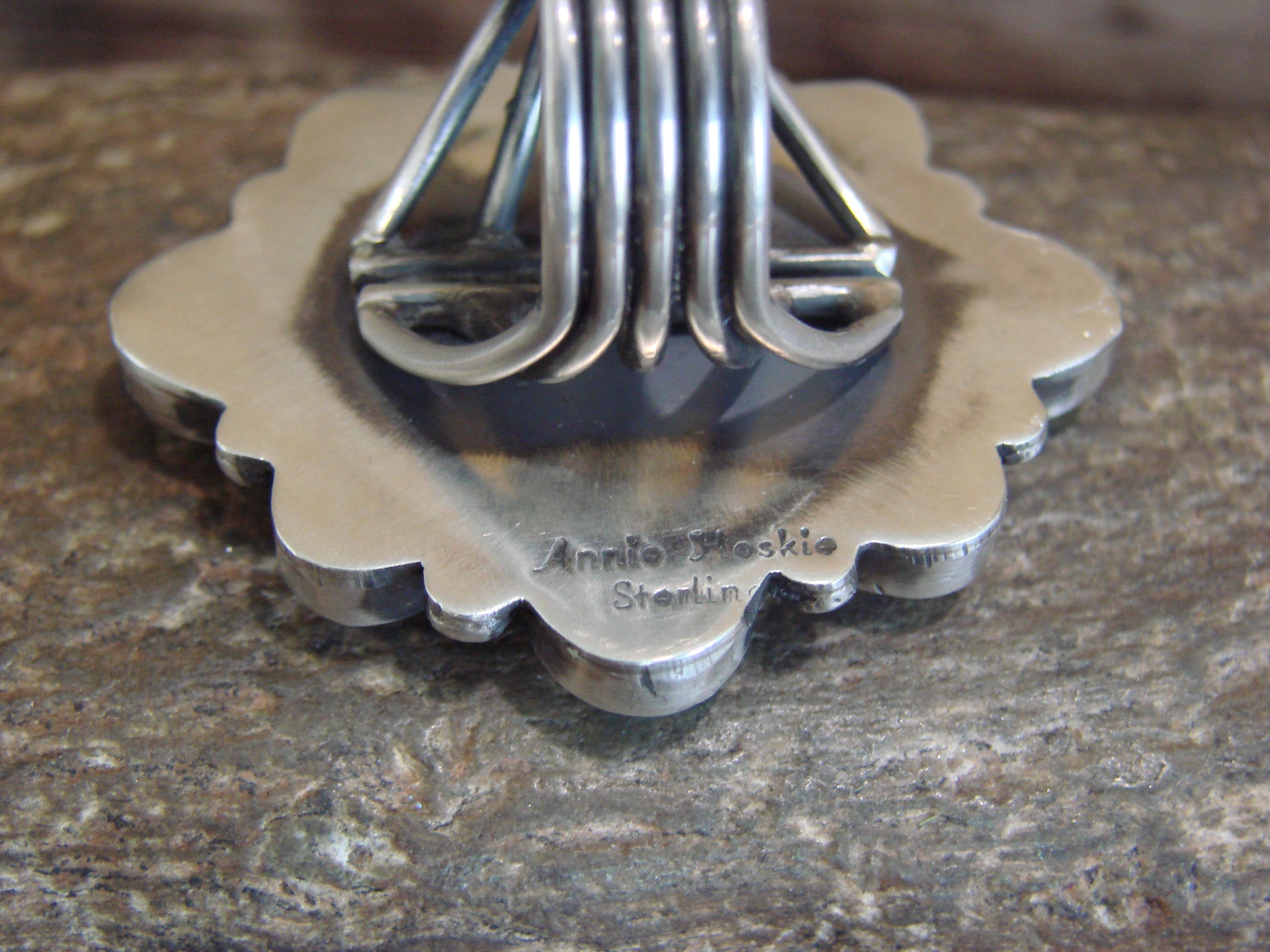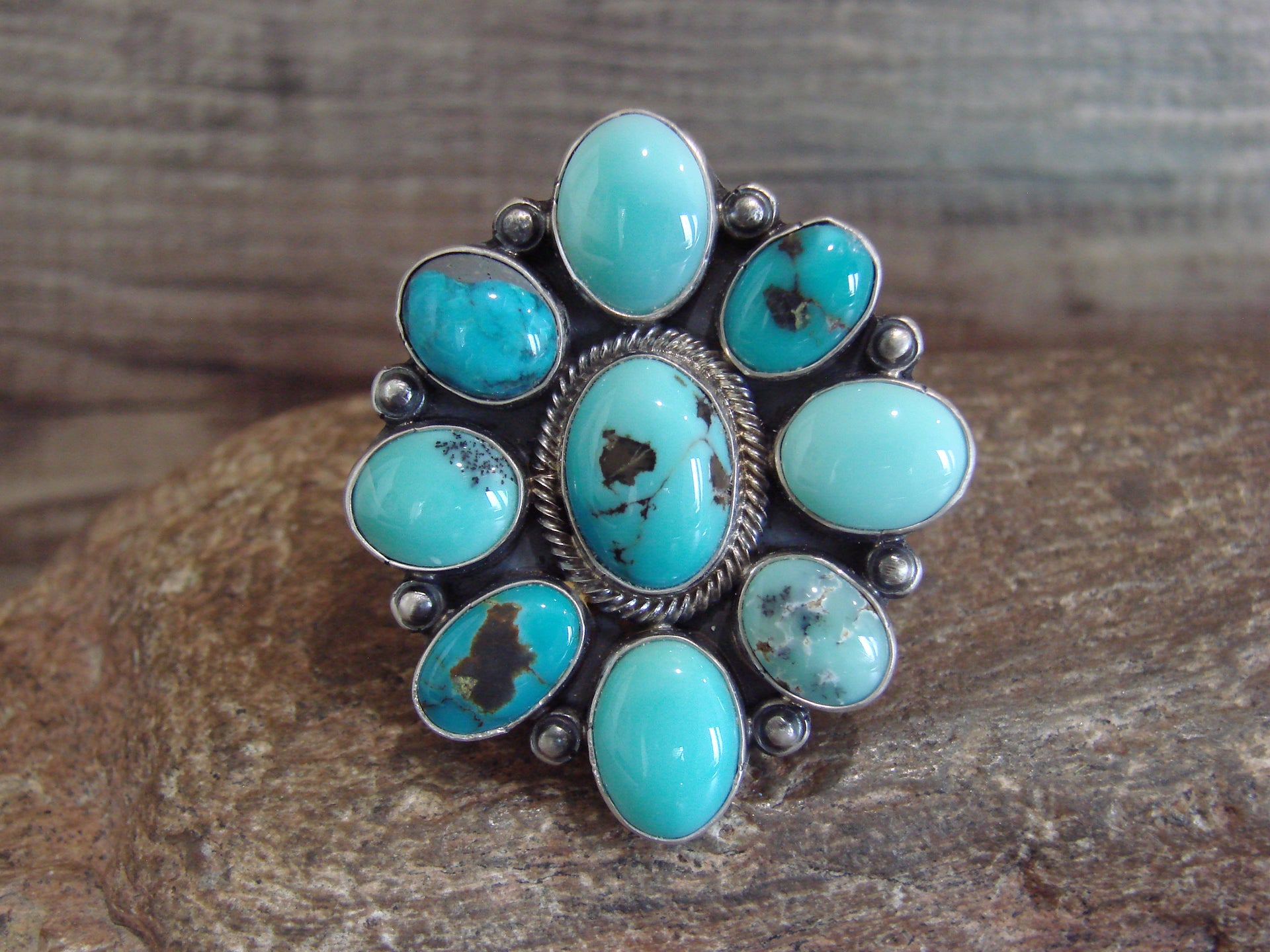 Genuine Native American Navajo Indian Sterling Silver & Turquoise Cluster Ring from Western New Mexico. This Gorgeous ring features Genuine Turquoise stones set into Smooth Sterling Silver bezel settings. Surrounding the stones are beautiful details in Sterling Silver. The stones are polished and have a Stunning look! Masterfully Handmade by Navajo Silversmith Annie Hoskie. Signed "Annie Hoskie" and "Sterling" on the back. Free gift box and shipping included!