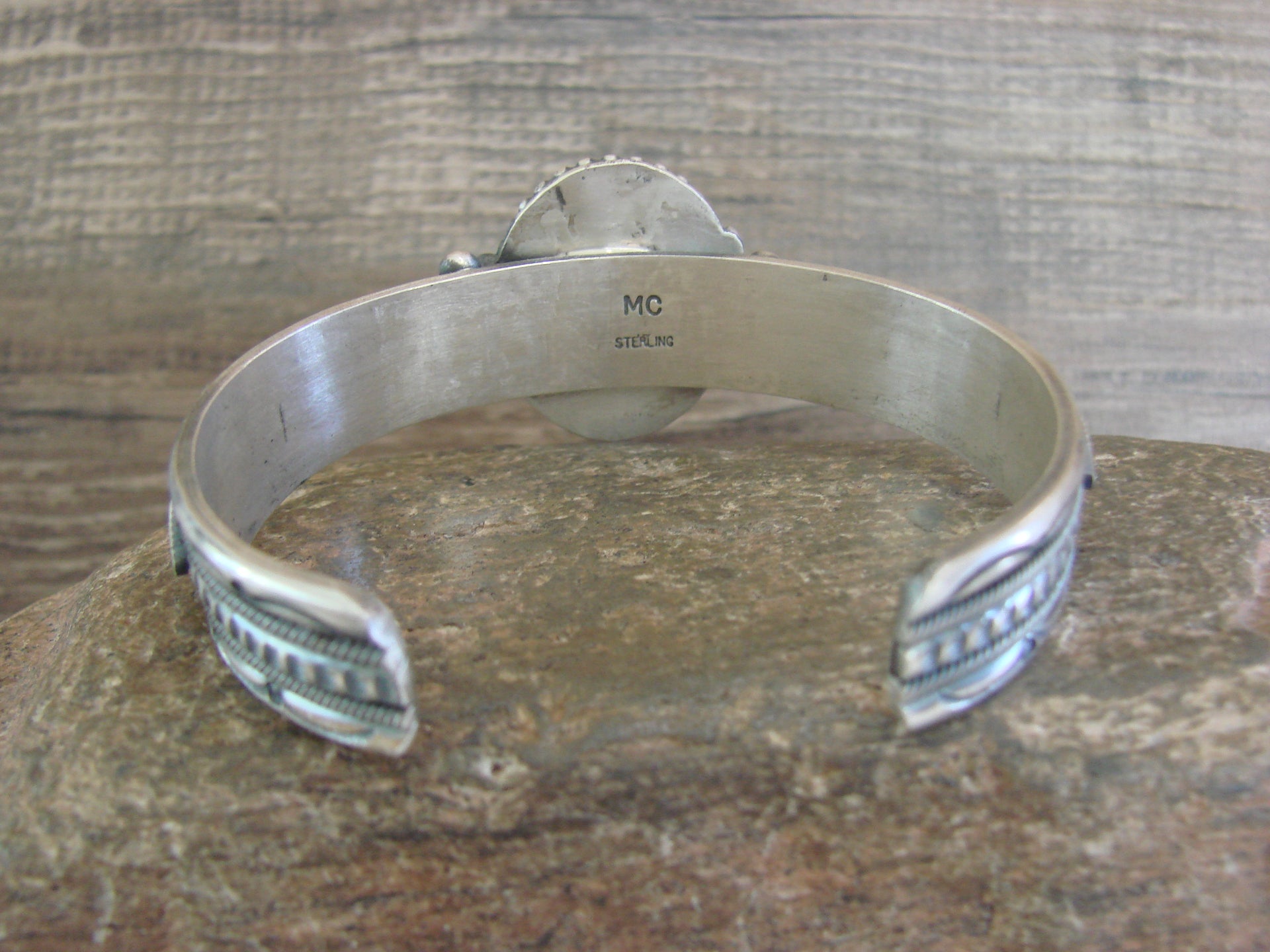 Genuine Native American Navajo Indian Sterling Silver & Turquoise Arrow Bracelet from Western New Mexico. This Stunning bracelet features a beautiful high quality Turquoise stone intricately set into a smooth Sterling Silver bezel setting. Sterling Silver Details and Hand Stamping surround the stone. Fine Navajo Silversmith workmanship quality makes this bracelet a beautiful hand made masterpiece! Navajo Indian handmade by Michael Calladitto. Signed "MC" and Stamped "Sterling" on the back. Free gift box and shipping included!