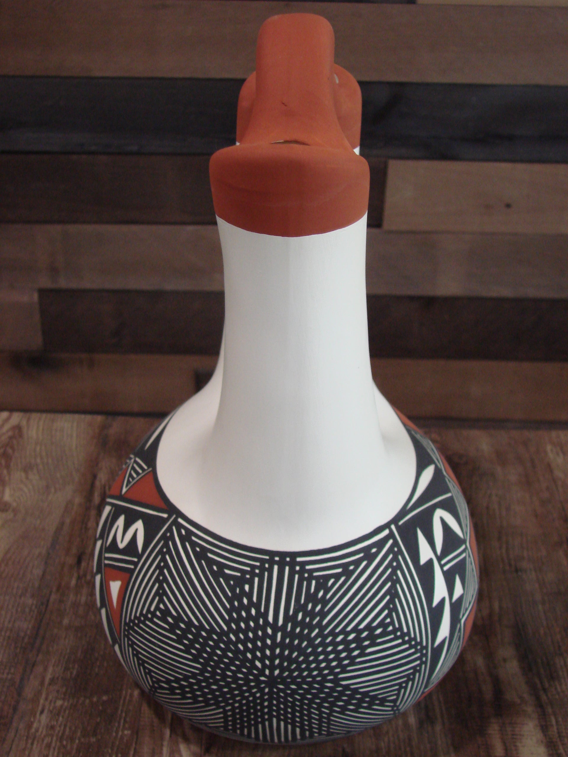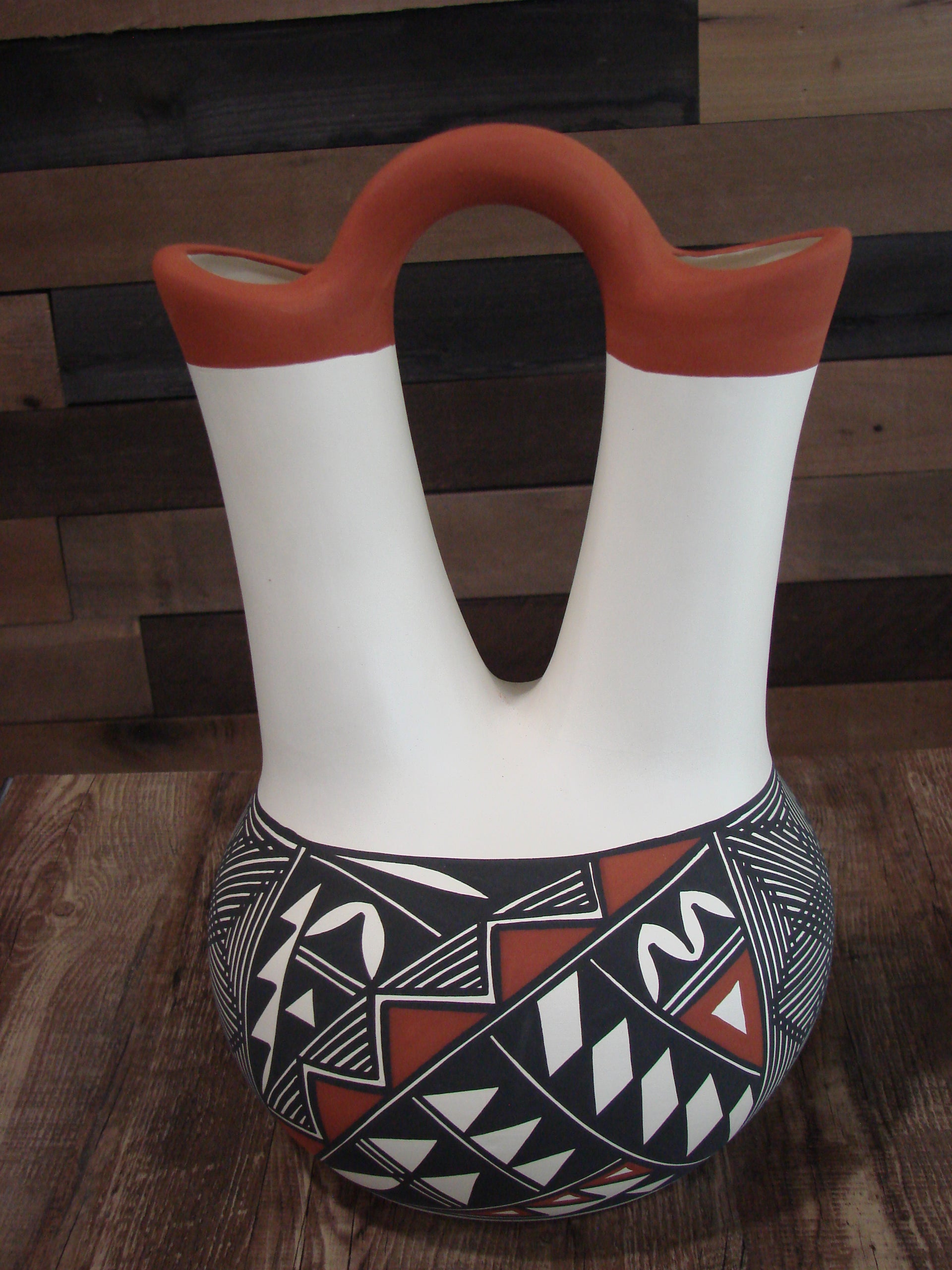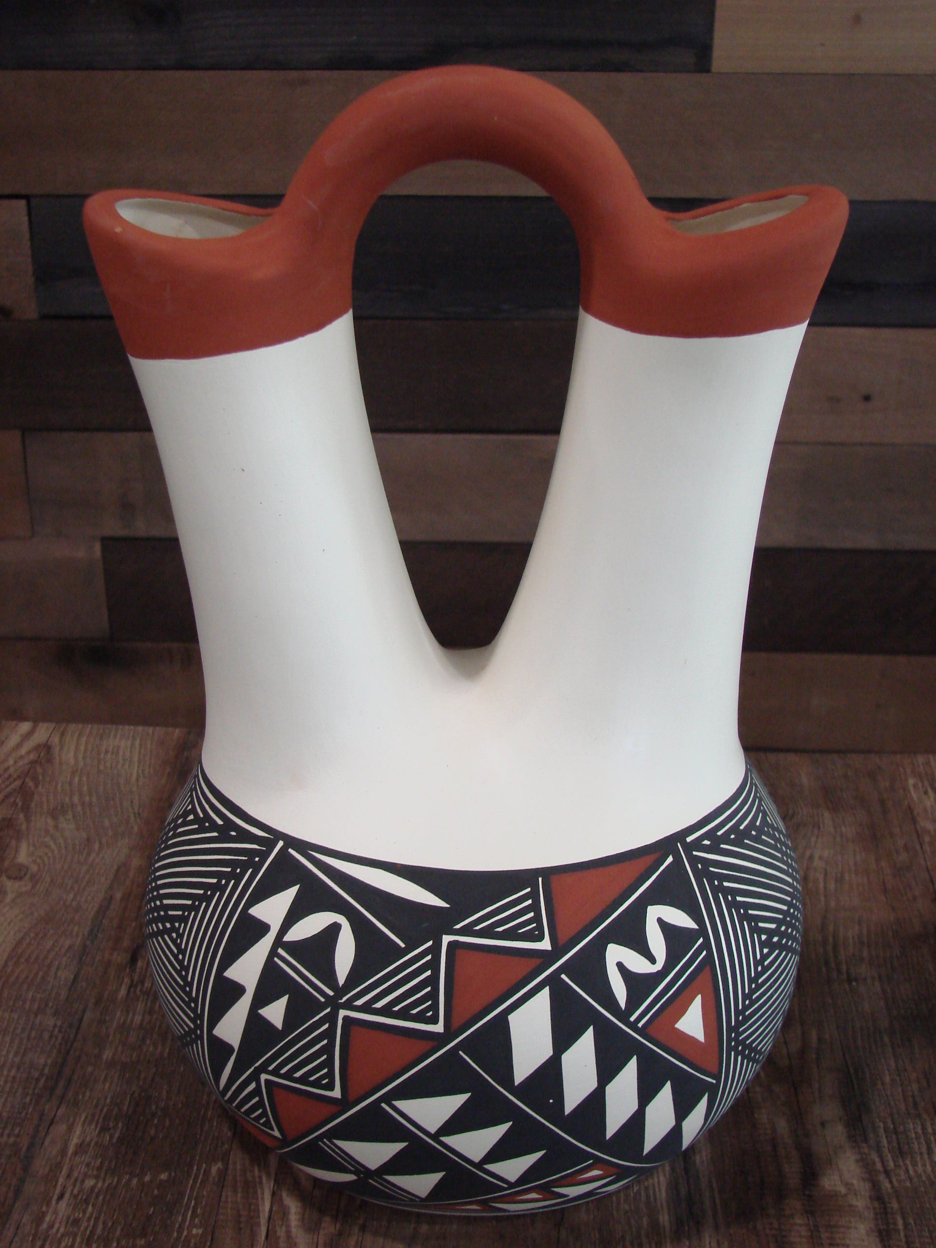 Genuine Native American Acoma Pueblo Indian Hand Painted Fine Line Wedding Vase Pottery from Western New Mexico. This Gorgeous piece of pottery features Stunning natural pigment hand painted patterns throughout. The detail is exquisite! Masterfully Hand painted by Acoma artist N. Victorino. The bottom is signed "N. Victorino Acoma N.M.". Free Shipping included!