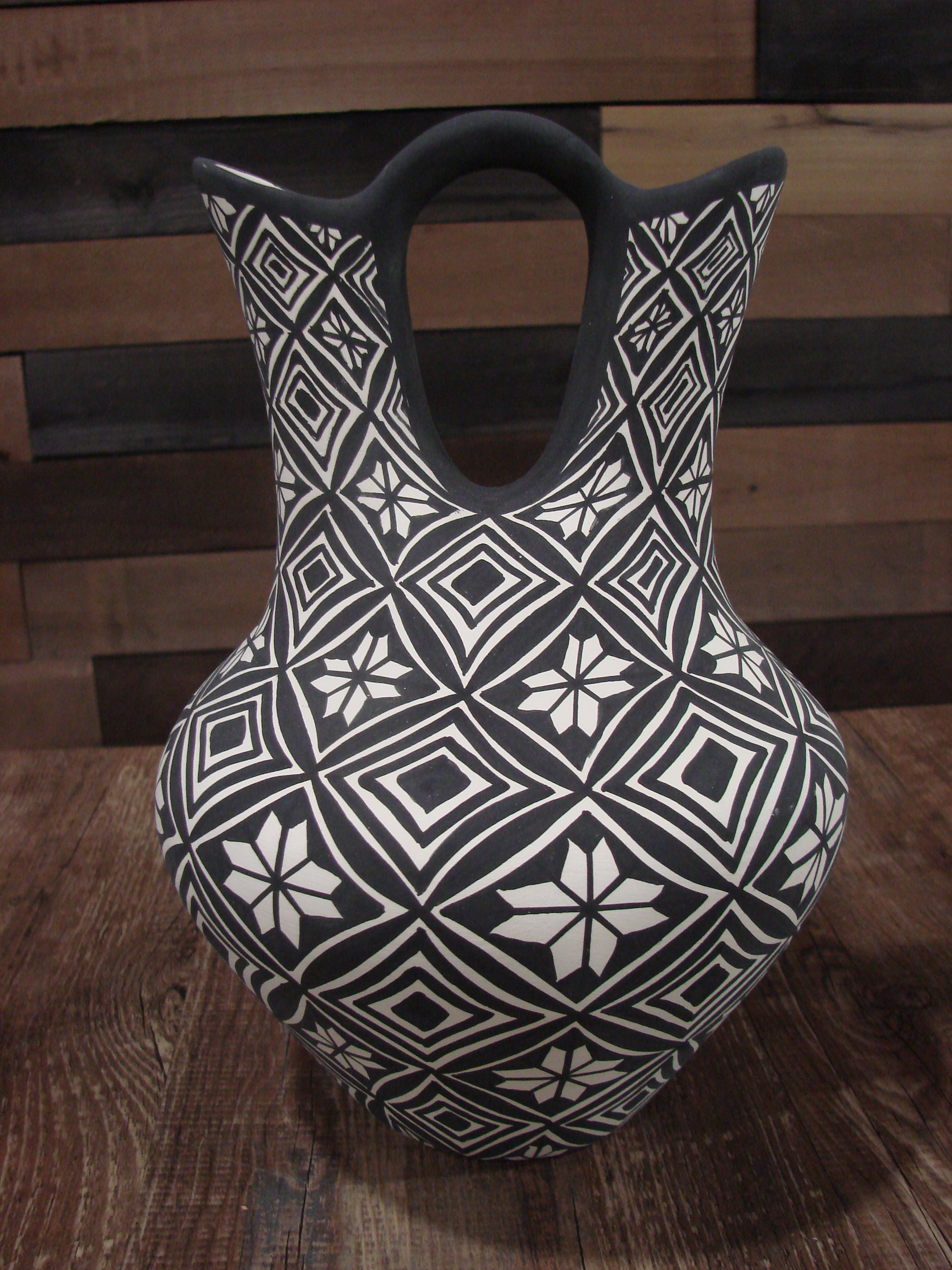 Genuine Native American Acoma/Zuni Pueblo Indian Hand Painted Fine Line Wedding Vase from Western New Mexico. This Gorgeous piece of ceremonial pottery features Stunning natural pigment hand painted patterns throughout. It Symbolizes Two becoming One. The detail is exquisite! Masterfully Hand painted by Acoma/Zuni artist M. Lukee. The bottom is signed "M Lukee Acoma/Zuni N.M". Free Shipping included!