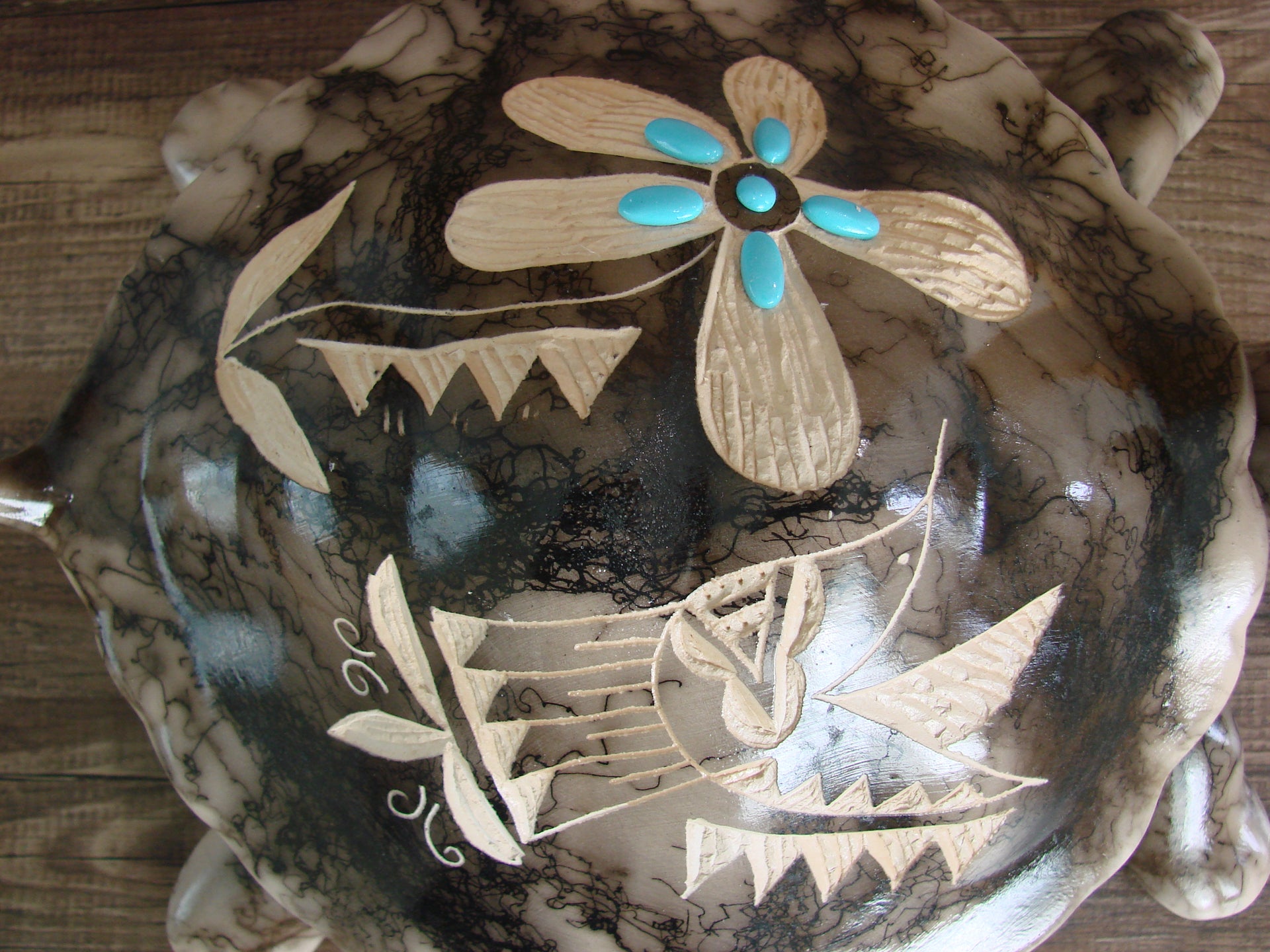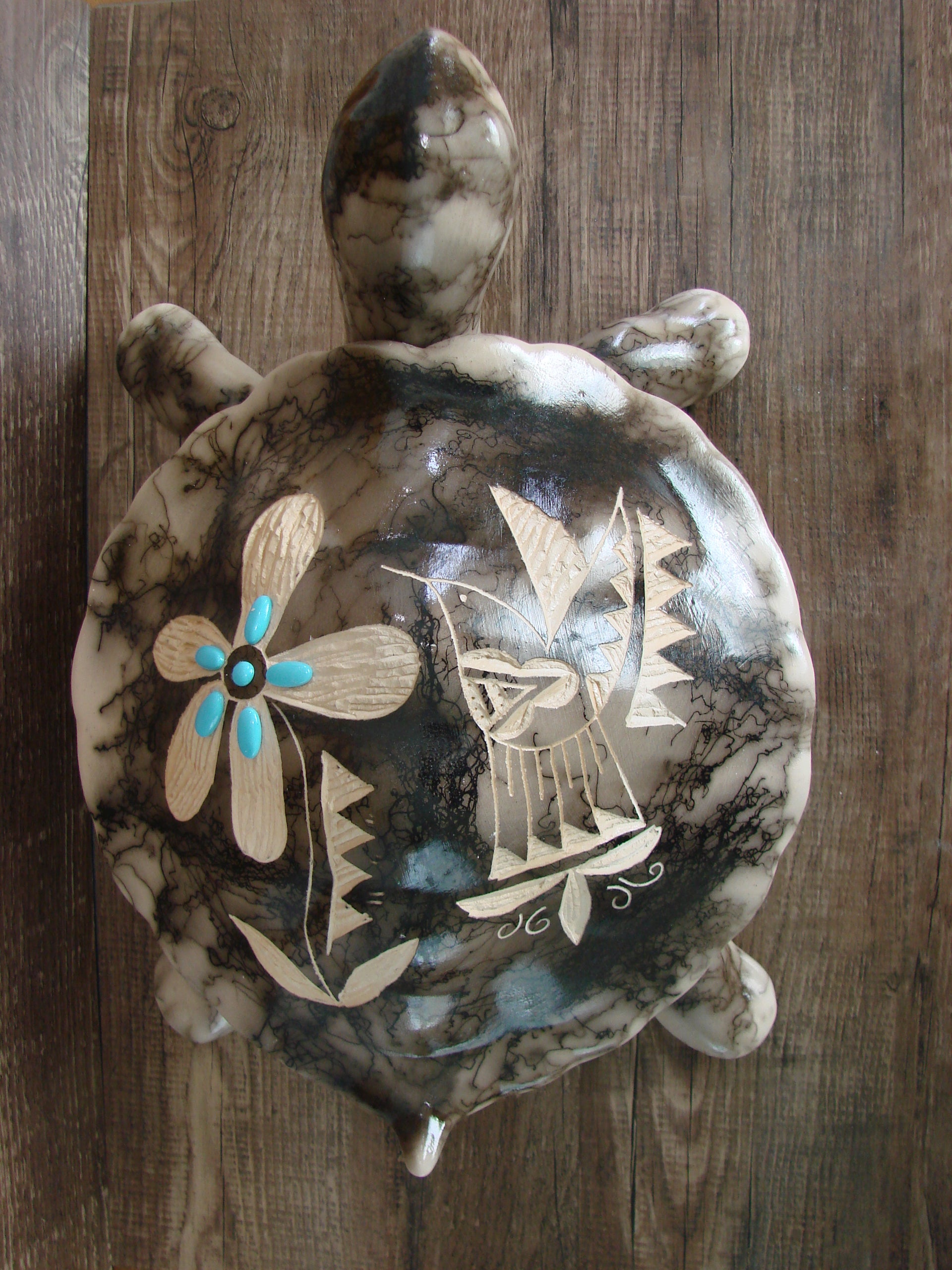 Native American Navajo Indian Horse Hair & Turquoise Turtle Sculpture from Western New Mexico. This Gorgeous piece of Pottery features beautiful horse hair and hand etching throughout. The Horse hair is laid over this piece during firing, the result is a beautiful one of a kind look! Hand etched by Navajo artist M. Vail. Signed. Free Shipping included!