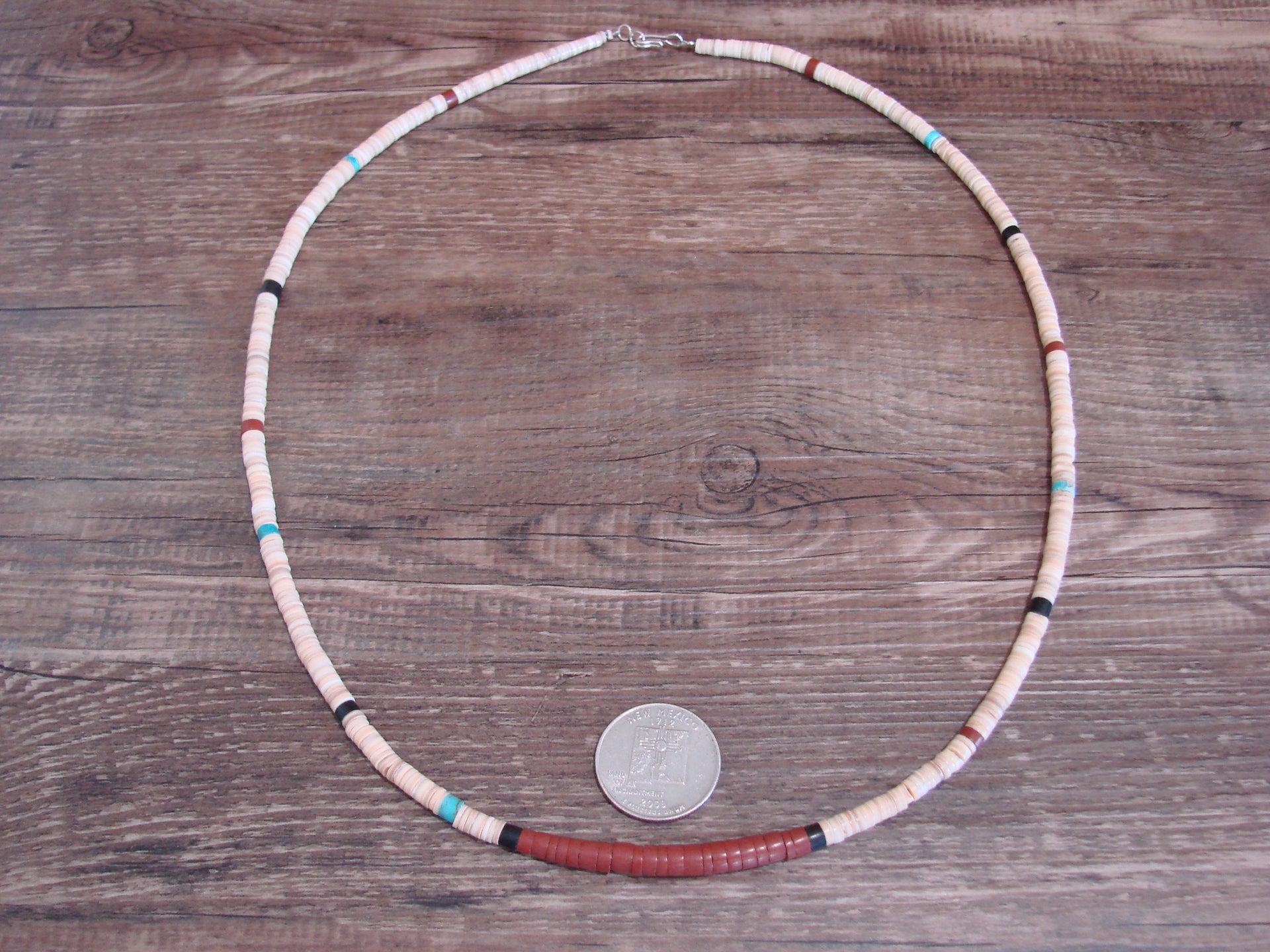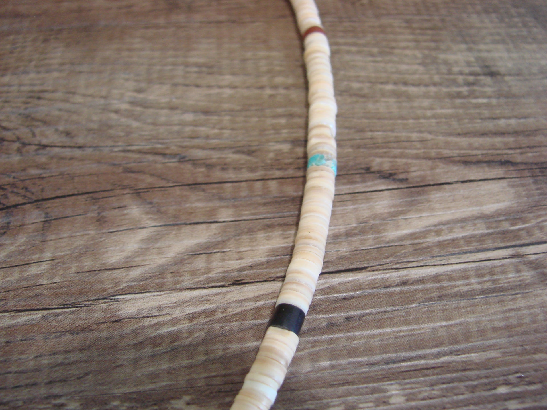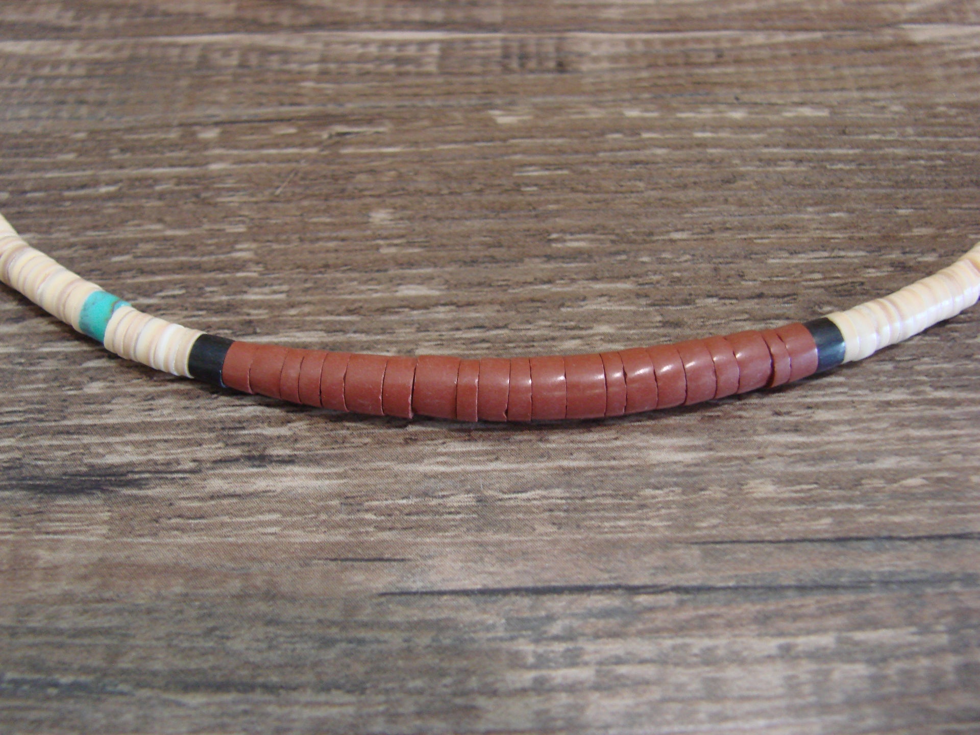 Genuine Native American Santo Domingo Indian Turquoise Necklace from Western New Mexico. This Stunning necklace features polished Turquoise and a variety of Heishi Stone Beads throughout. The beads measure 3/16" - 1/4" diameter and are center drilled. This necklace is hand strung and topped with a silver hook and eye clasp. This is a great looking necklace! Free shipping and gift box included! Handmade by Santo Domingo Beader, Torevia Crespin.