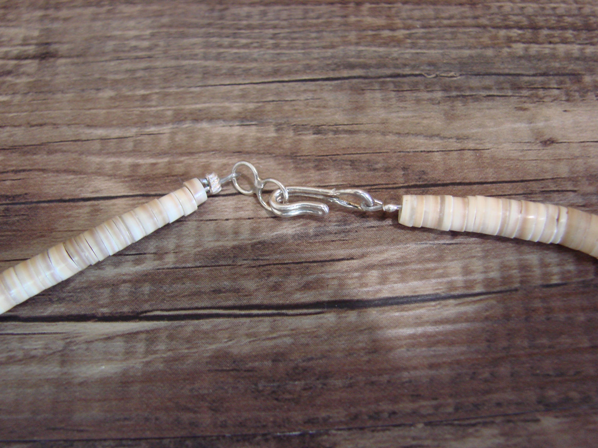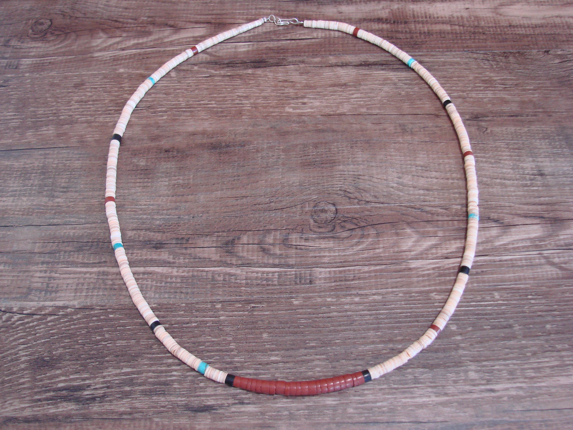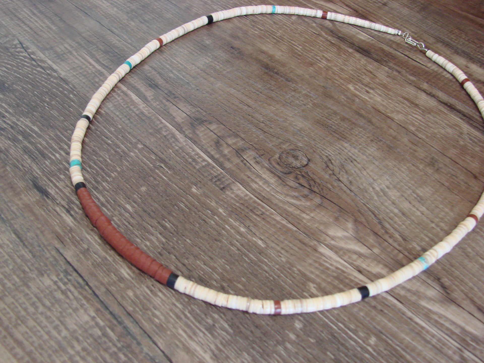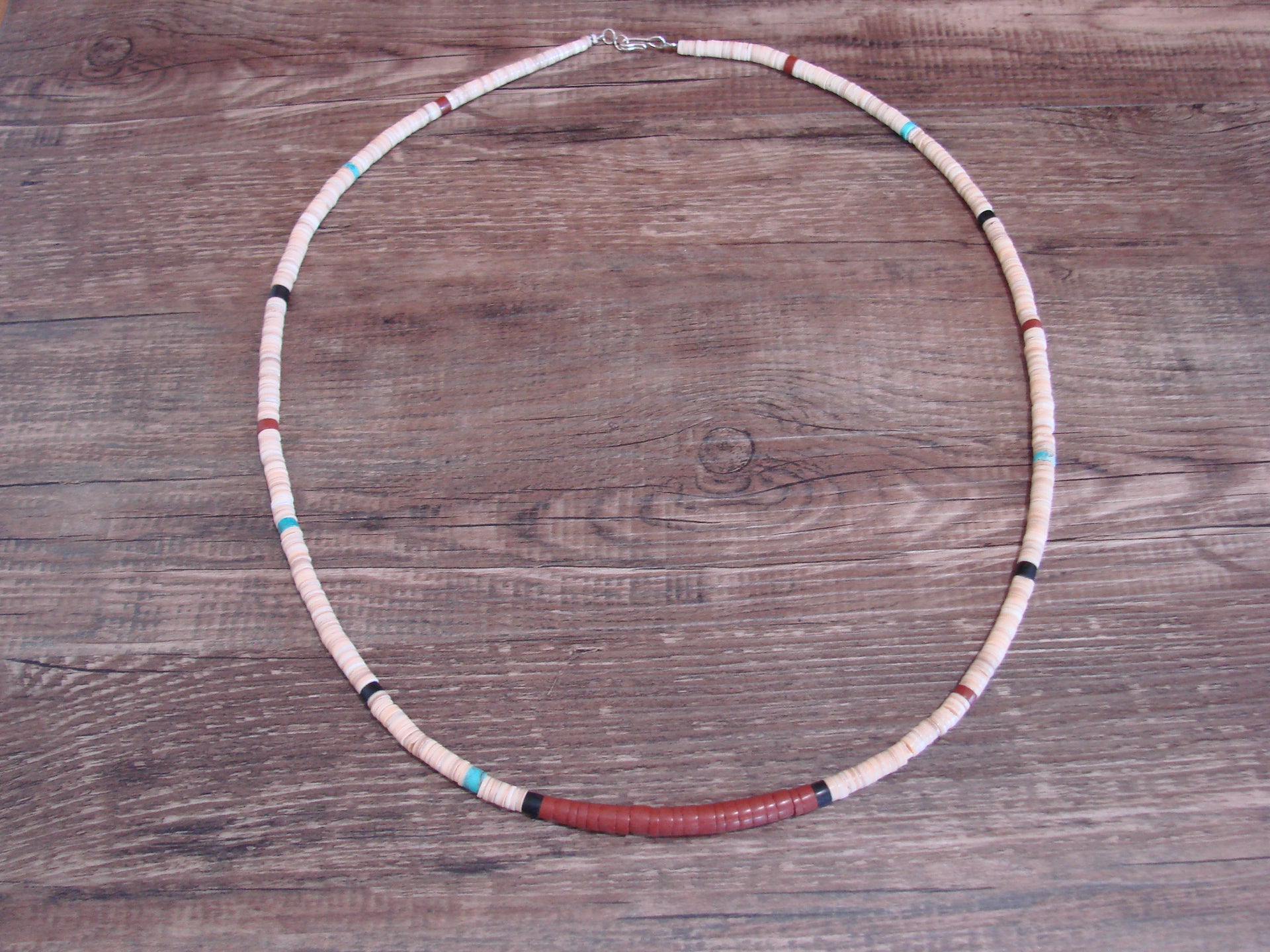 Genuine Native American Santo Domingo Indian Turquoise Necklace from Western New Mexico. This Stunning necklace features polished Turquoise and a variety of Heishi Stone Beads throughout. The beads measure 3/16" - 1/4" diameter and are center drilled. This necklace is hand strung and topped with a silver hook and eye clasp. This is a great looking necklace! Free shipping and gift box included! Handmade by Santo Domingo Beader, Torevia Crespin.