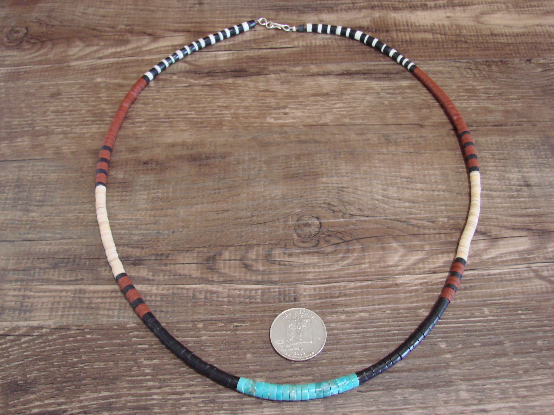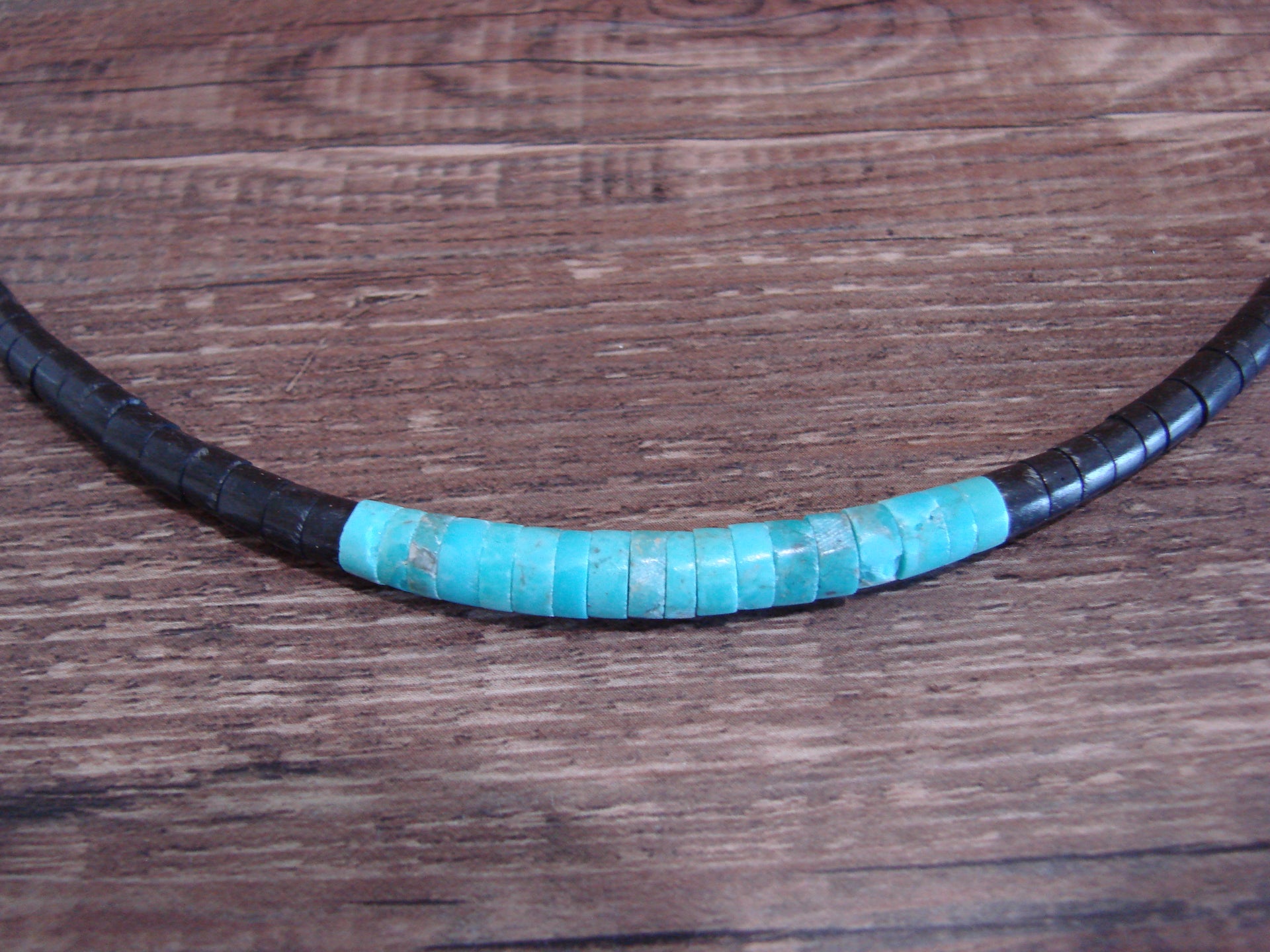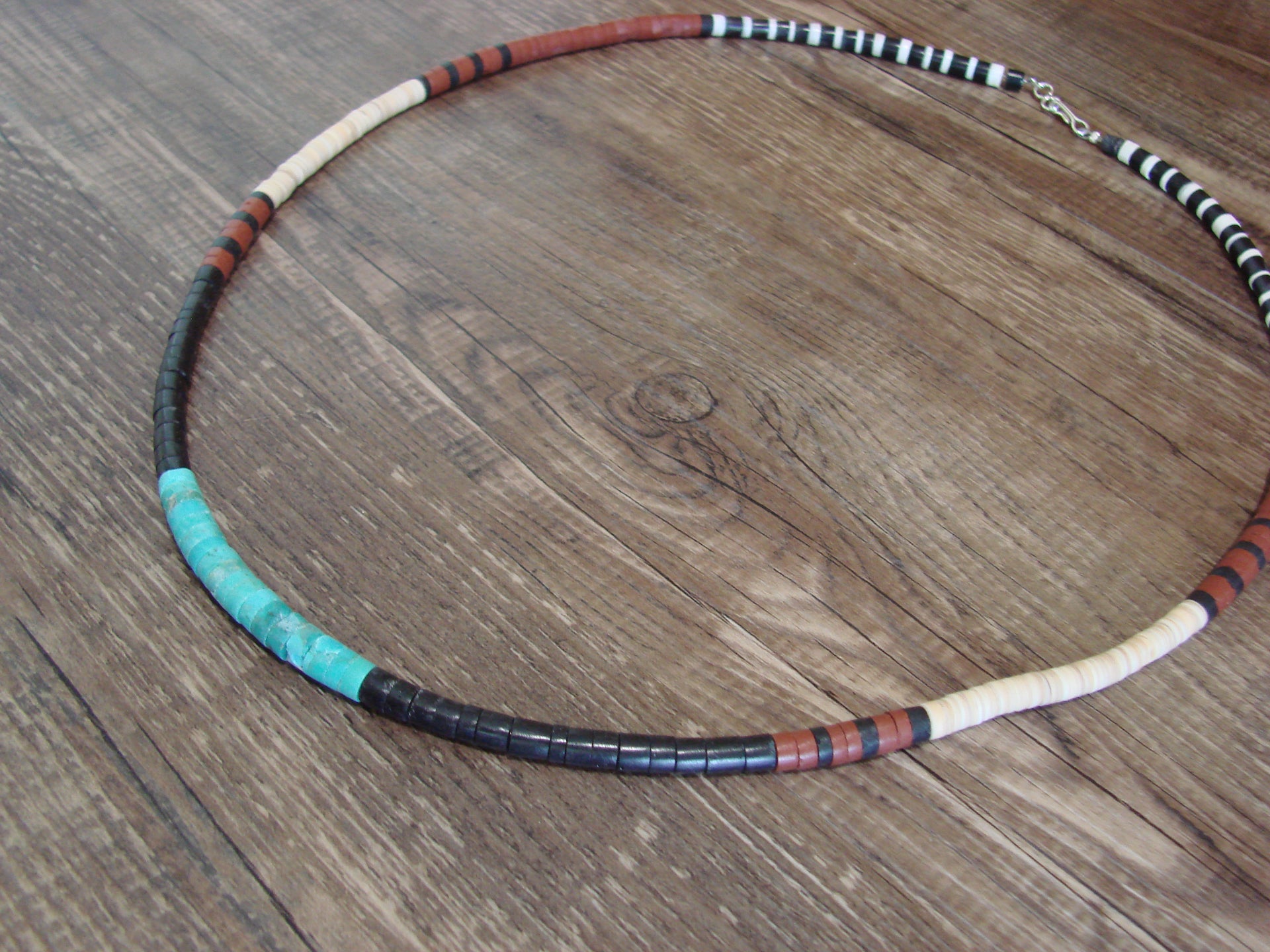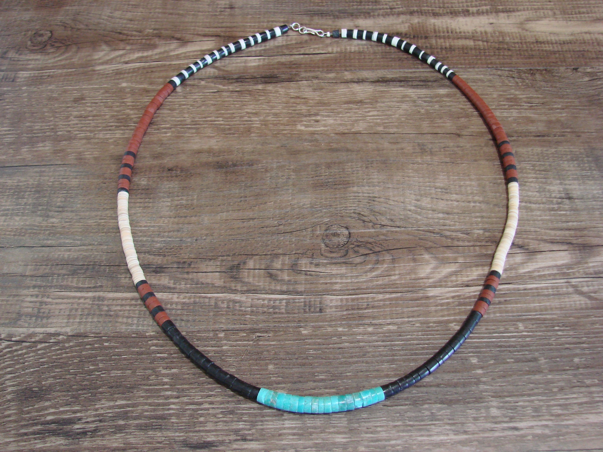 Genuine Native American Santo Domingo Indian Turquoise Necklace from Western New Mexico. This Stunning necklace features polished Turquoise and a variety of Heishi Stone Beads throughout. The beads measure 3/16" - 1/4" diameter and are center drilled. This necklace is hand strung and topped with a silver hook and eye clasp. This is a great looking necklace! Free shipping and gift box included! Handmade by Santo Domingo Beader, Torevia Crespin.