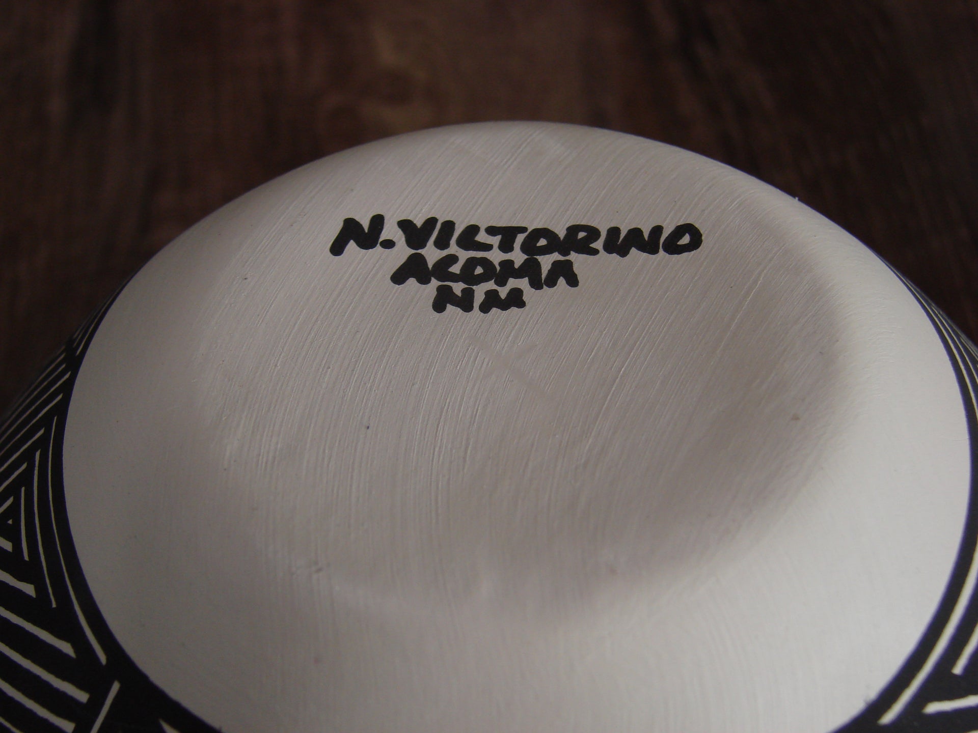 Genuine Native American Acoma Pueblo Indian Hand Painted Fine Line Pottery from Western New Mexico. This Beautiful piece of pottery features Stunning natural pigment hand painted patterns throughout. The detail is exquisite! Hand painted by Acoma artist N. Victorino.The bottom is signed. Free Shipping included!