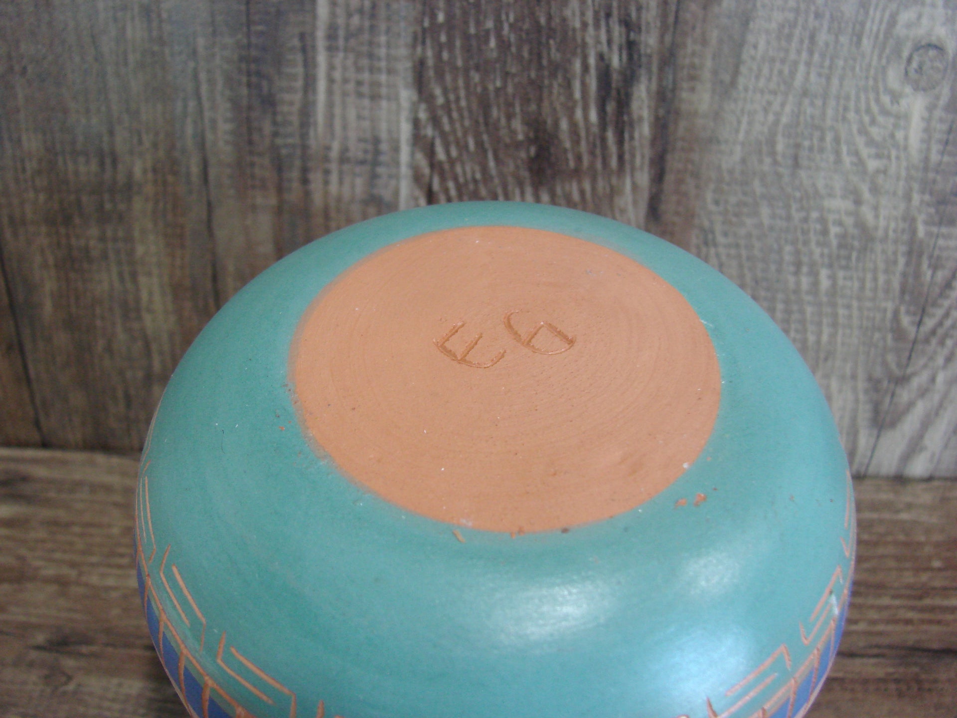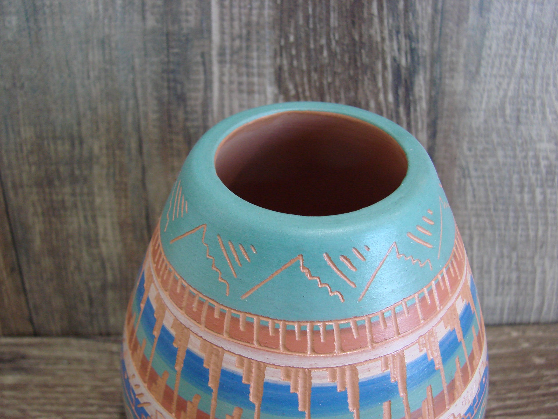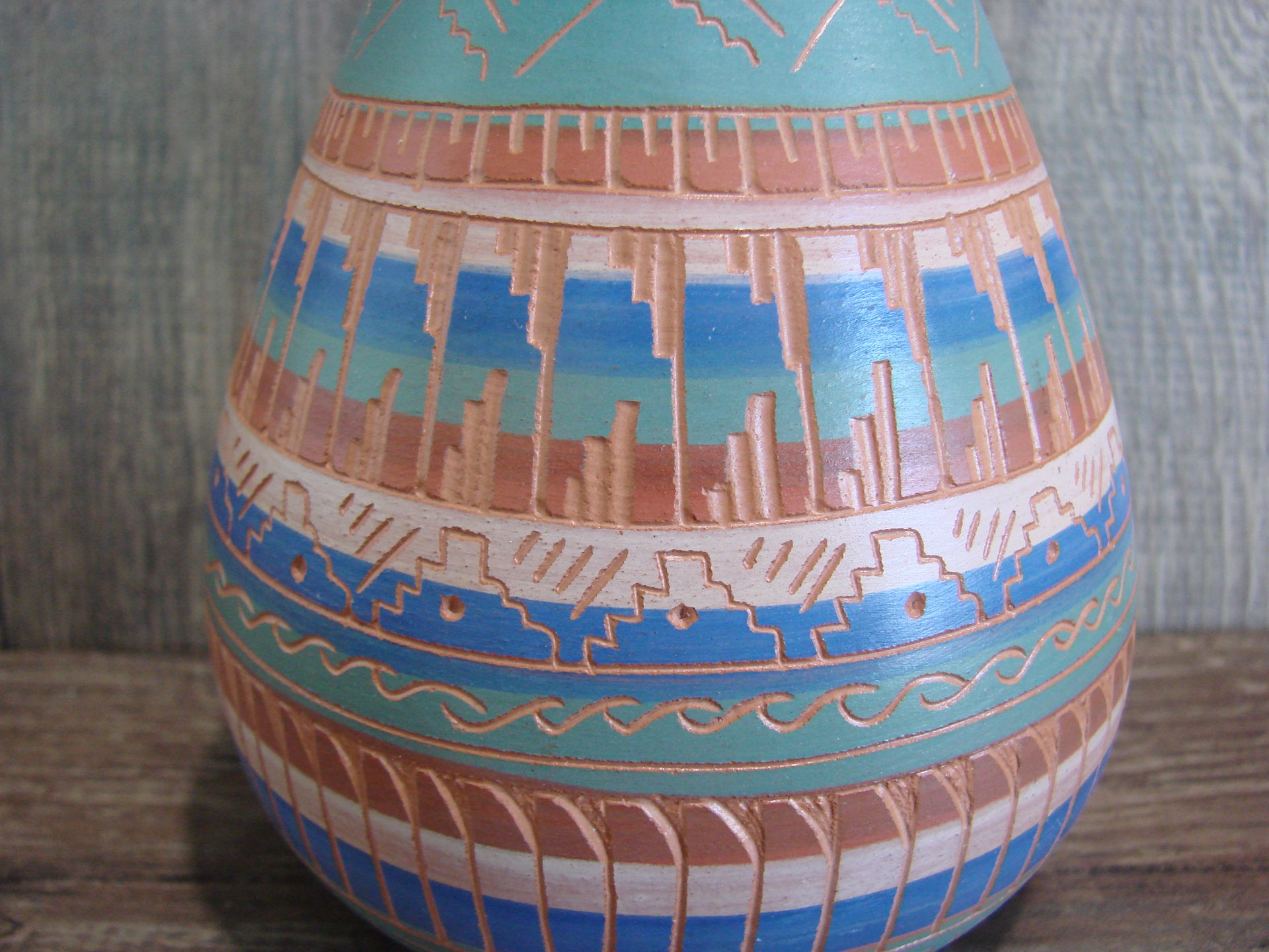 Genuine Native American Navajo Indian Hand Etched and Hand Painted Pottery from Western New Mexico. This beautiful piece of pottery features stunning Hand Painted and traditional Hand Etched Navajo patterns throughout. Hand etched and painted by E. Gilmore. Signed "EG" on the bottom. Free shipping included!
