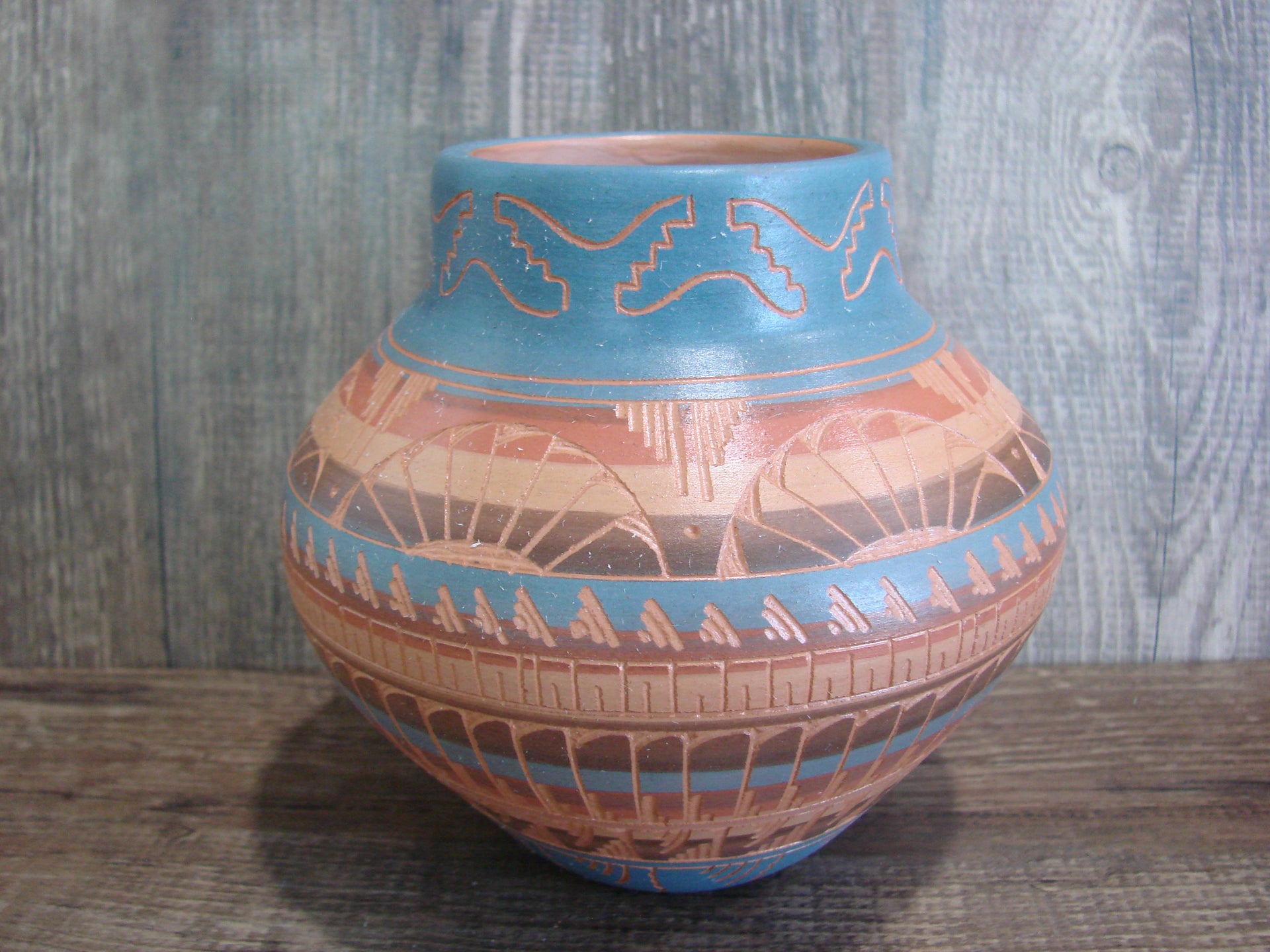Genuine Native American Navajo Indian Hand Etched and Hand Painted Pottery from Western New Mexico. This beautiful piece of pottery features stunning Hand Painted and traditional Hand Etched Navajo patterns throughout. Hand etched and painted by E. Gilmore. Signed "EG" on the bottom. Free shipping included!
