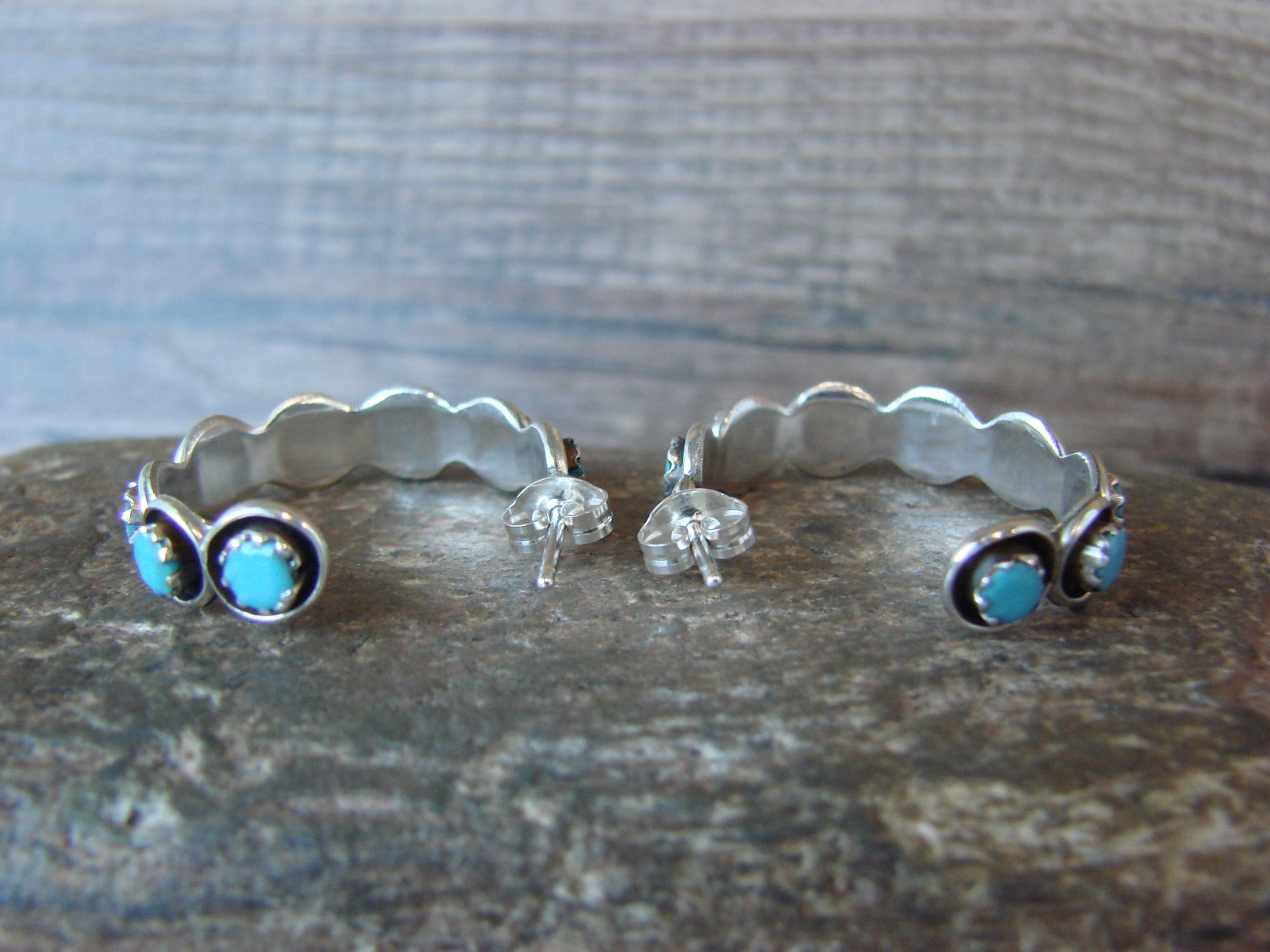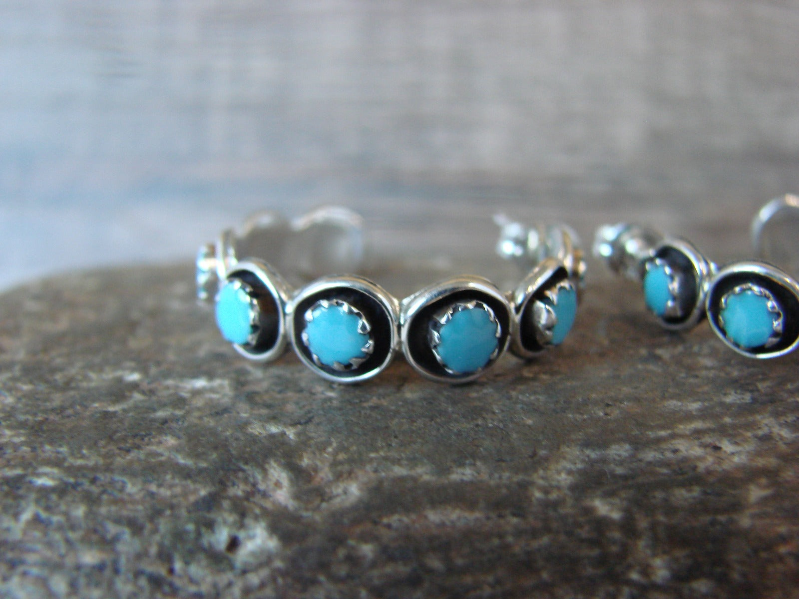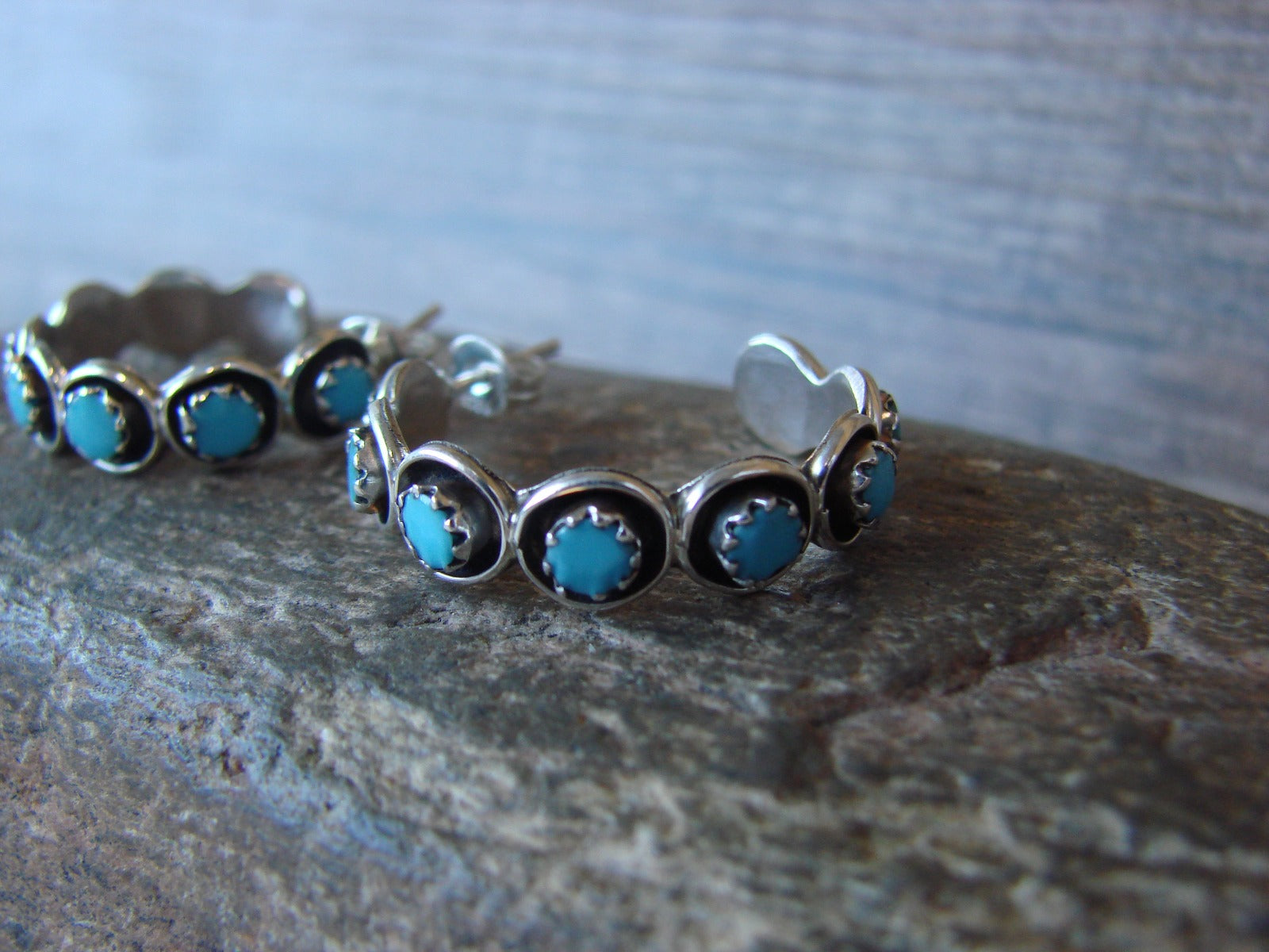 Native American Zuni Indian Sterling Silver & Turquoise Earrings from Western New Mexico. These Stunning hoop style earrings feature 8 Turquoise each. Each stone is beautifully set into a crown sterling silver bezel shadowbox setting. This is a very nice pair of earrings! Zuni Indian handmade by Florenda Lonasee. Unsigned. Free Shipping with a gift box included!