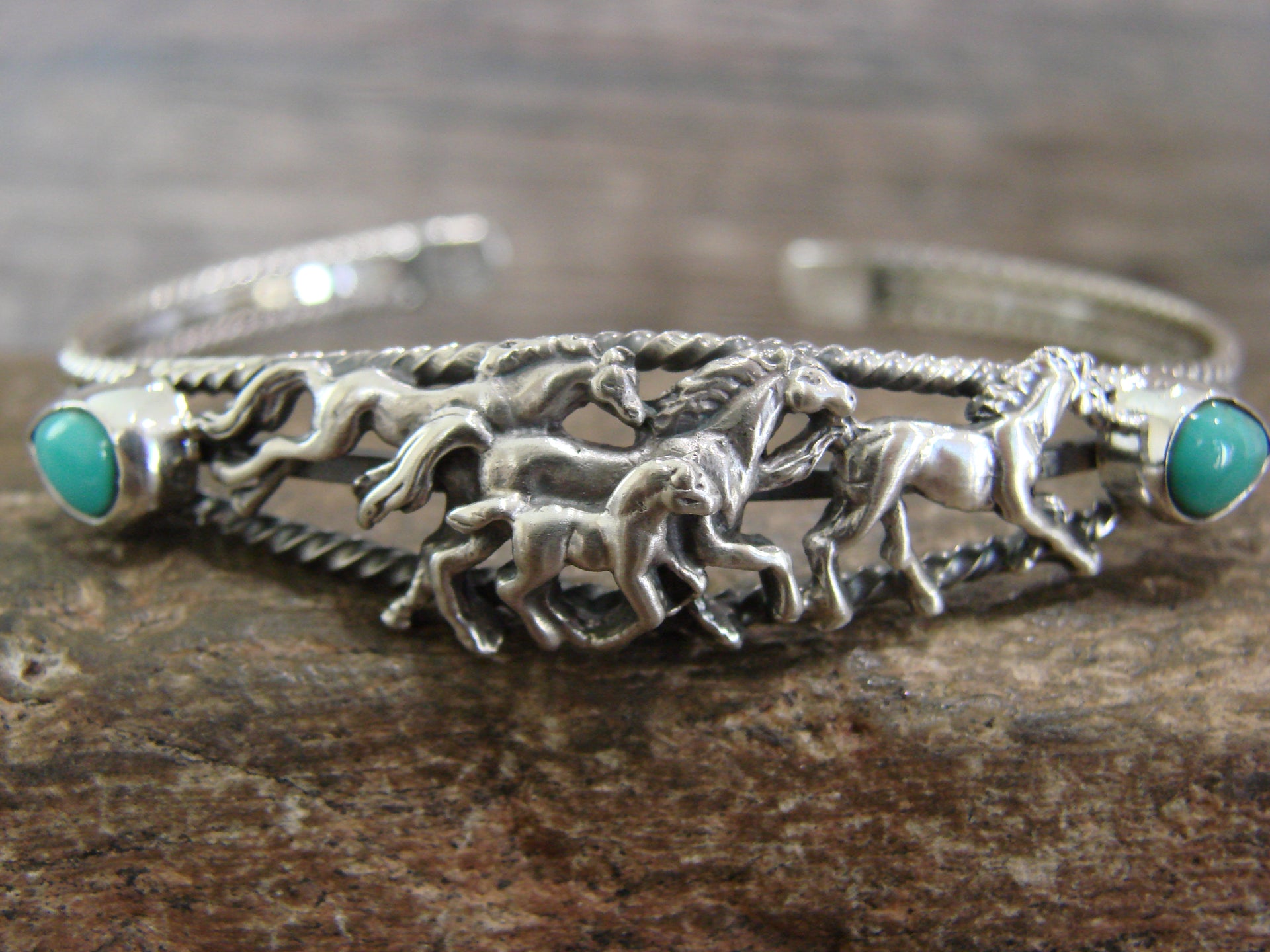 Genuine Native American Navajo Indian Sterling Silver Turquoise Horse Bracelet from Western New Mexico. This bracelet features a Sterling Silver galloping horse scene accented by a Turquoise stone on each side. The stones are set into crown sterling silver bezel settings and surrounded by beautiful Sterling Silver work. Navajo Indian hand made by Roberta Begay. Free Gift box and Shipping included!