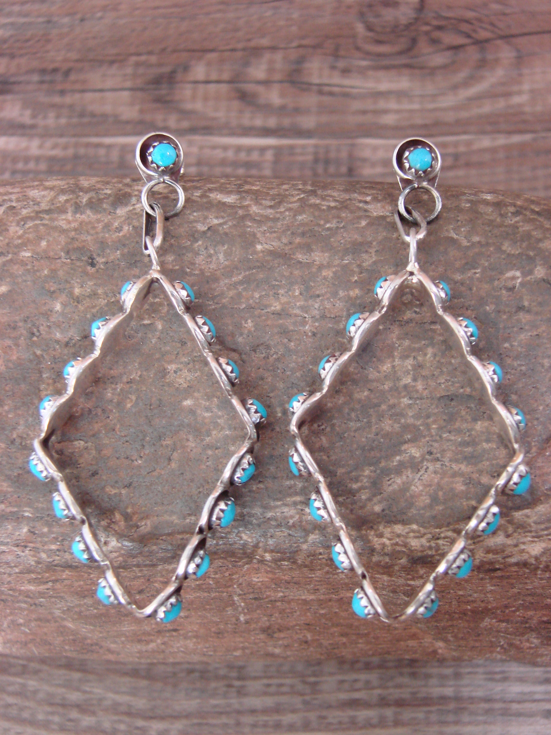 Genuine Native American Zuni Indian Sterling Silver & Turquoise Earrings from Western New Mexico. These Stunning Post Dangle style earrings feature Genuine Turquoise Stones beautifully set into crown sterling silver bezel shadowbox settings. This is a very nice pair of earrings! Zuni Indian handmade by Florenda Lonasee. Unsigned. Free Shipping with a gift box included!
