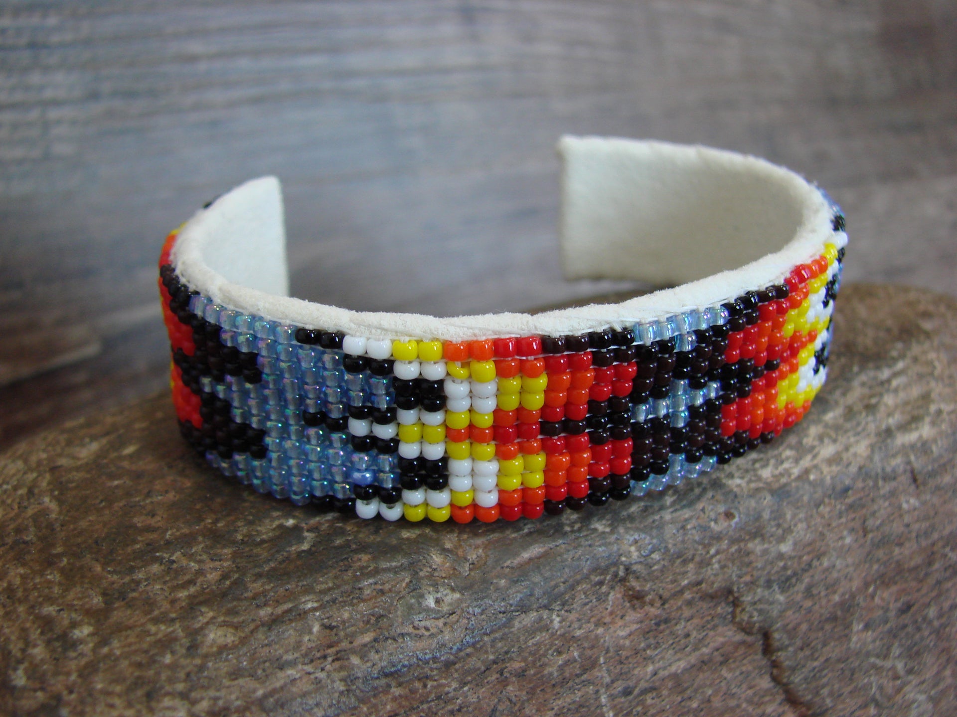 Genuine Native American Navajo Indian Hand Beaded Bracelet from Western New Mexico. This bracelet features a beautiful hand beaded design throughout. The bracelet is very colorful and has a great look. This bracelet can easily be adjusted to fit different sized wrists. The inside is lined with white leather. Navajo Indian handmade by Jacklyn Cleveland. The back is unsigned. Free shipping and gift box included!