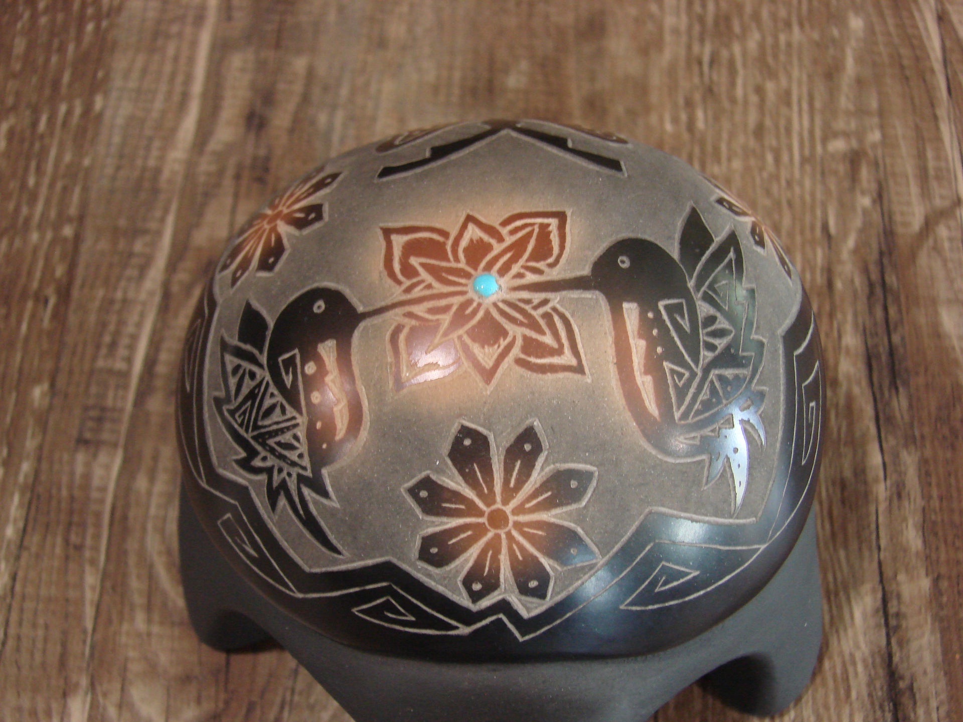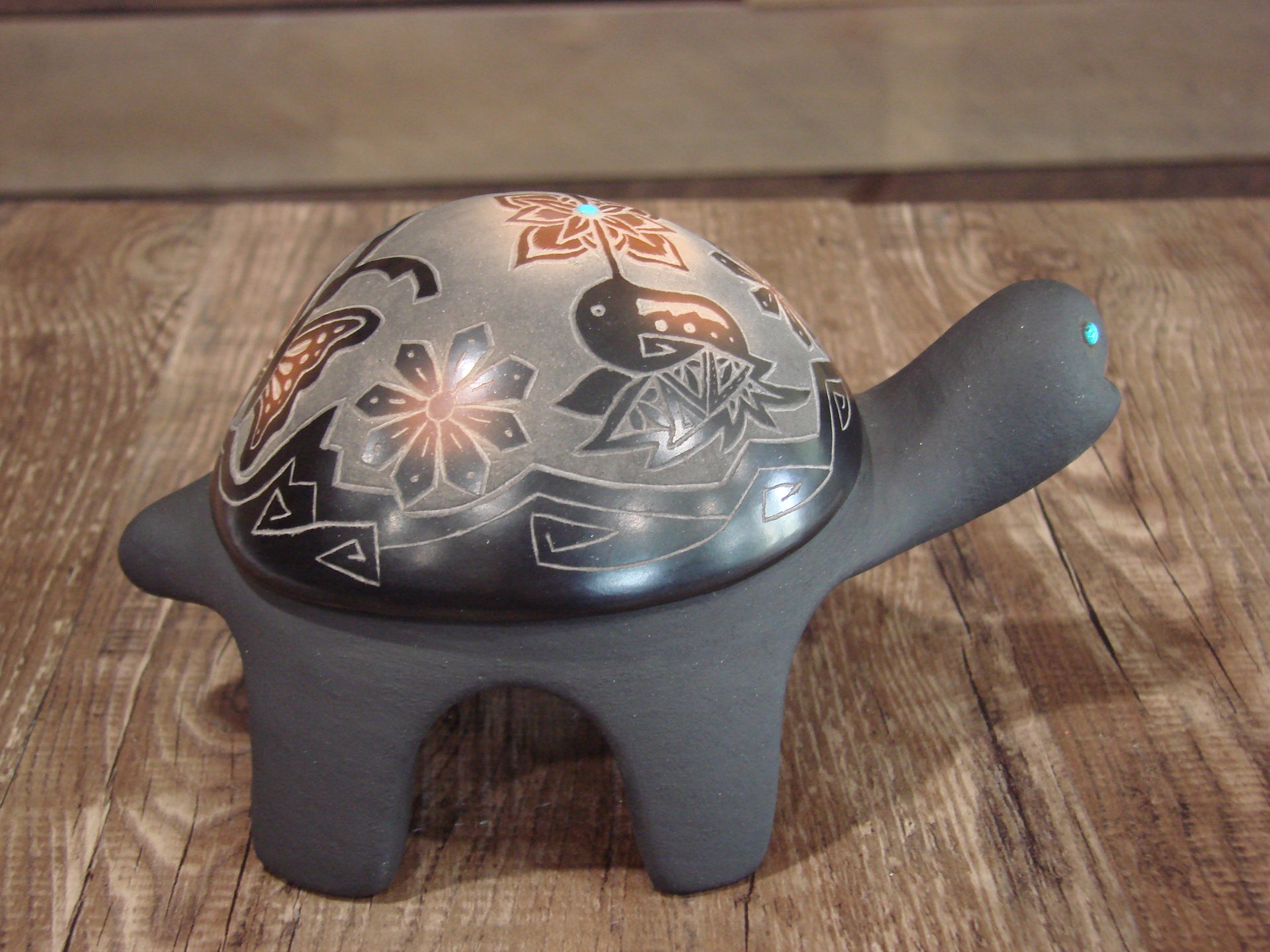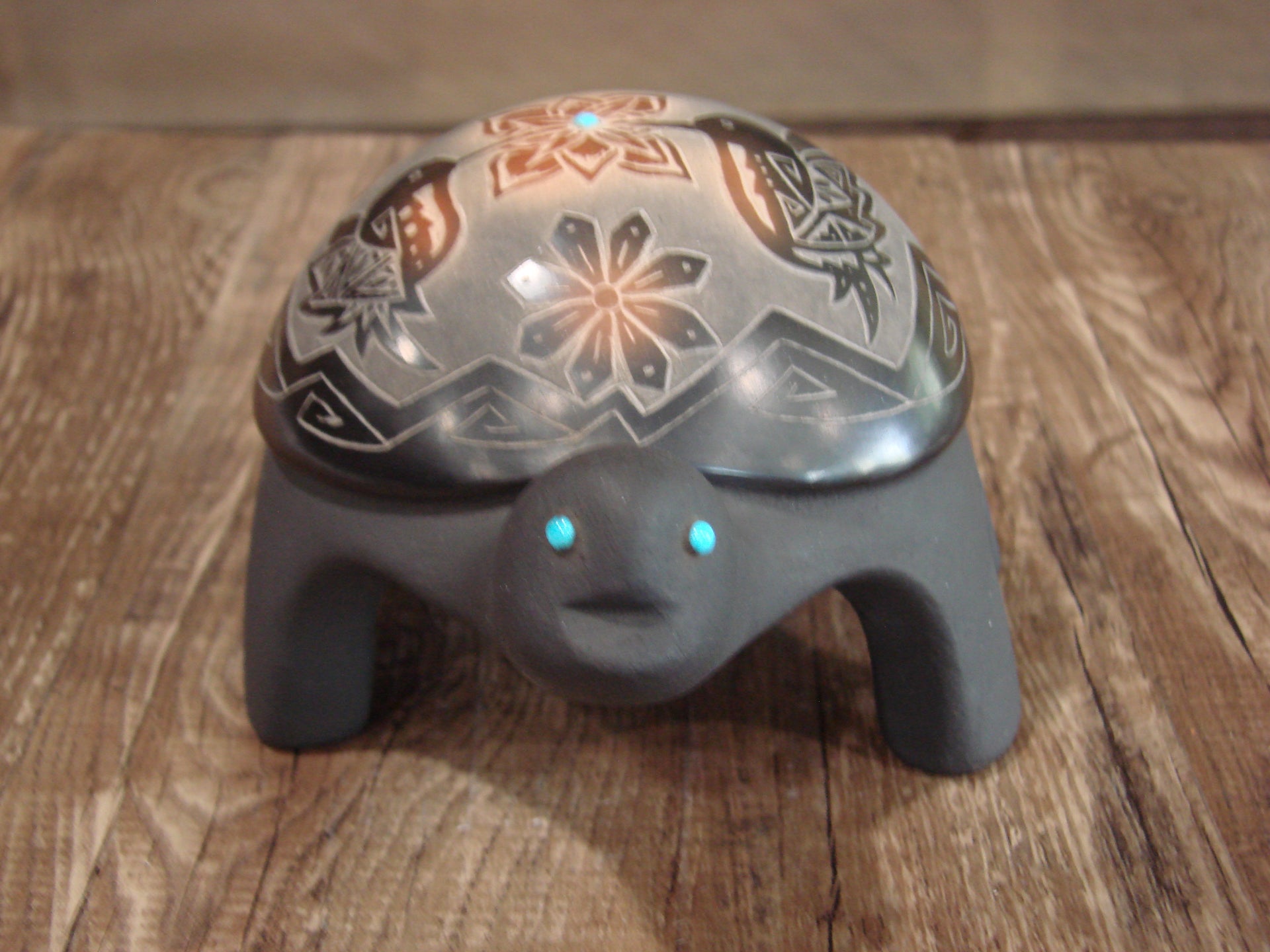 Genuine Native American Santa Clara Indian Hand Made Clay Turtle Pottery from Northern New Mexico. This Stunning piece of Pottery is Hand Made to perfection! This piece is handmade with Santa Clara Clay and is a beautiful addition to one's pottery collection! The Hummingbird and Turquoise on the Turtle's back is Gorgeous! Handmade by Melony. Signed "Melony Santa Clara Pueblo" on the bottom. Free shipping included!