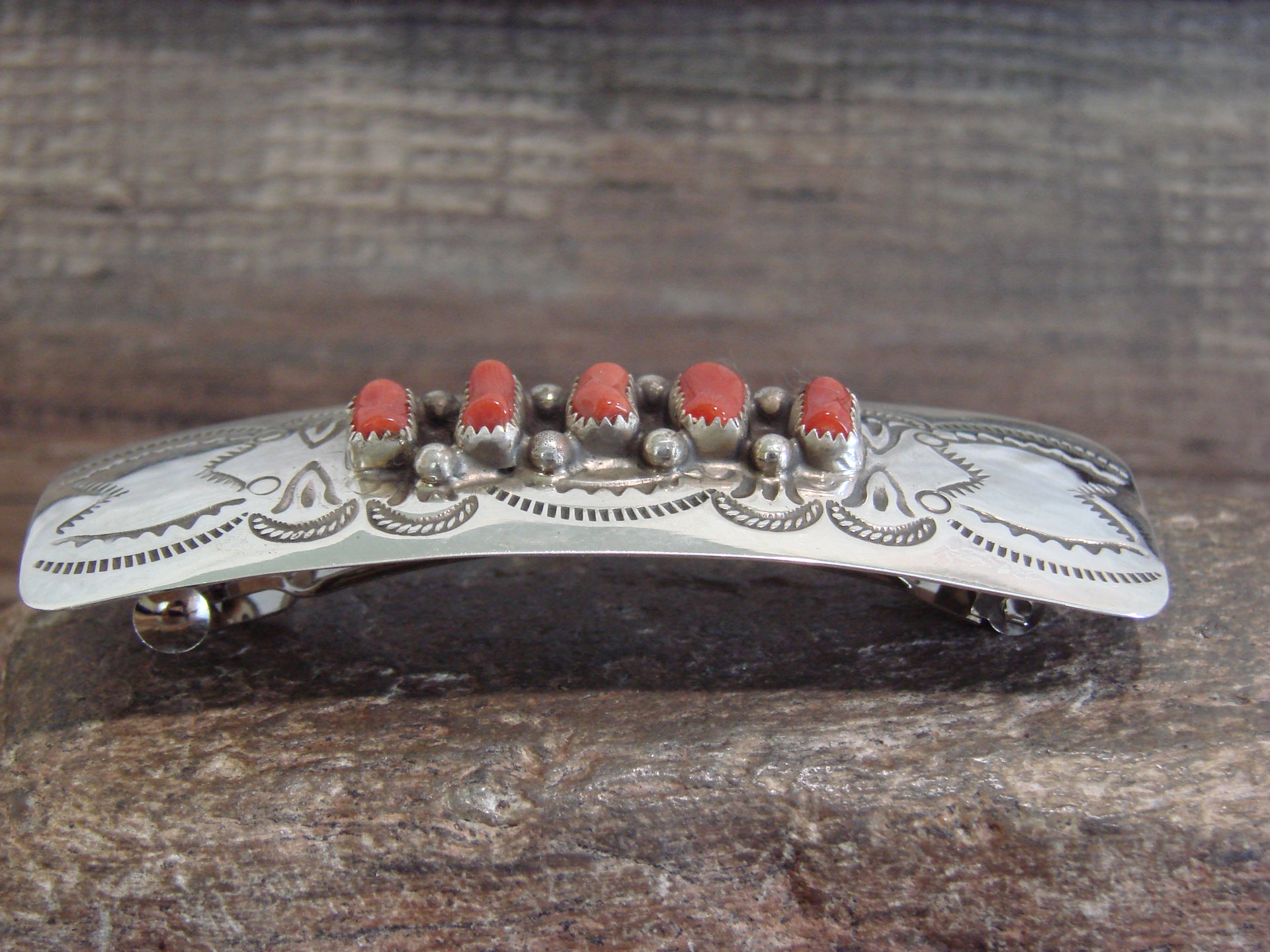 Native American Sterling Silver & Coral Row Hair Barrette by Begay