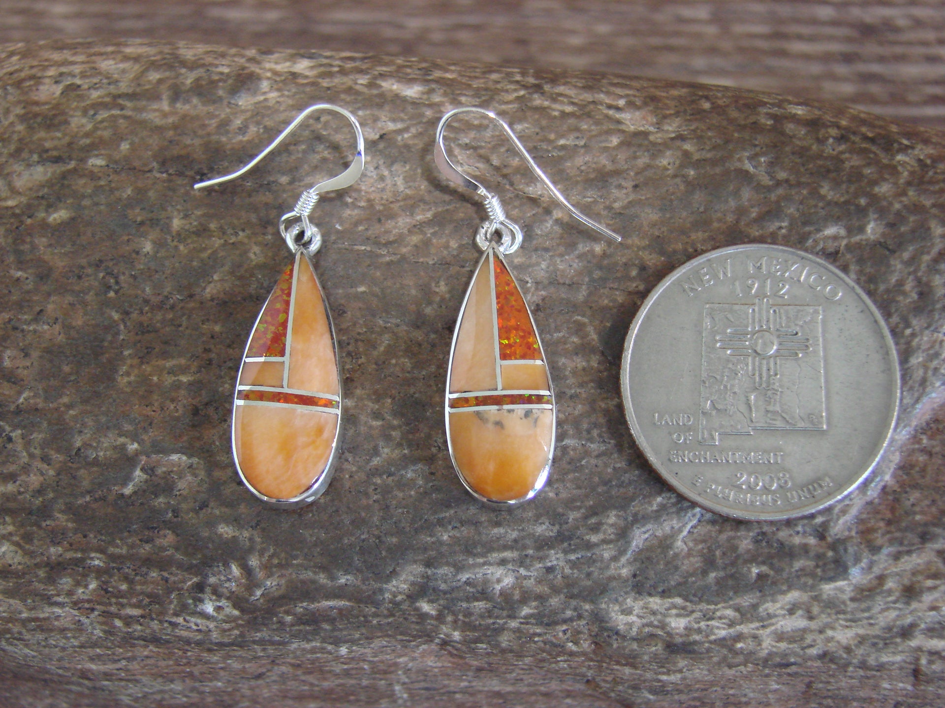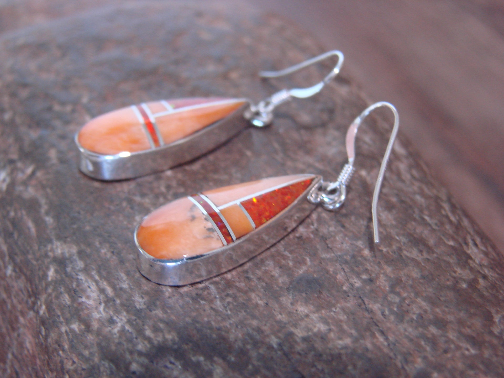 Genuine Native American Navajo Indian Handmade Sterling Silver & Spiny Oyster Inlay Dangle Earrings from Western New Mexico. These earrings feature Beautiful Spiny Oyster and lab opal stones intricately inlaid into a Smooth Sterling Silver dangling. The earrings are polished smooth with a shiny finish. Handmade by Navajo Artist James Manygoats. Signed "JM" and Stamped "Sterling" on the back. Free shipping and gift box included!
