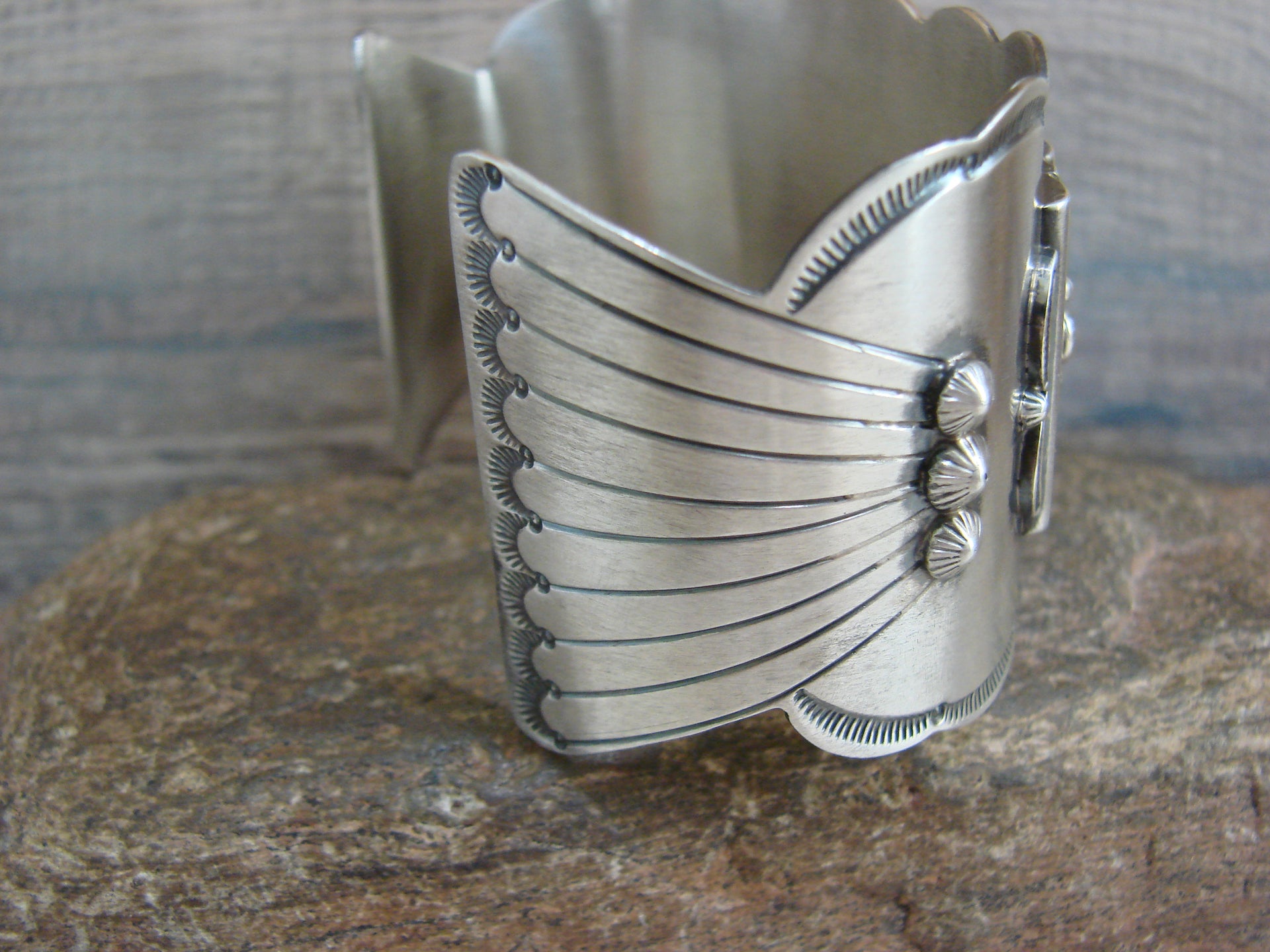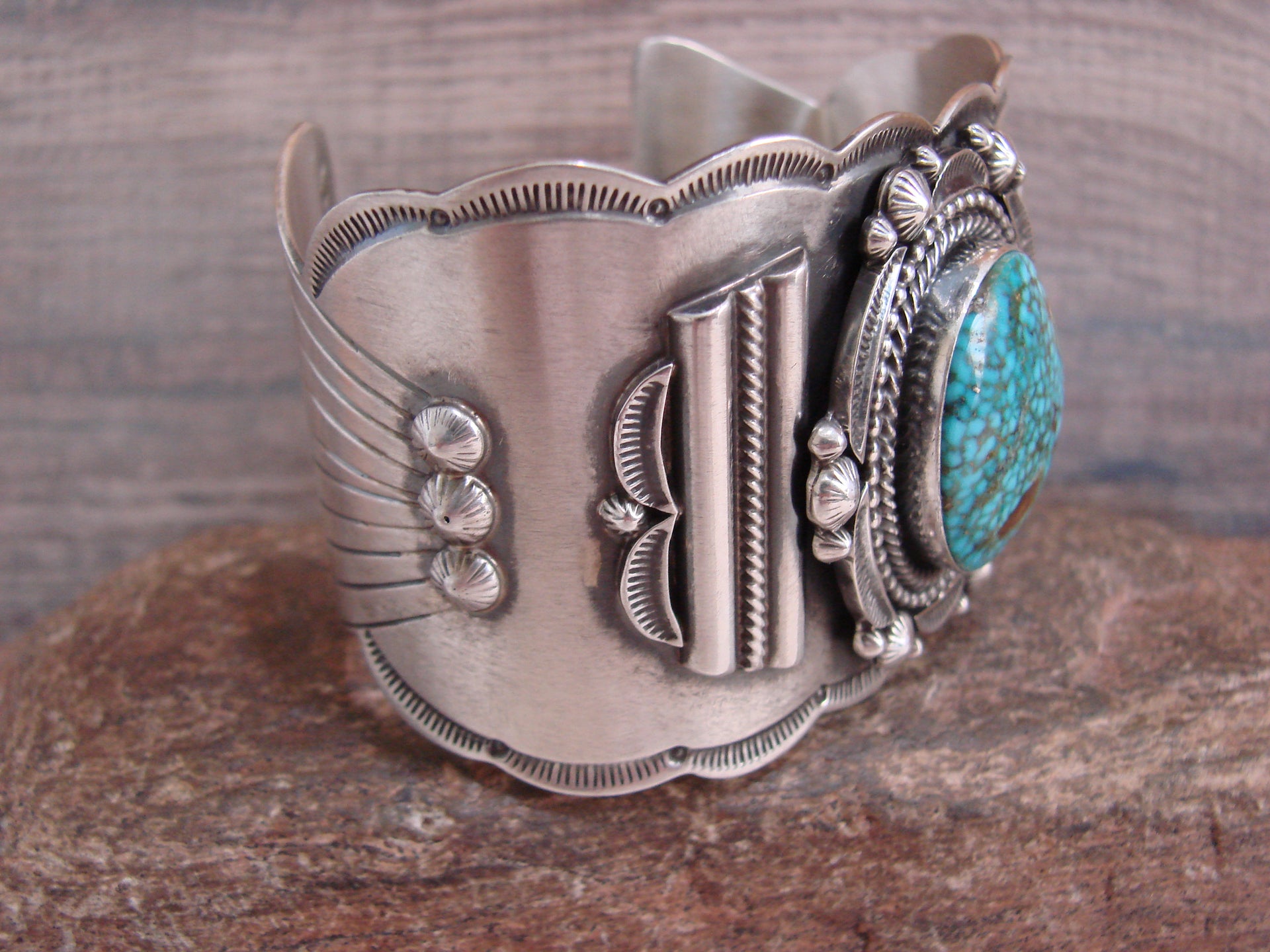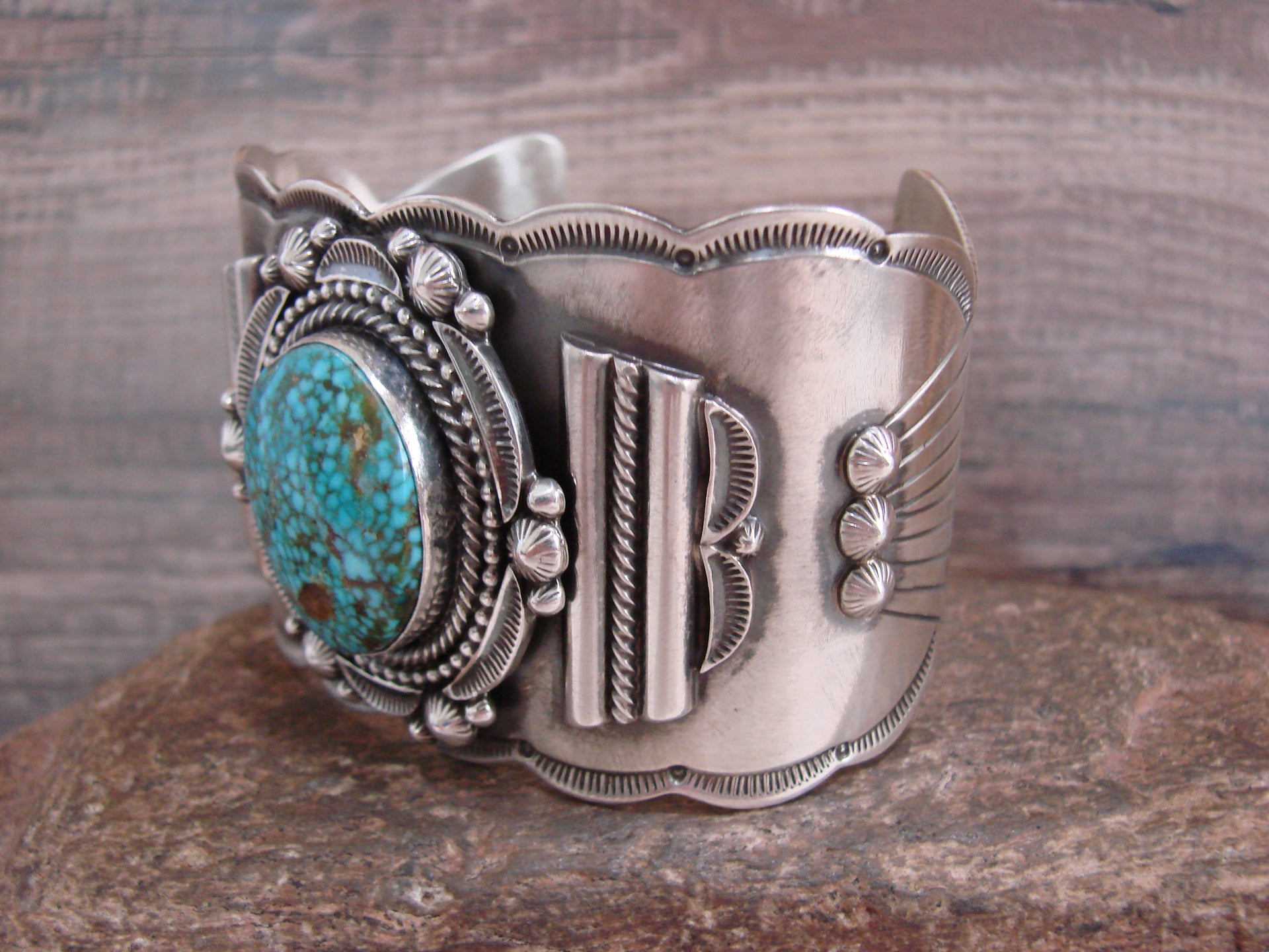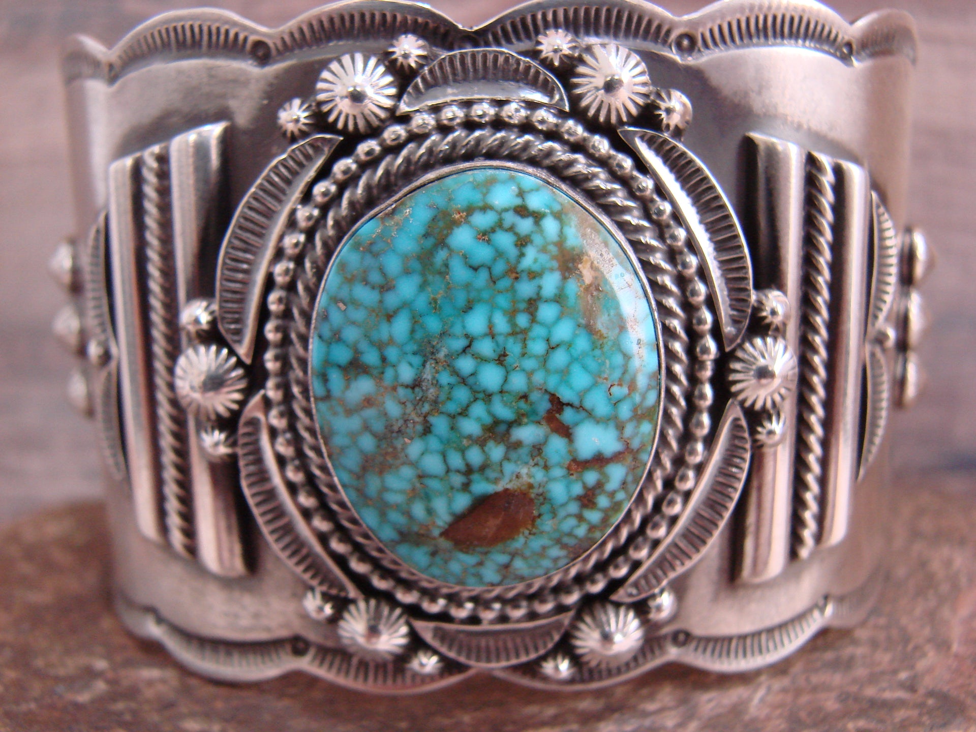 Genuine Native American Navajo Indian Sterling Silver & Turquoise Bracelet from Western New Mexico. This Stunning bracelet features a High Quality, Genuine, Turquoise stone intricately set into Smooth Sterling Silver bezel setting. Sterling Silver Details and Hand Stamping surround the stone. Fine Navajo Silversmith workmanship quality makes this bracelet a beautiful hand made masterpiece! Navajo Indian handmade by Tom Lewis. Signed "Tom Lewis" and Stamped "Sterling" on the back. Free gift box and shipping included!