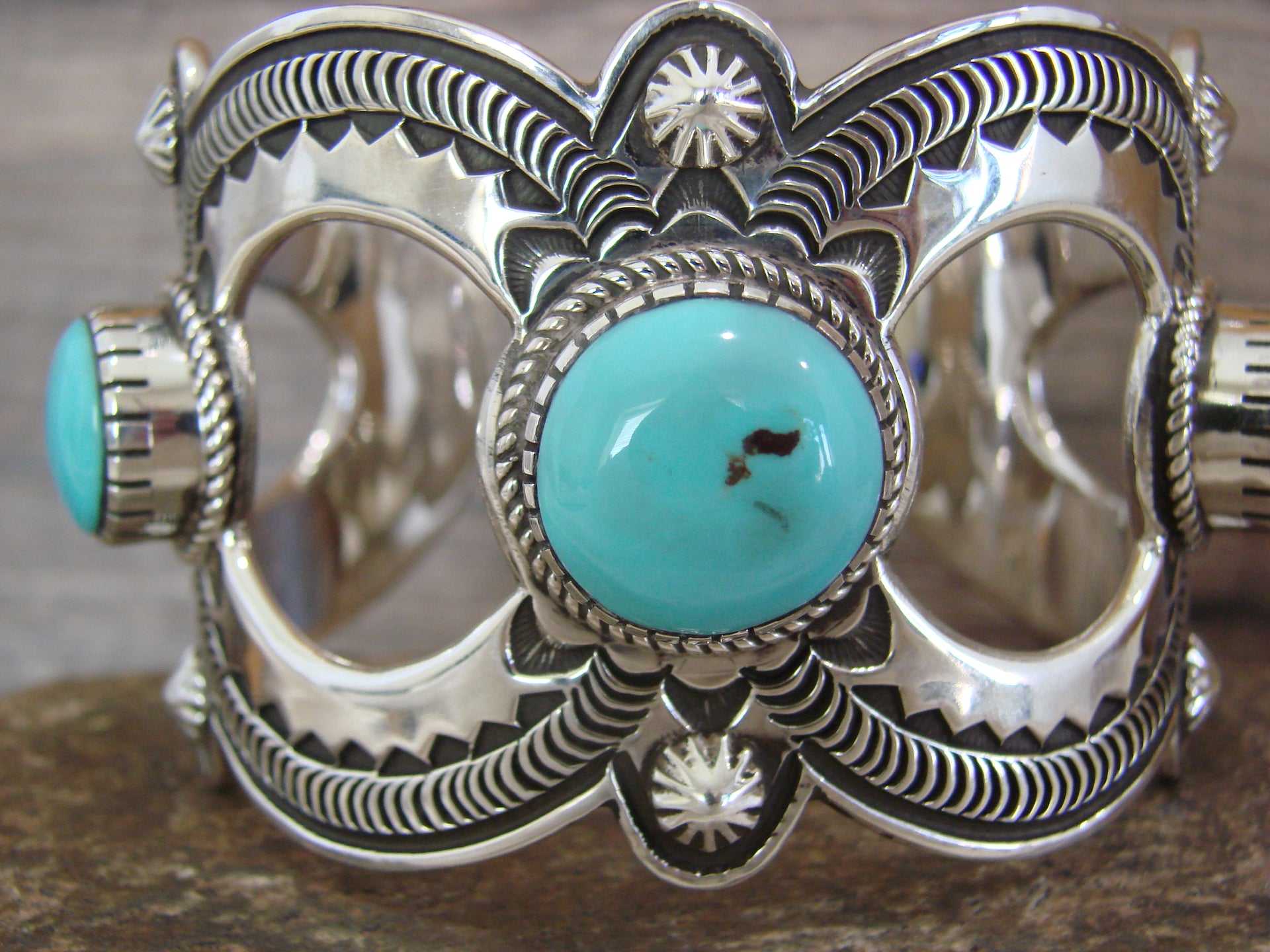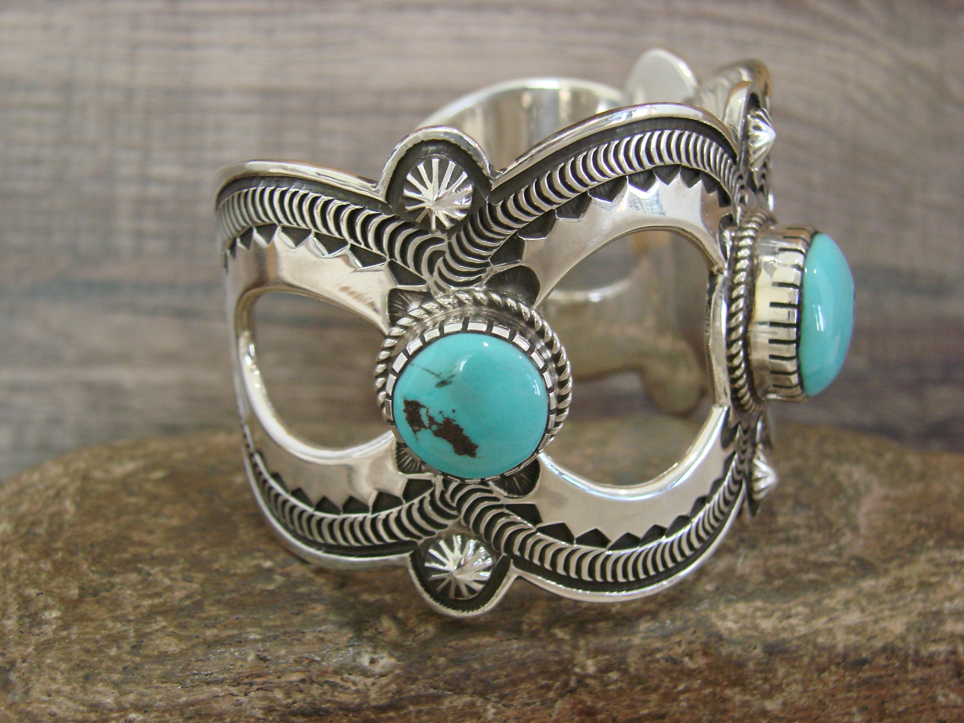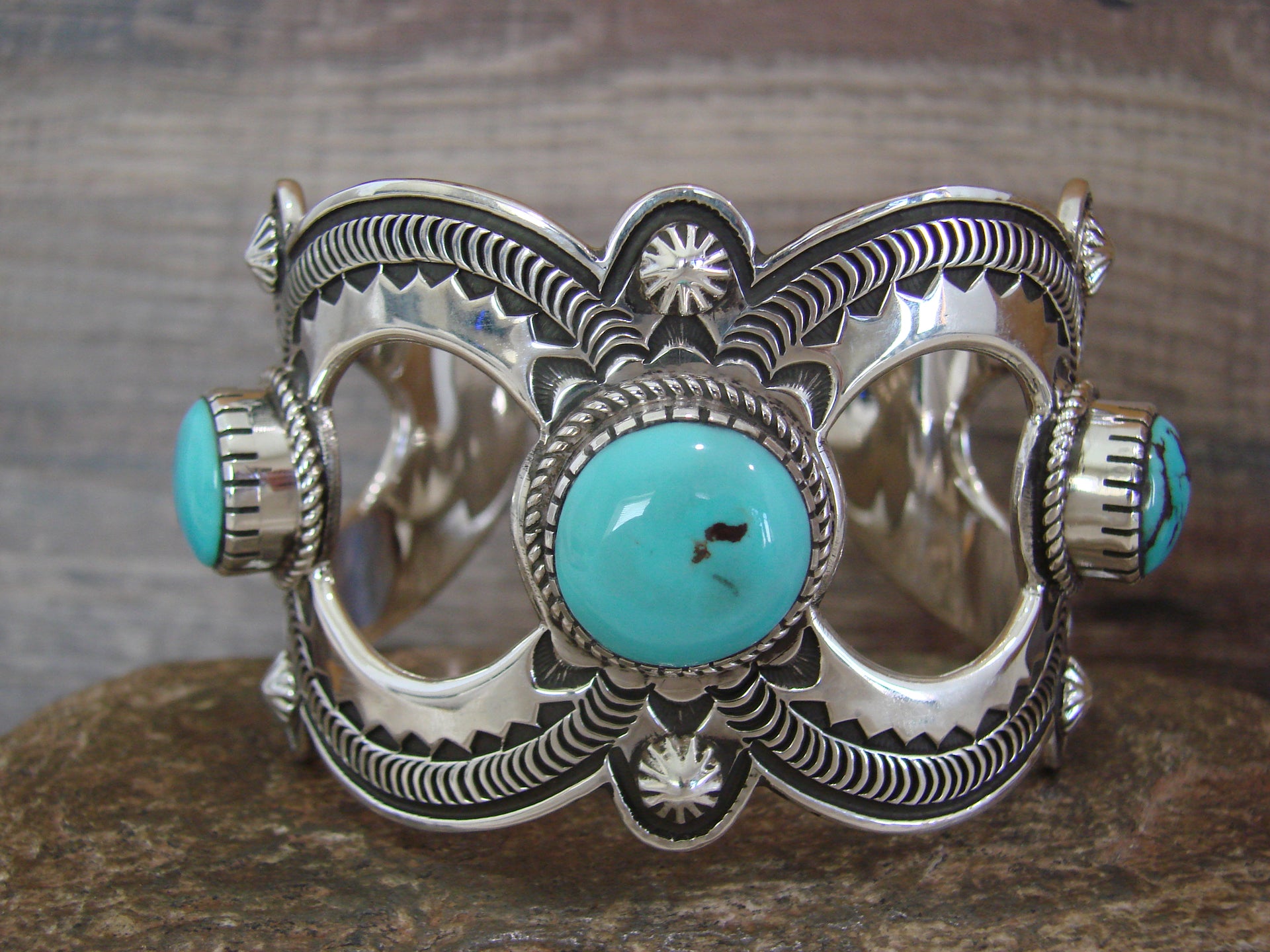 Genuine Native American Navajo Indian Sterling Silver & Turquoise Bracelet from Western New Mexico. This Stunning bracelet features a High Quality, Genuine, Turquoise stone intricately set into Smooth Sterling Silver bezel setting. Sterling Silver Details and Hand Stamping surround the stone. Fine Navajo Silversmith workmanship quality makes this bracelet a beautiful hand made masterpiece! Navajo Indian handmade by Roland Dixon. Signed "Roland Dixon" and Stamped "Sterling" on the back. Free gift box and shipping included!