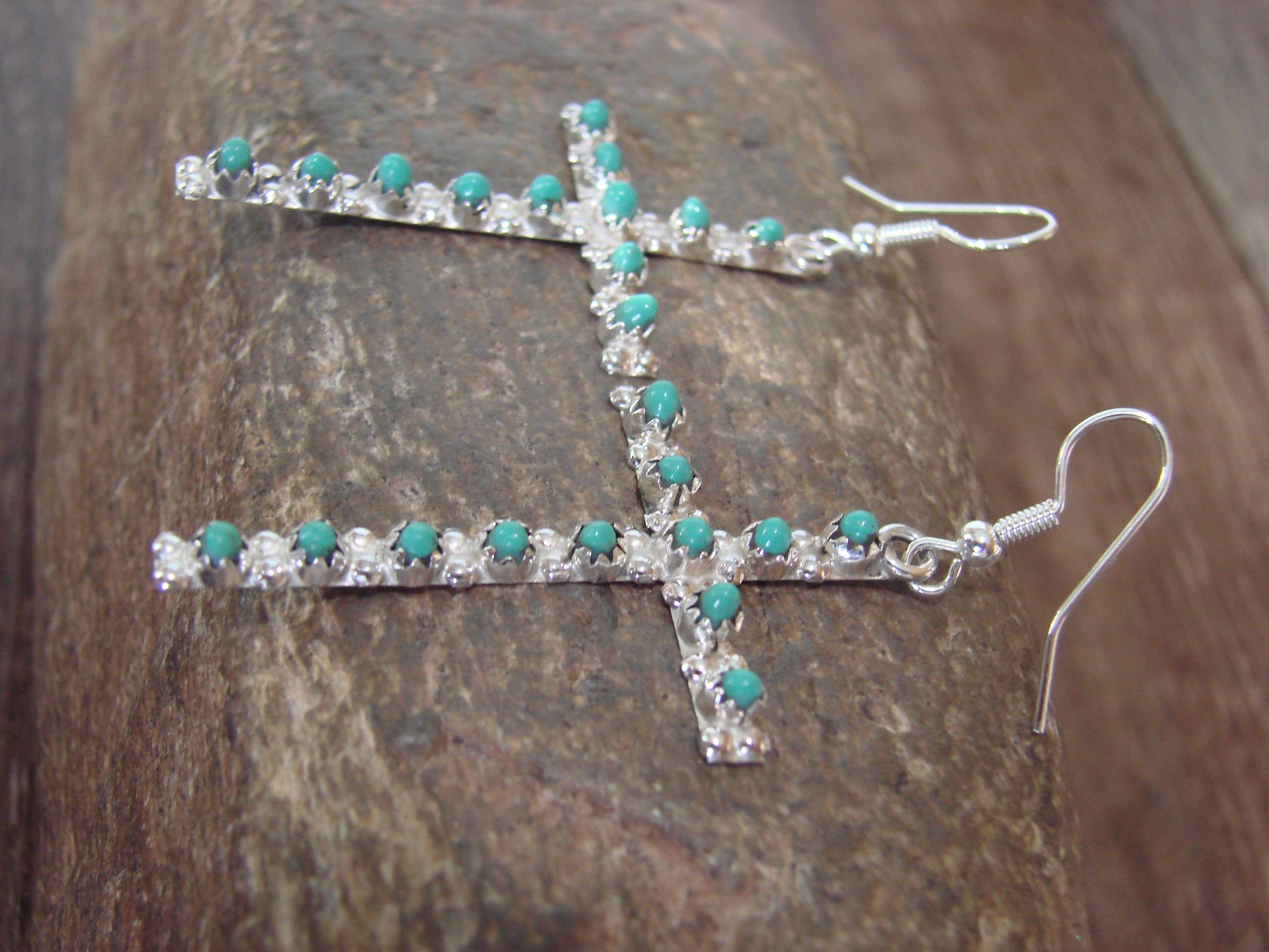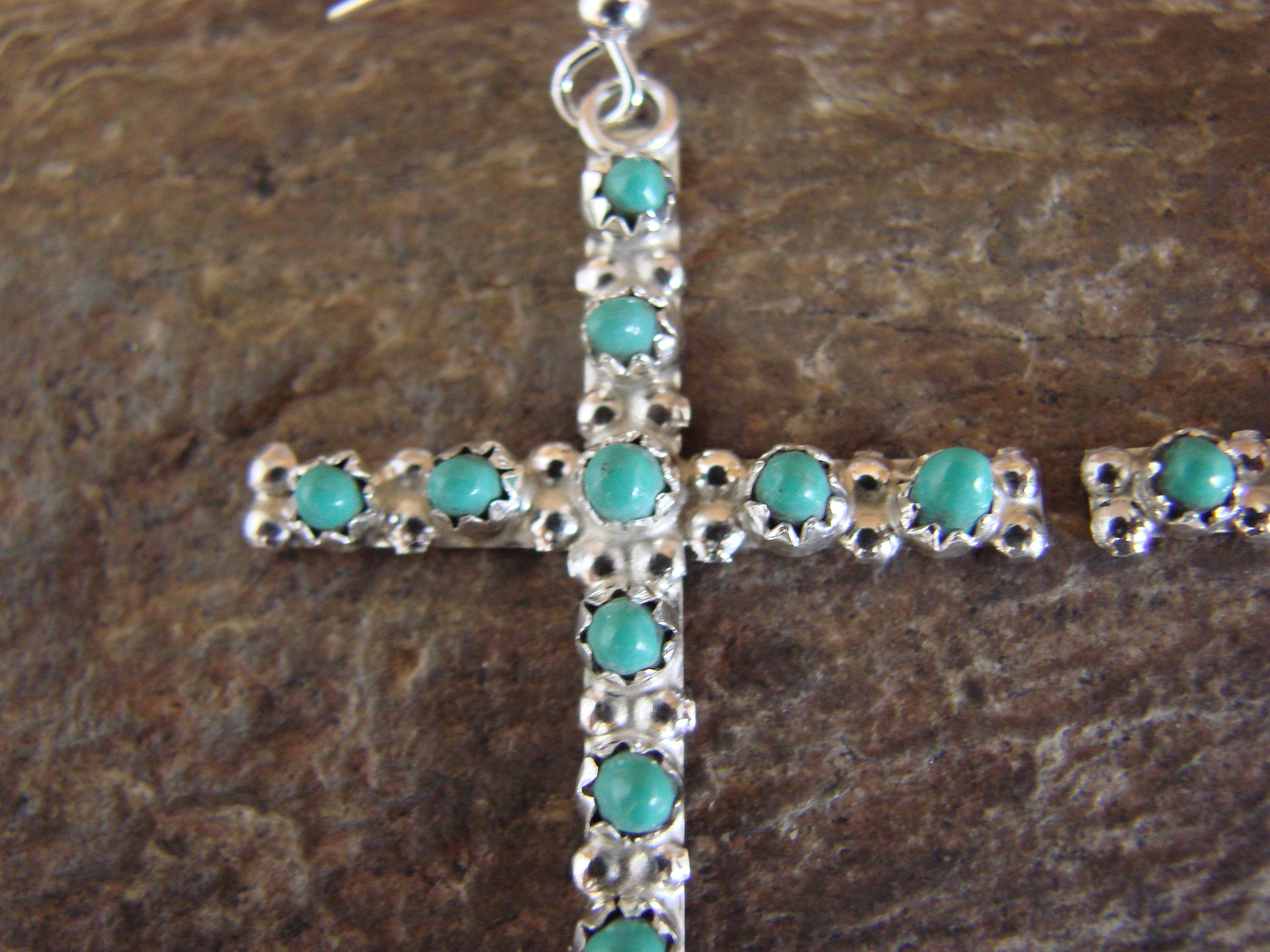 Genuine Native American Zuni Indian Sterling Silver Cross Dangle Earrings from Western New Mexico. These Stunning earrings feature Twelve beautiful Turquoise stones each. Each stone is set into a crown sterling silver bezel setting and beautifully polished. Gorgeous details in Sterling Silver Surround the Stones! Zuni Indian handmade by Davis Kaammasee. Unsigned. Free shipping with a gift box included!