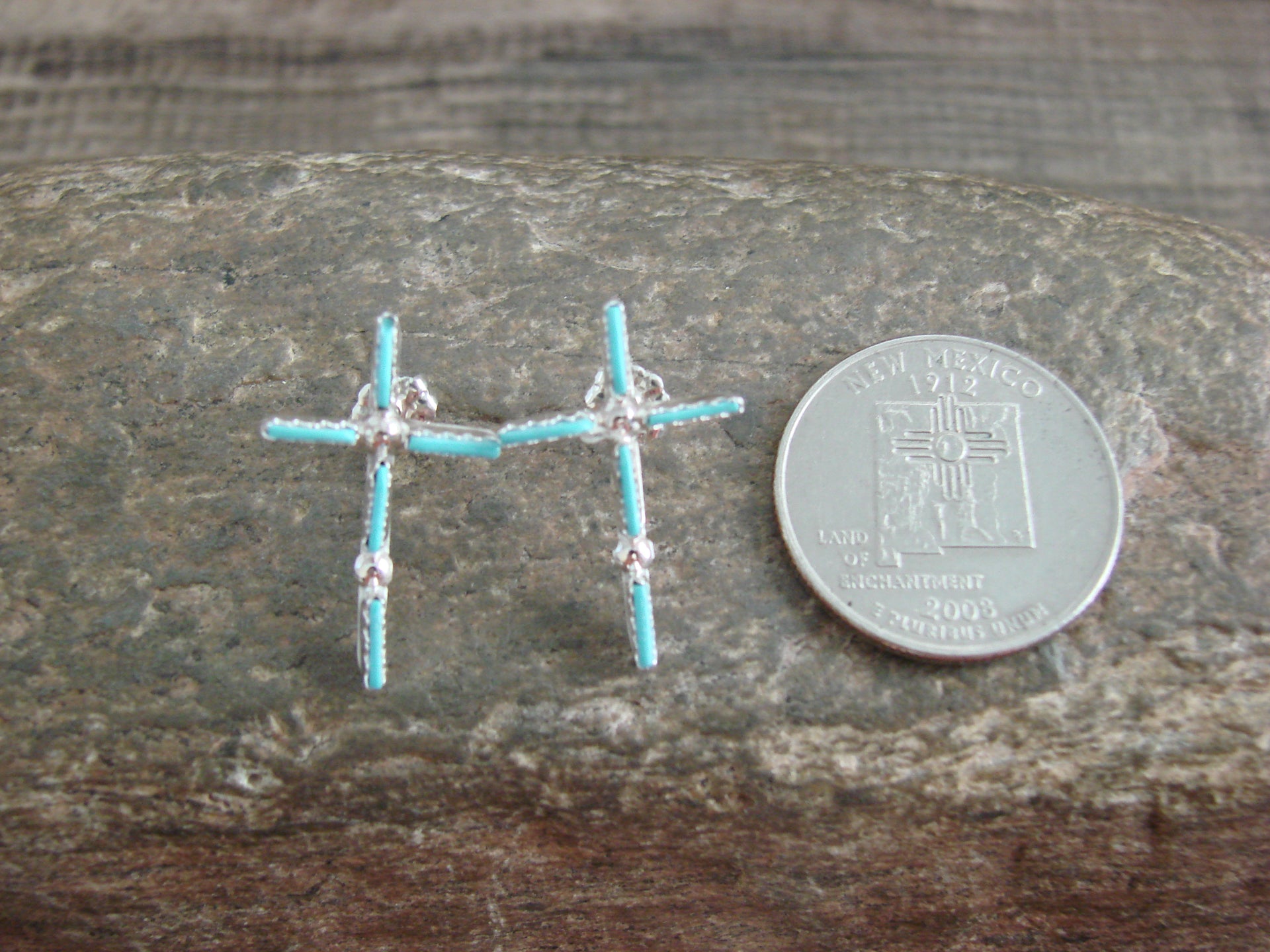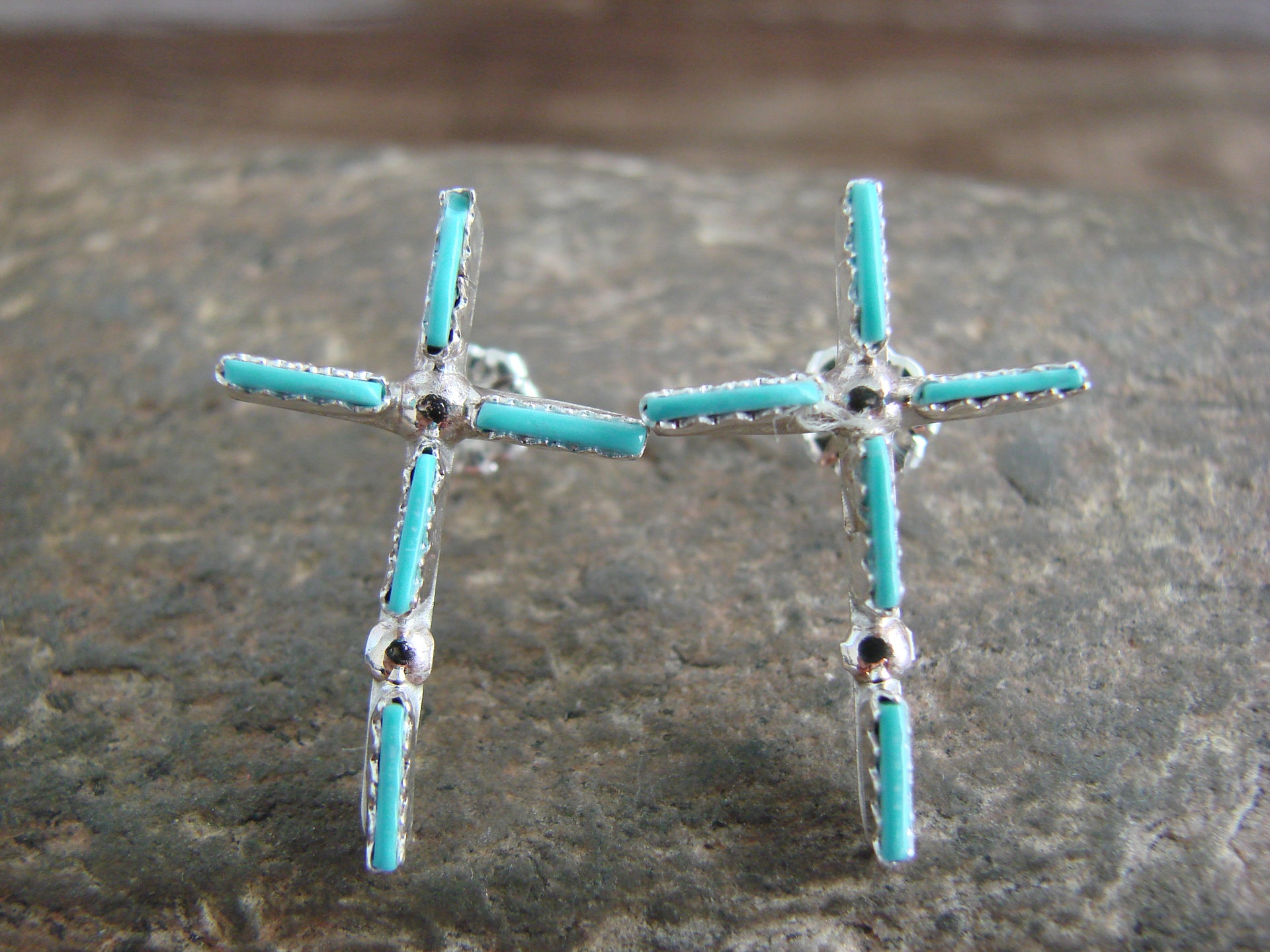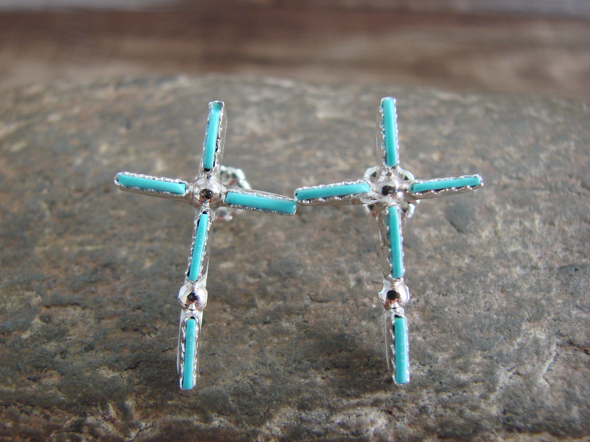 Native American Zuni Indian Sterling Silver Needlepoint Cross Post Earrings from Western New Mexico. These earrings feature 5 beautiful Turquoise stones each. Each stone is set into a needlepoint sterling silver bezel and beautifully polished. These have a great look! Zuni Indian handmade by Olivia Pinto. Free shipping with a gift box included!