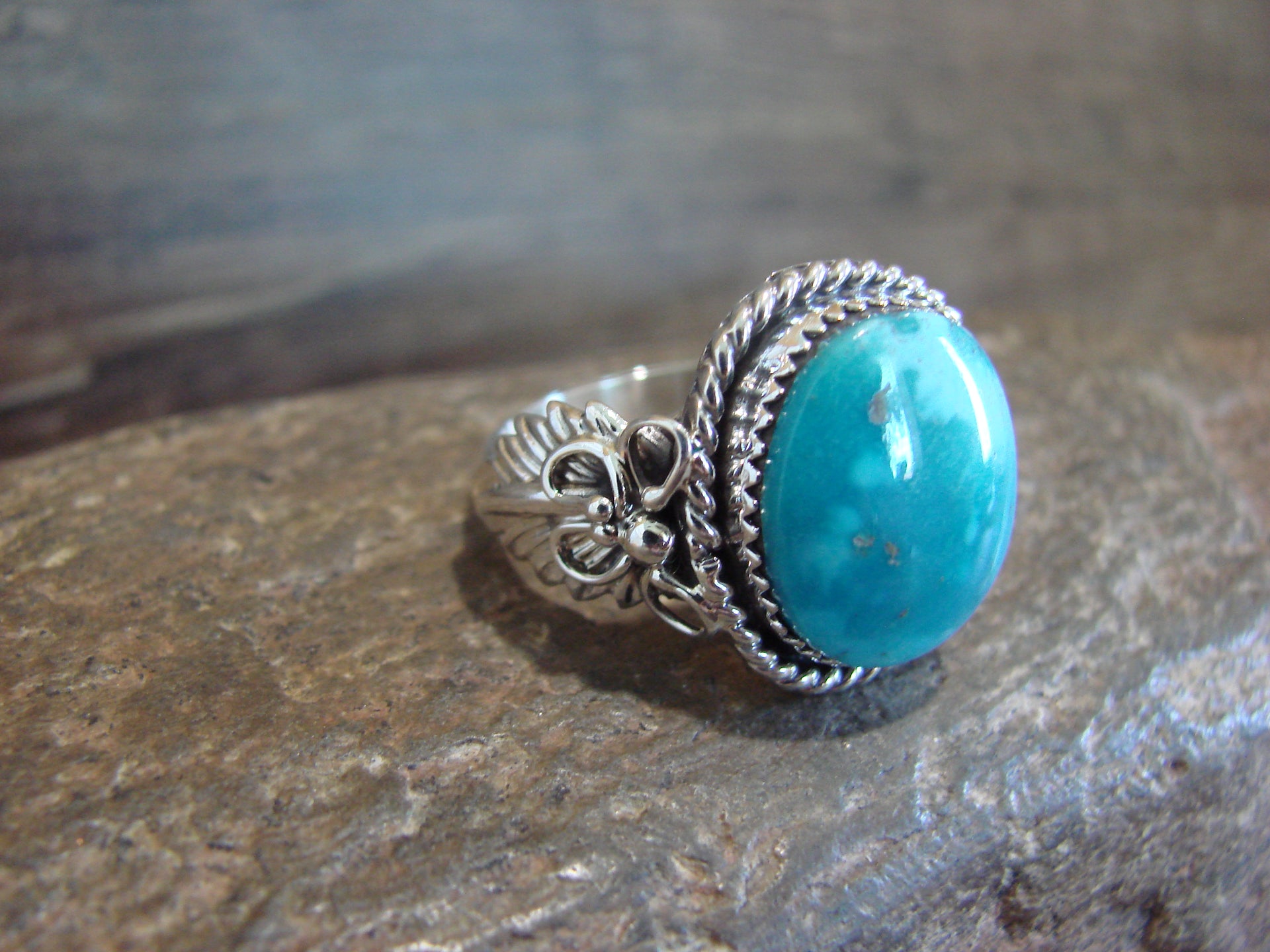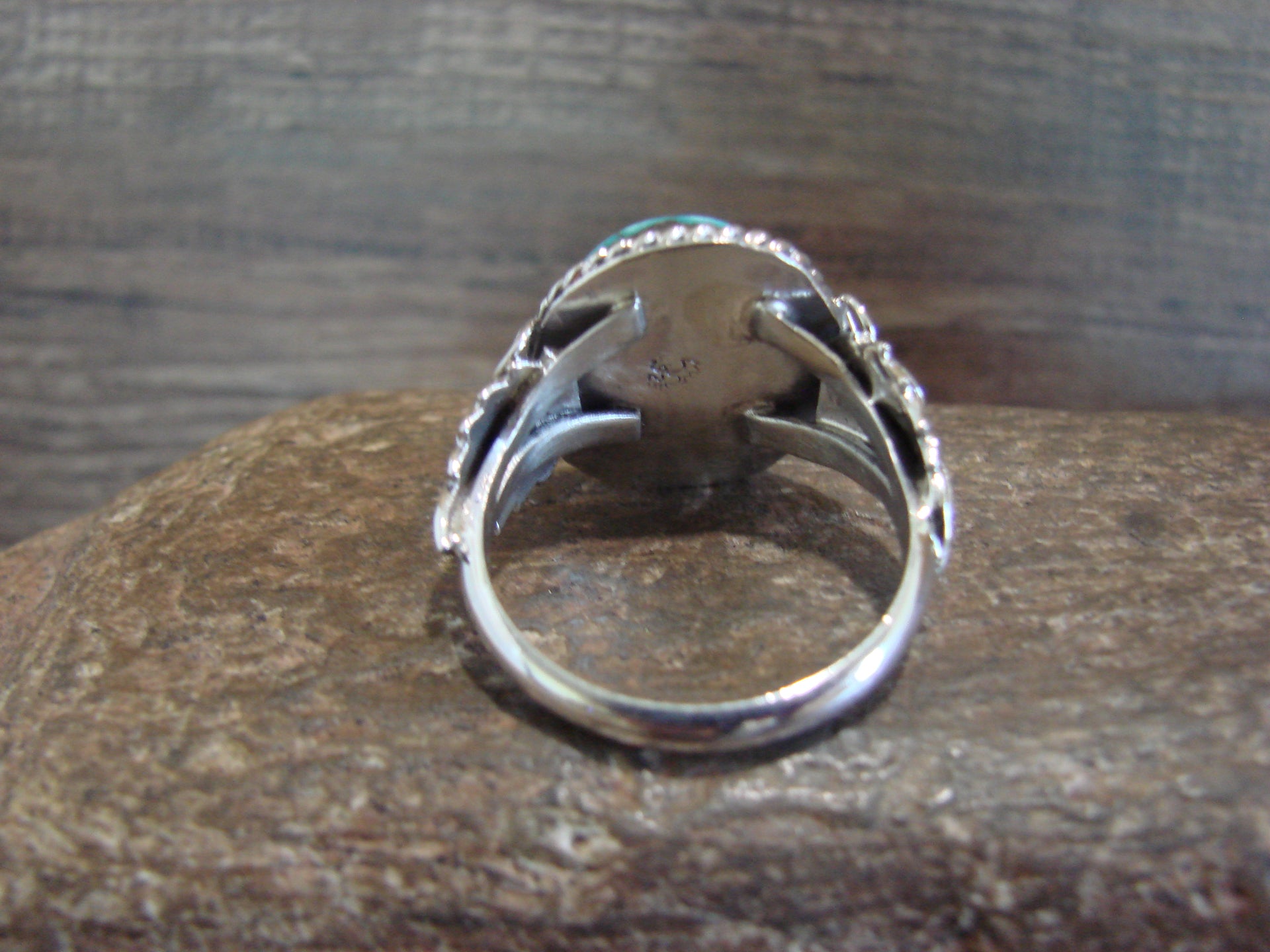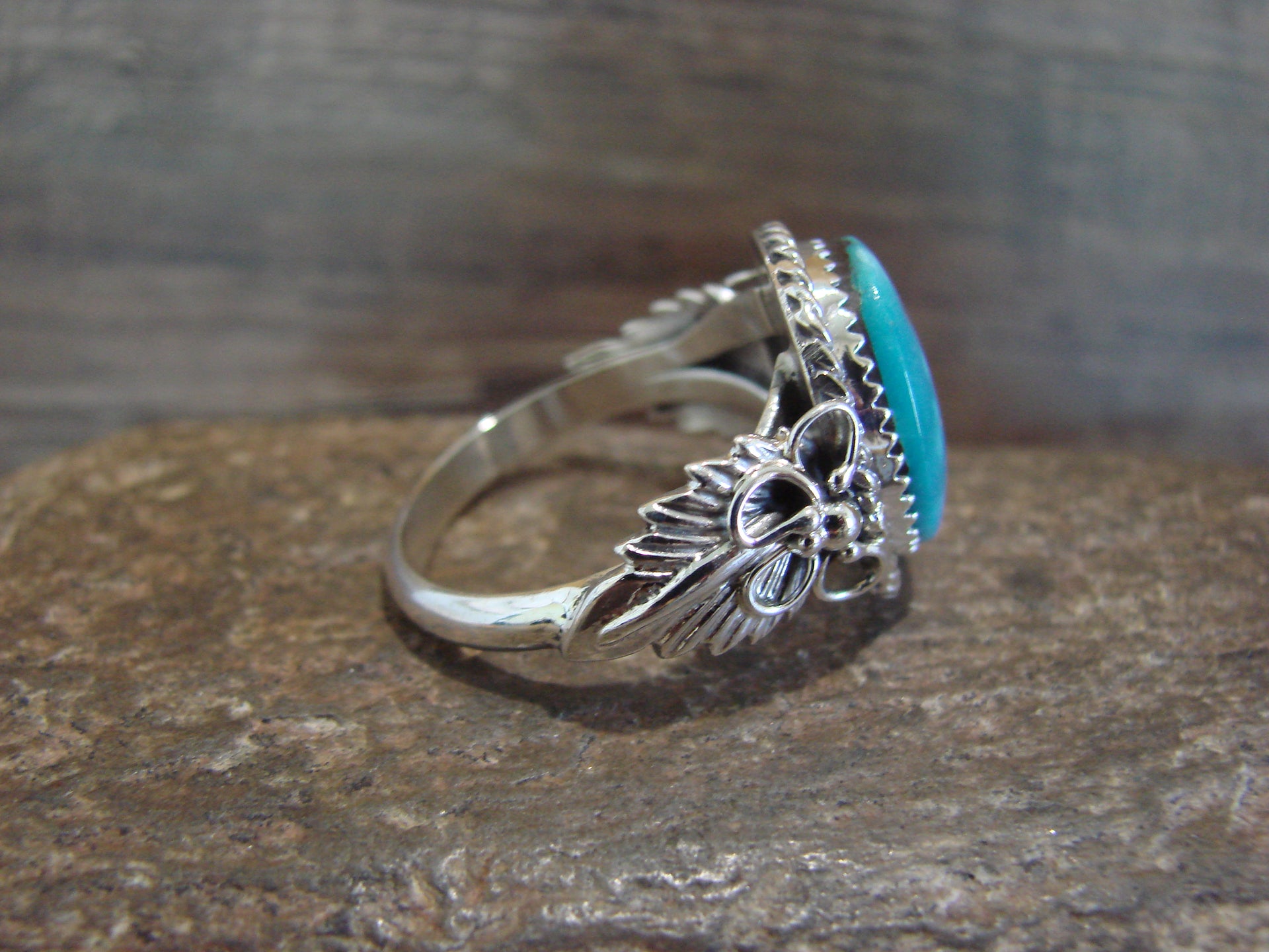 Native American Navajo Indian Sterling Silver & Turquoise Ring from Western New Mexico. This ring features a stunning Genuine Turquoise stone set into a crown Sterling Silver bezel setting. Surrounding the stone are Hand Stamped feathers and beautiful details in Sterling Silver. Polished to a bright shine, this is a very nice ring! Handmade by Navajo Silversmith Jeanette Saunders. Hallmarked on the back. Free shipping and gift box included!