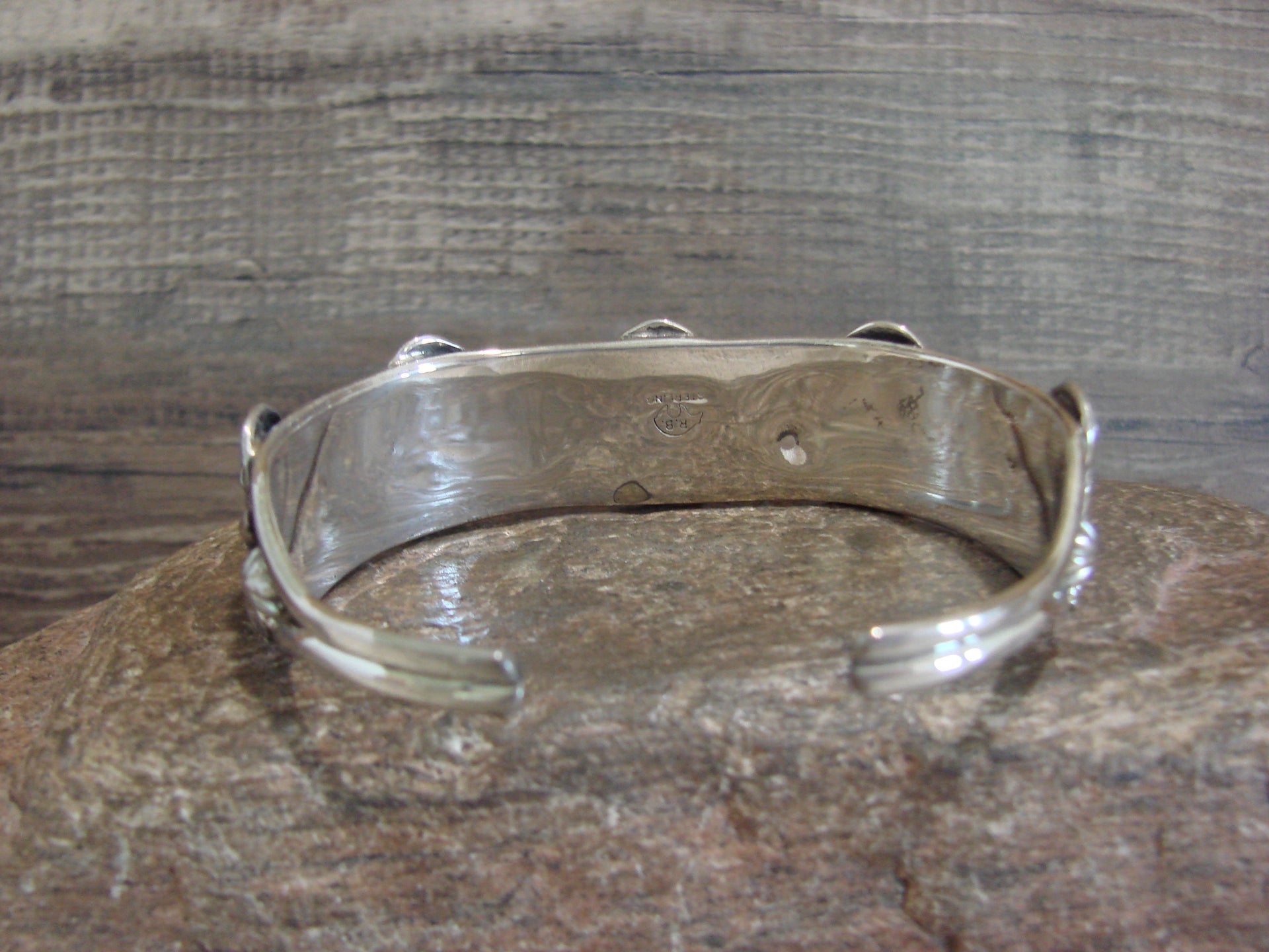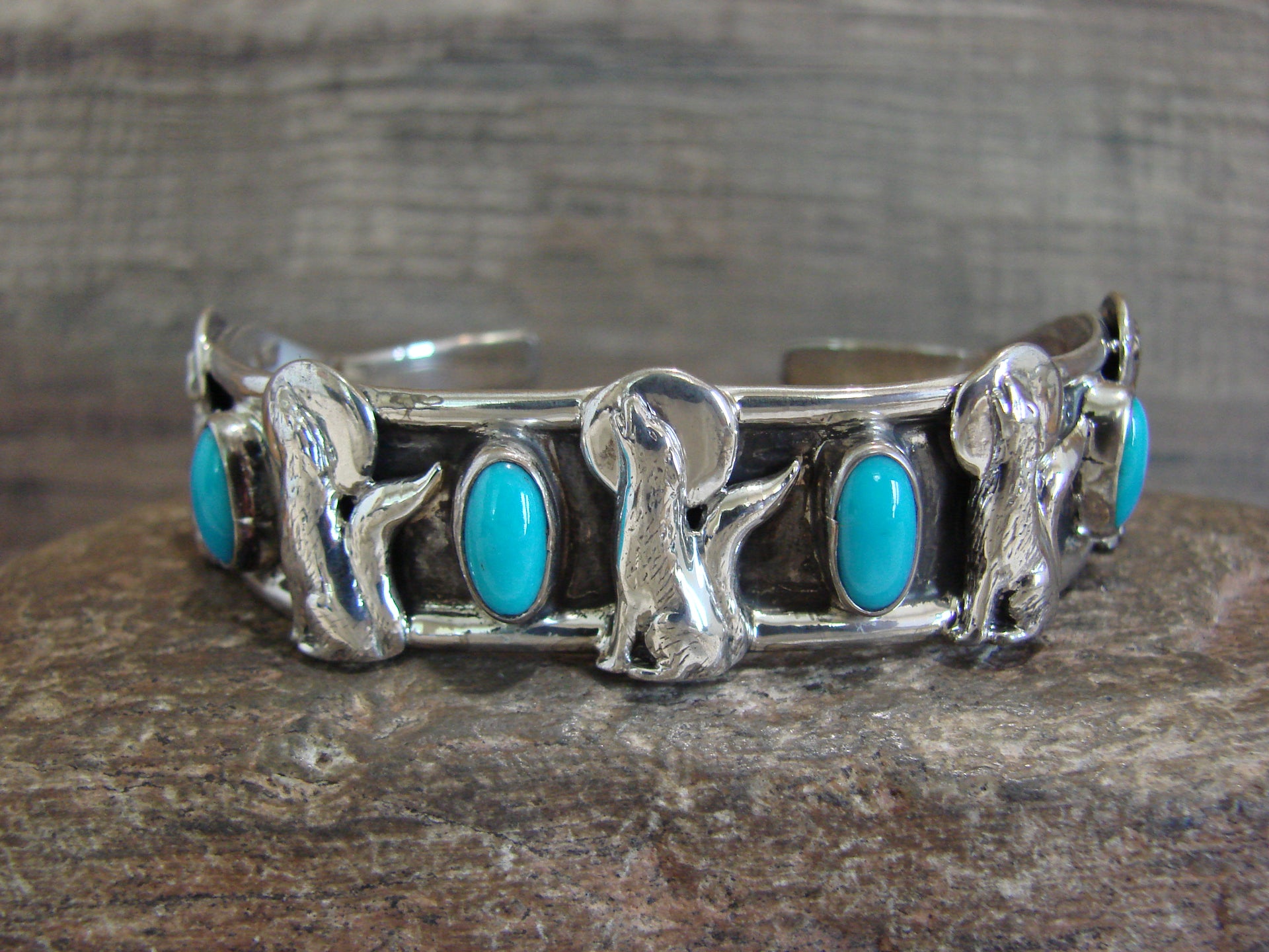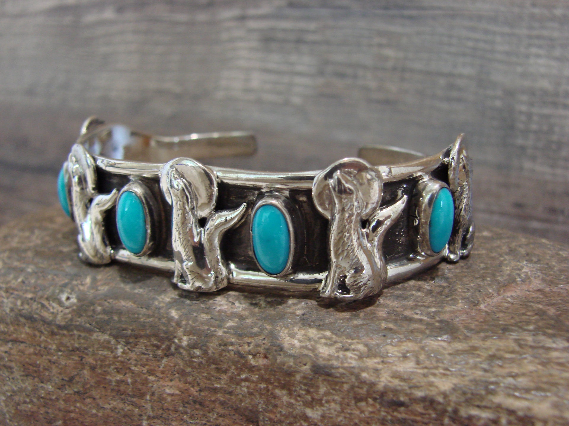 Genuine Native American Navajo Indian Sterling Silver & Turquoise Howling Wolf Bracelet from Western New Mexico. The focal point of this piece is 5 Stunning Howling Wolves cast in Sterling Silver. Accenting the Wolves are beautiful Turquoise stones intricately set into smooth Sterling Silver bezel settings. Sterling Silver Details, Hand Stamping, and Fine Navajo Silversmith workmanship quality makes this bracelet a beautiful hand made masterpiece! Navajo Indian handmade by Thomas Yazzie. Hallmarked on the back. Free gift box and shipping included!