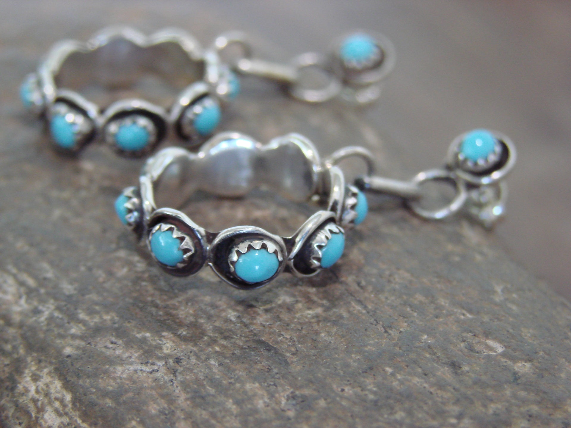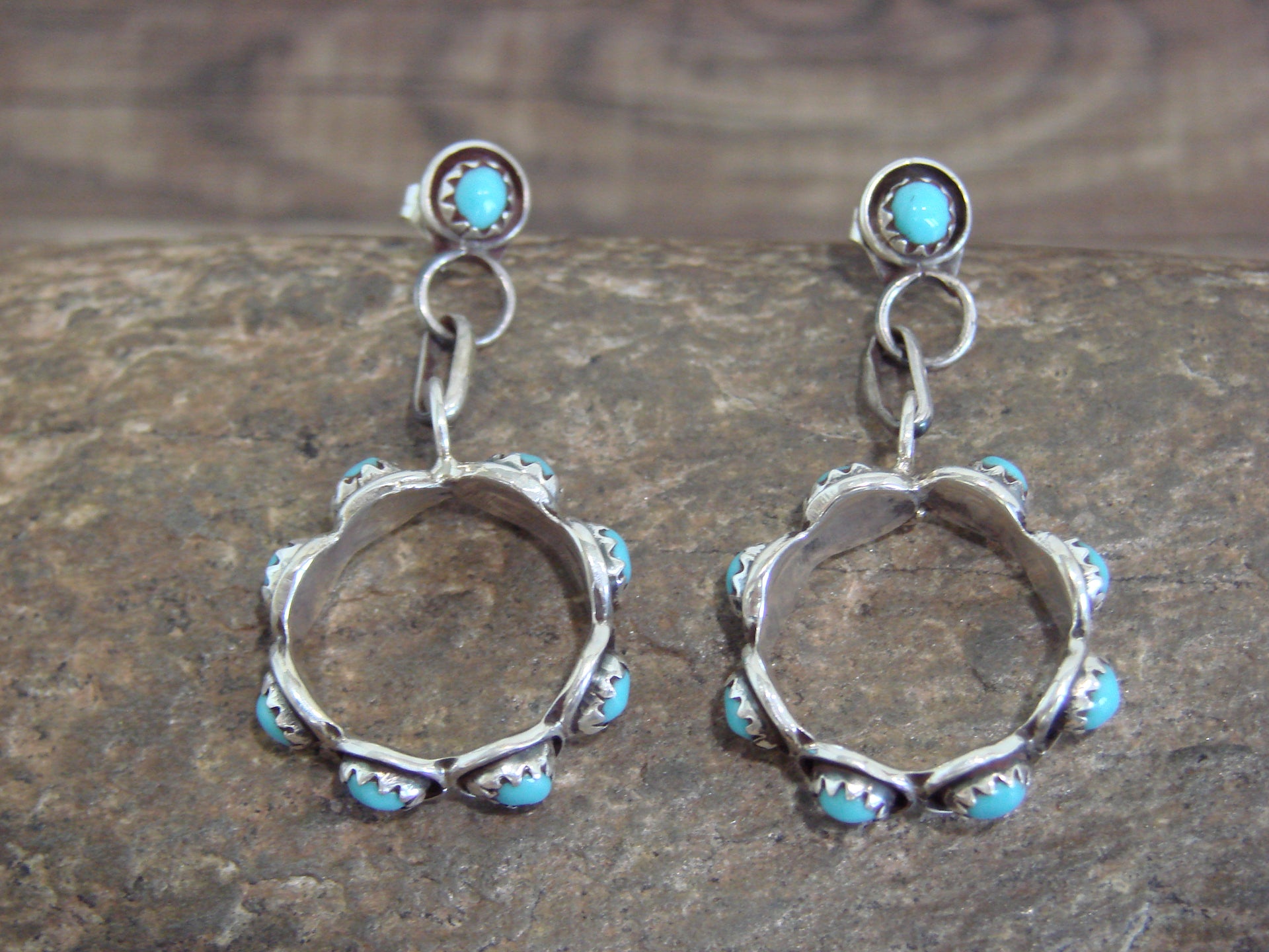 Genuine Native American Zuni Indian Sterling Silver & Turquoise Earrings from Western New Mexico. These Stunning Post Dangle style earrings feature Genuine Turquoise Stones beautifully set into crown sterling silver bezel shadowbox settings. This is a very nice pair of earrings! Zuni Indian handmade by Florenda Lonasee. Unsigned. Free Shipping with a gift box included!
