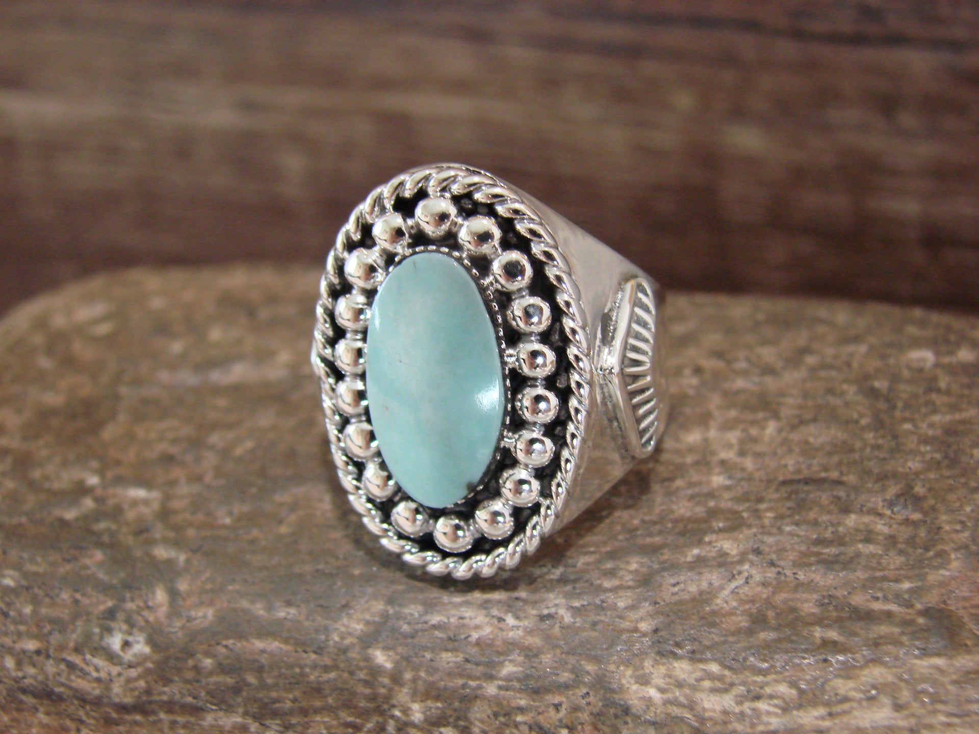 Genuine Native American Navajo Indian Sterling Silver & Turquoise Ring from Western New Mexico. This Stunning ring features a High Quality, Genuine Turquoise Stone set into a Sterling Silver bezel setting. Beautiful details in Sterling Silver surround the stone. This ring is Gorgeous! Handmade to Perfection by Navajo silversmith Charlene Yazzie. Unsigned. Free shipping and gift box included!