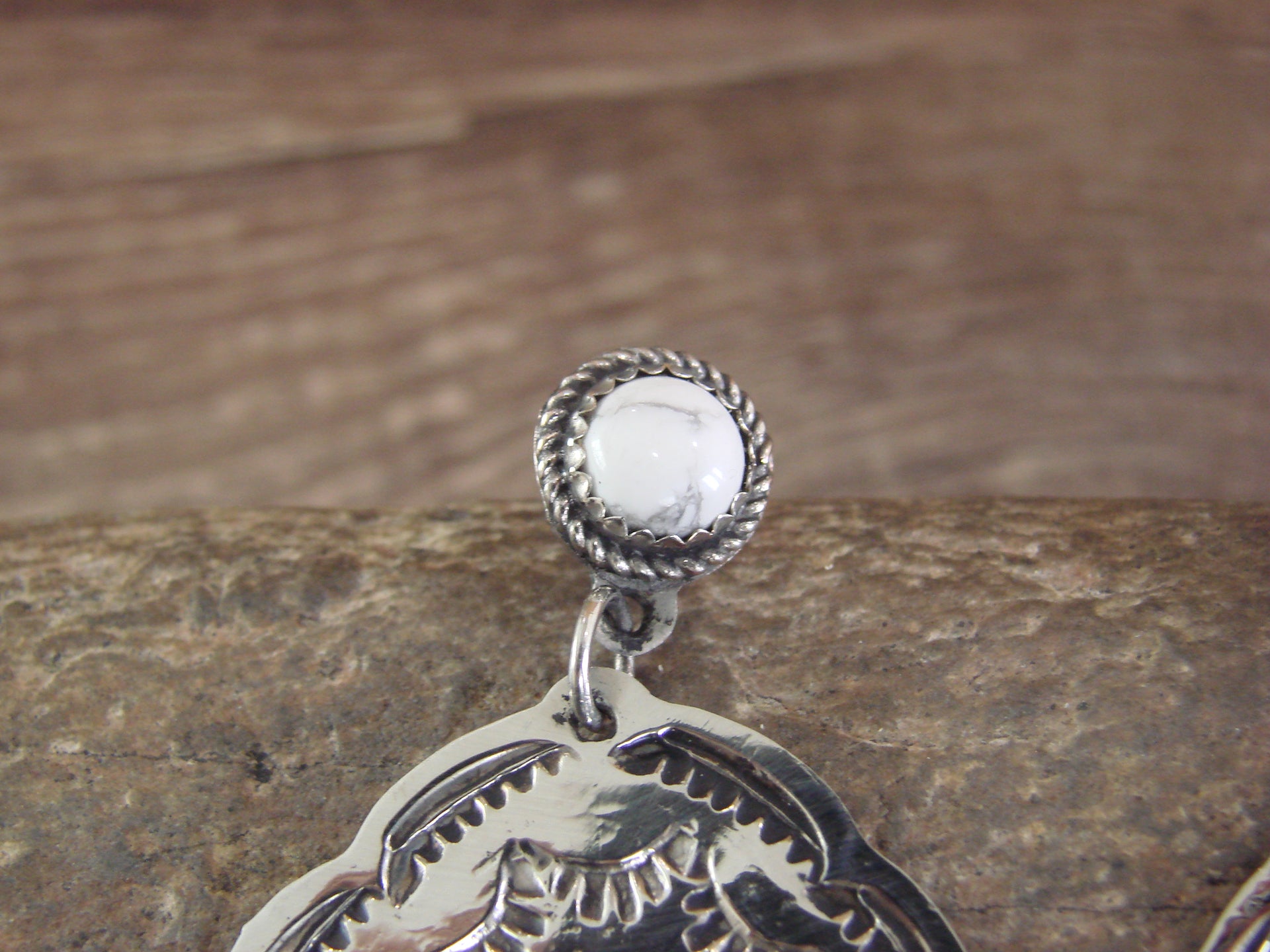 Native American Navajo Indian Nickel Silver Hand Stamped Nickel Silver HowlitePost Dangle Earrings from Western New Mexico. This is a great looking pair of Post Dangle earrings. These Nickel Silver earrings feature Howlite posts accented with Stunning hand stamped Nickel Silver dangles. Handmade by well known Navajo Silversmith Jackie Cleveland. Signed "JC" on the back. Free Shipping with a Gift Box included!