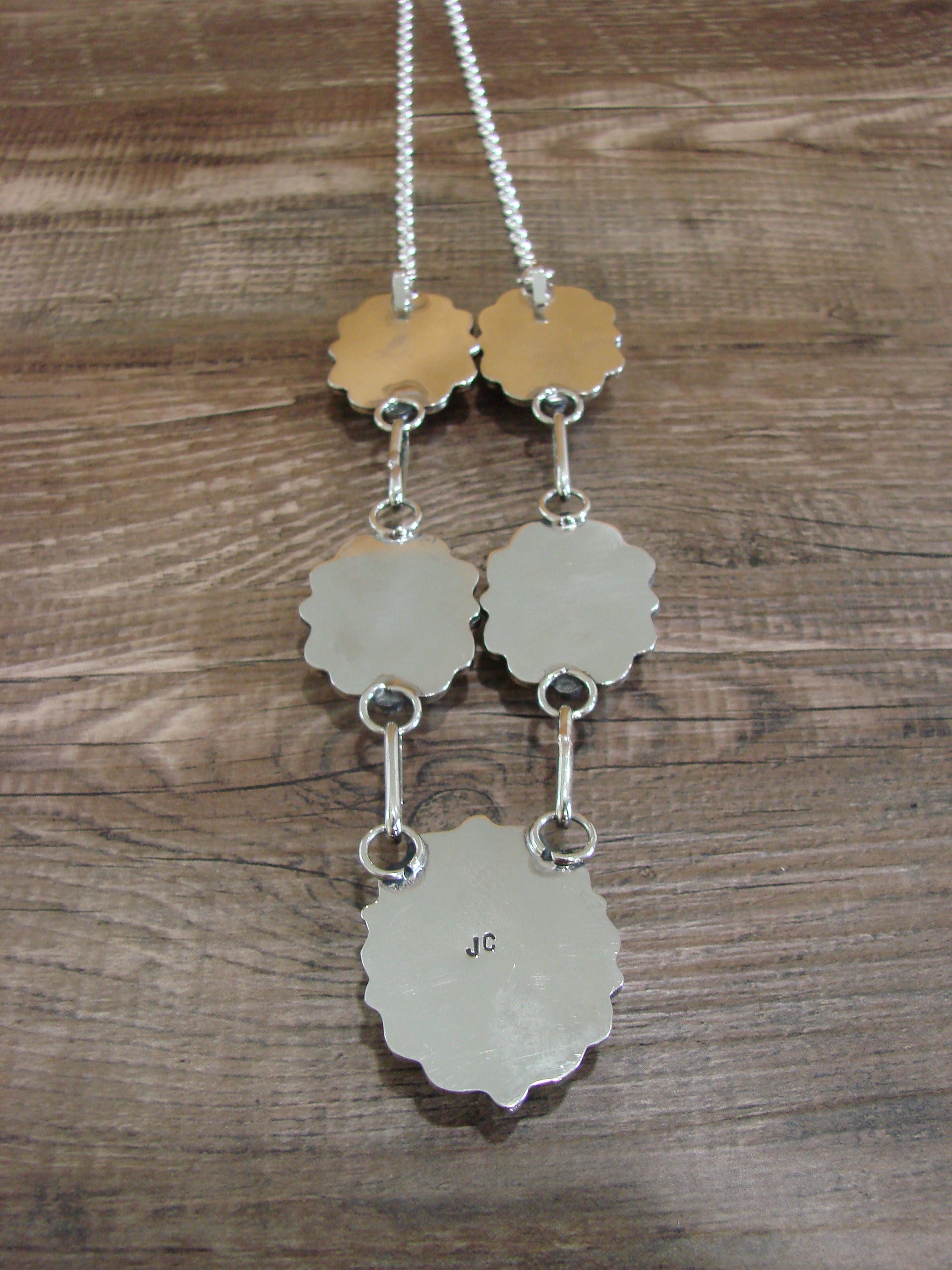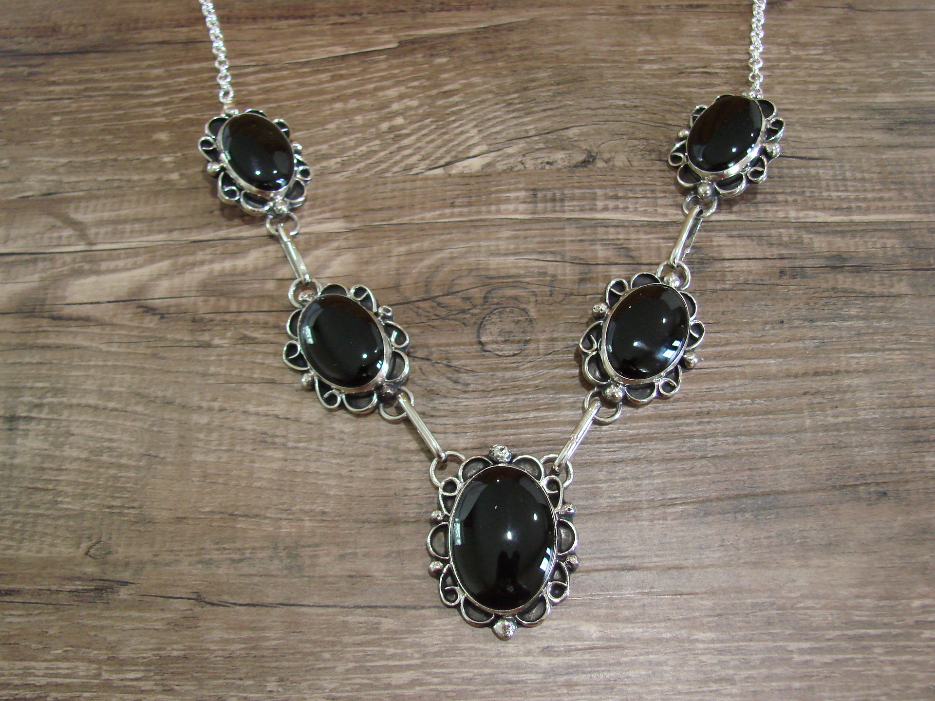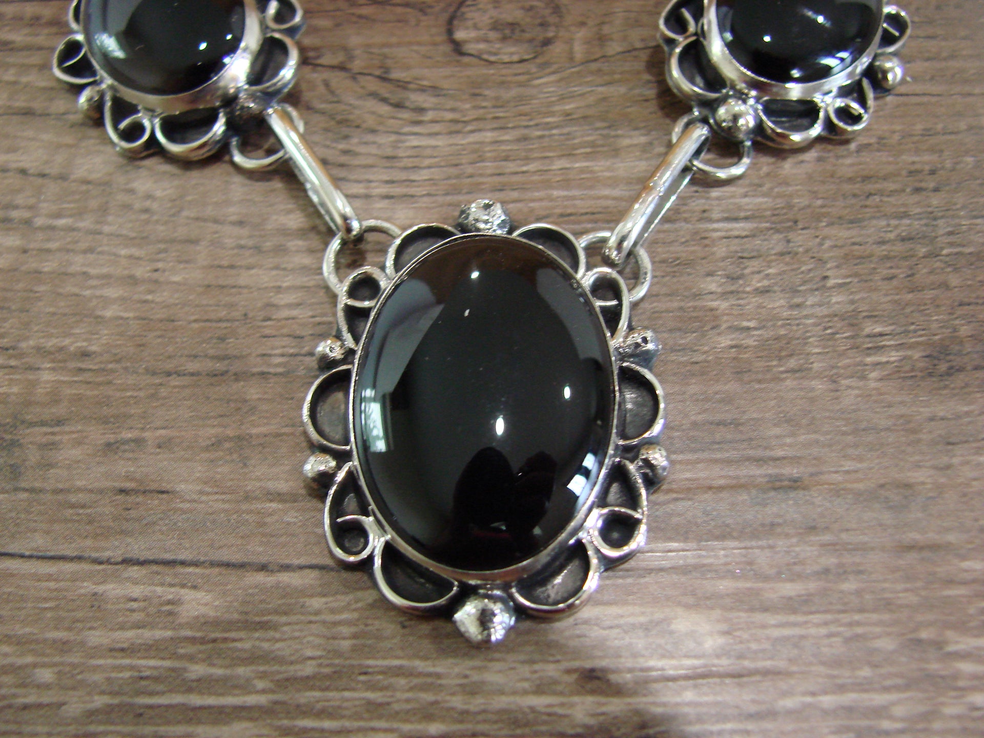 Native American Navajo Indian Nickel Silver & Onyx Chain Link Necklace. This Stunning Hand Made necklace features Onyx Stones intricately set into smooth Nickel Silver bezel settings. Beautiful details in Nickel Silver surround the stones. This is a great necklace that can be adjusted to desired length with the Hade Made Sterling Silver links! This is a great combination of both Nickel Silver & Sterling Silver (Chain). Handmade by Navajo silversmith Jackie Cleveland. Signed "JC" on the back. Free gift box and shipping included!