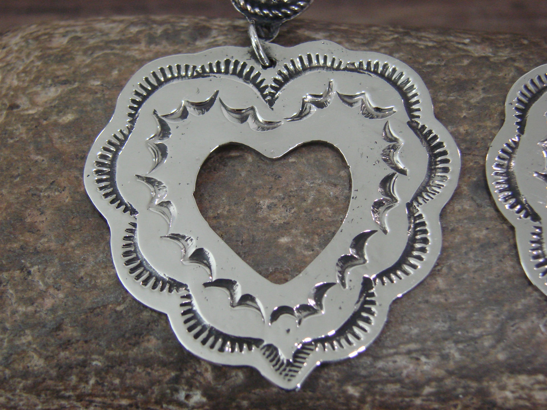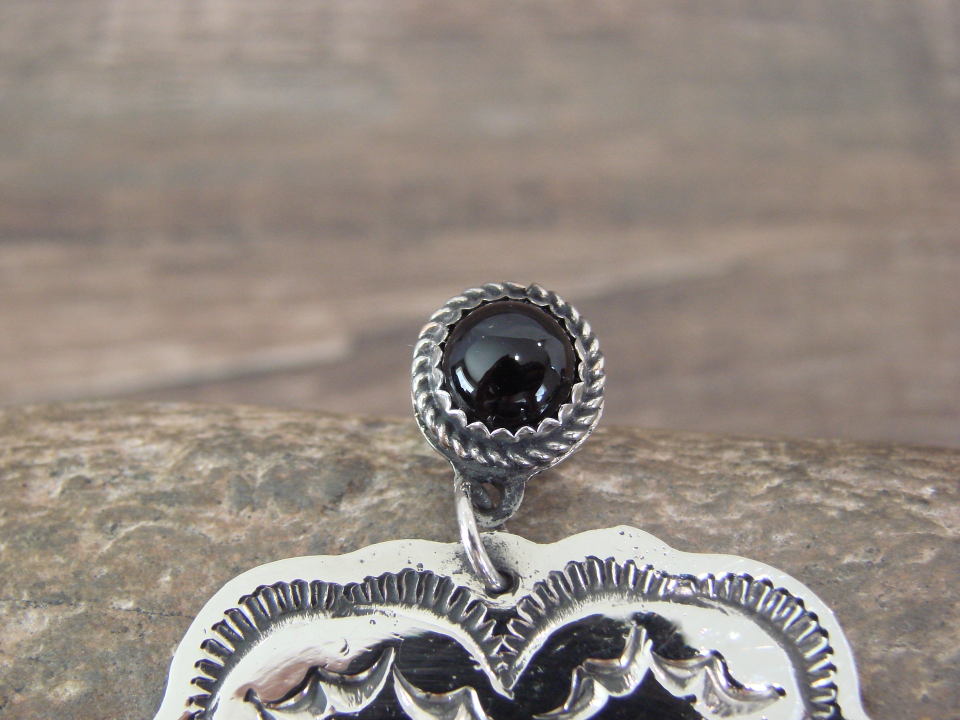 Native American Navajo Indian Nickel Silver Hand Stamped Black Onyx Heart Post Dangle Earrings from Western New Mexico. This is a great looking pair of Post Dangle earrings. These Nickel Silver Heart earrings are accented with decorative hand stamped design. Handmade by well known Navajo Silversmith Jackie Cleveland. Signed "JC" on the back. Free Shipping with a Gift Box!