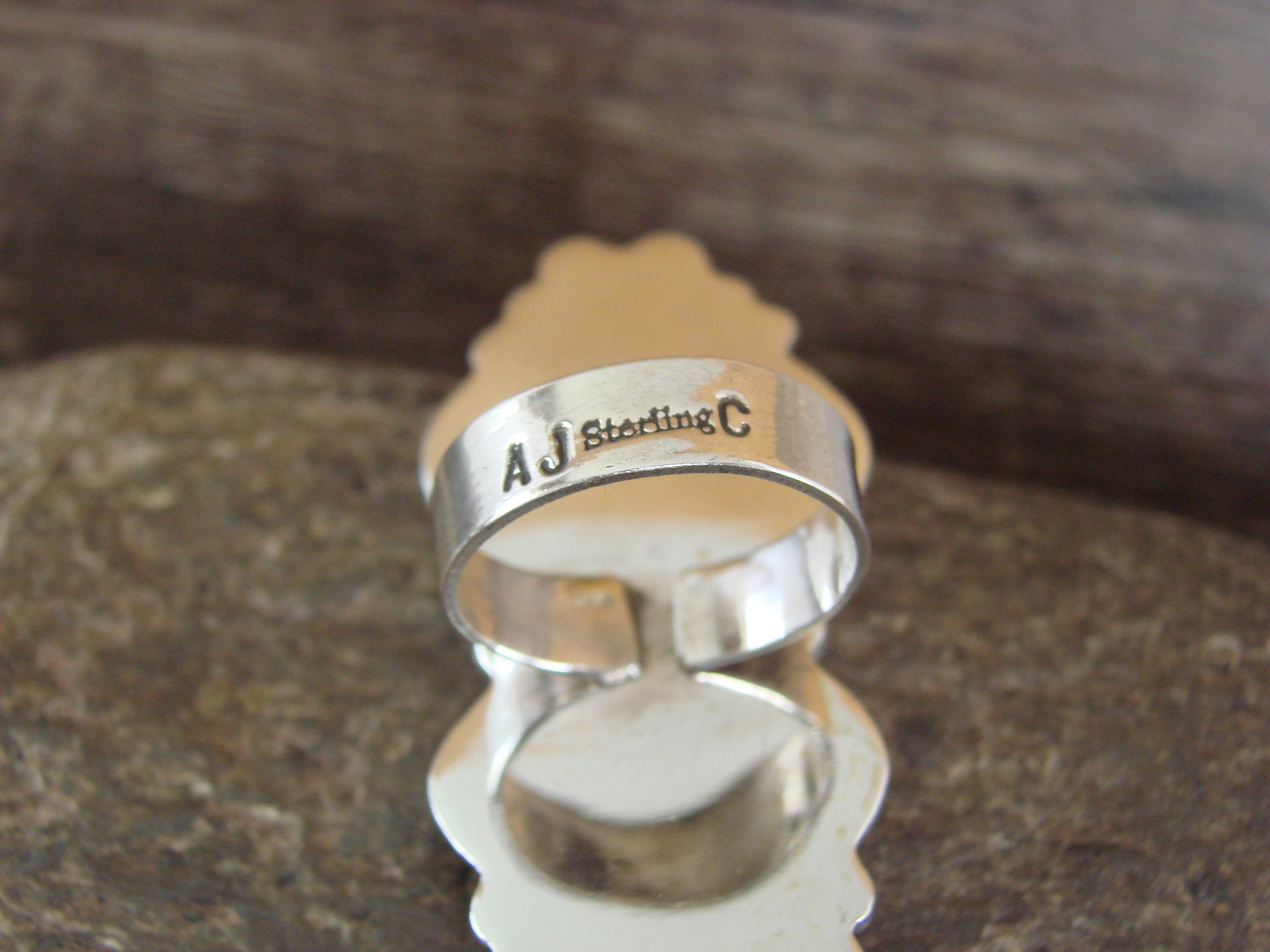 Large Native American Navajo Indian Sterling Silver Turquoise & Apple Coral Ring from Western New Mexico. This Genuine ring features two beautiful stones. The stones are set into very nice crown Sterling Silver bezel settings and accented with Sterling Silver details. The band is adjustable from size 10 to 12. This ring is Stunning! Navajo Indian handmade by Silversmith Jackie Cleveland. Signed "AJC" and stamped "Sterling" on the back. Free Shipping included!