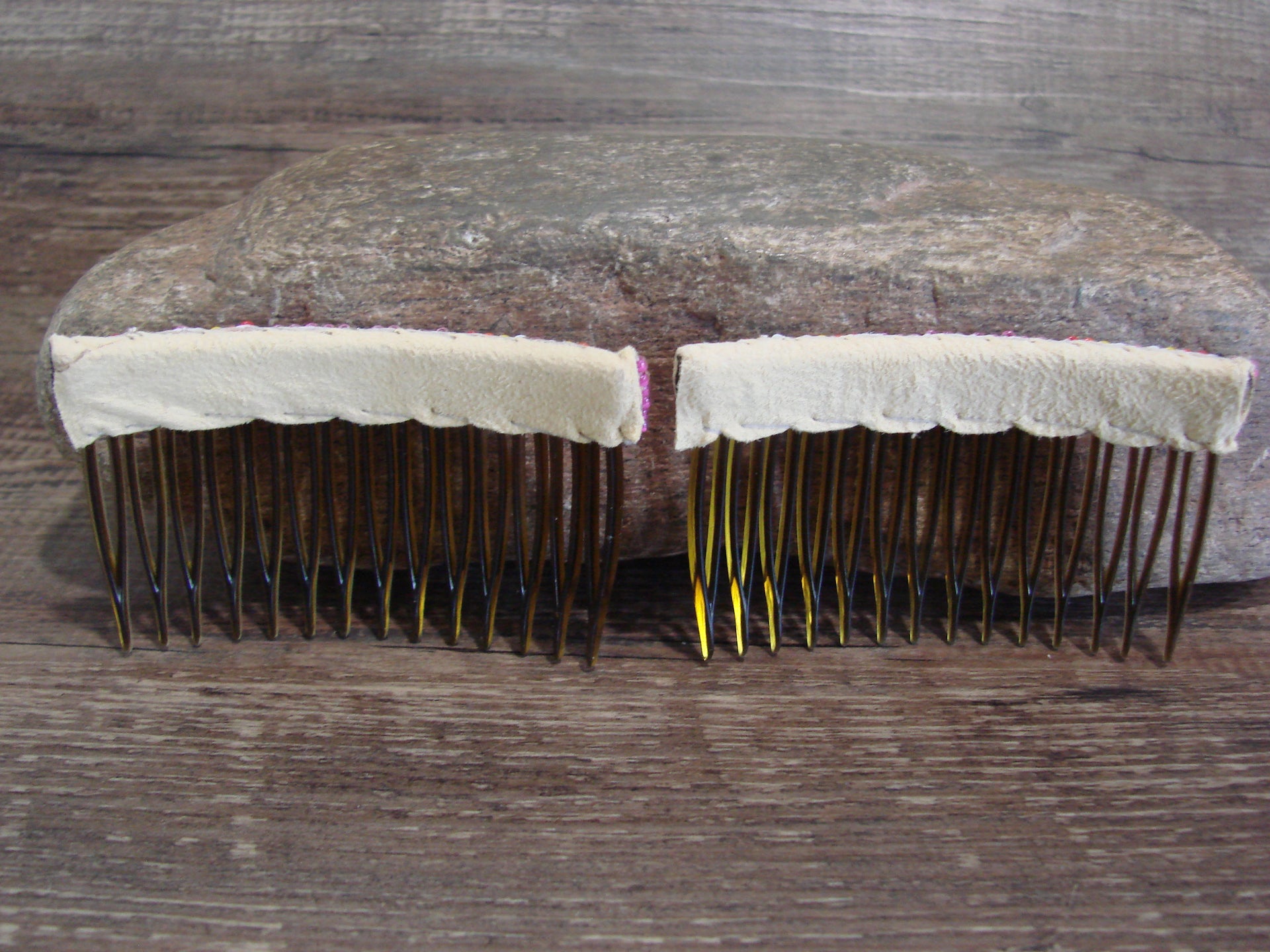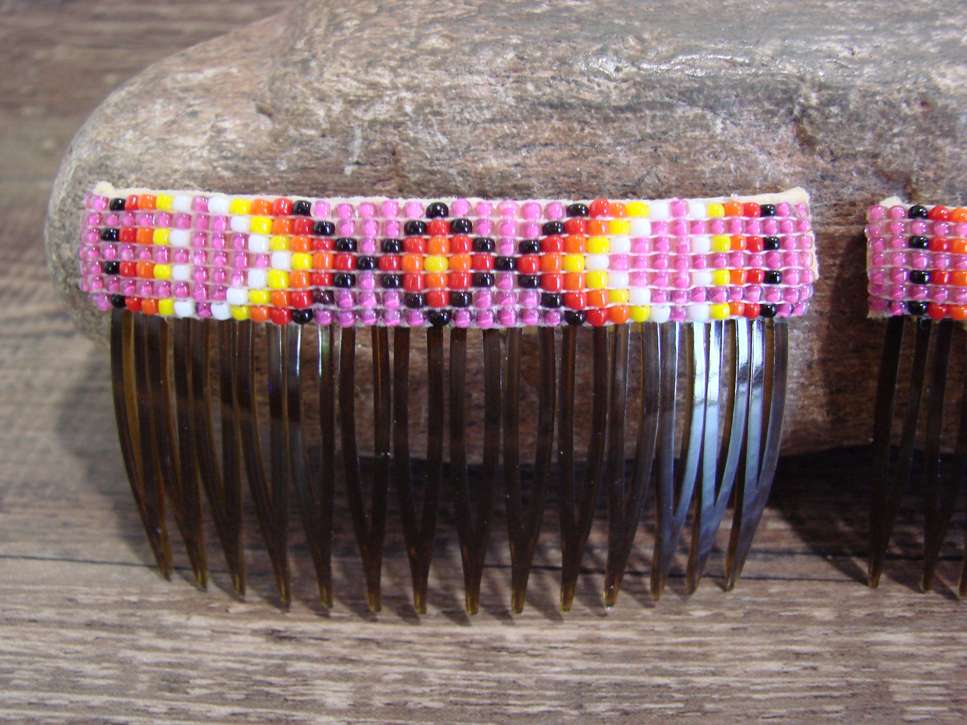 Genuine Native American Navajo Indian Hand Beaded Comb Set from Western New Mexico. Each Comb features a beautiful beaded design at top. The colors are very vibrant and have a great look. Handmade by Navajo Silversmith Raven Cleveland. This comb set is Genuine and Stunning! Free Shipping with a gift box included!