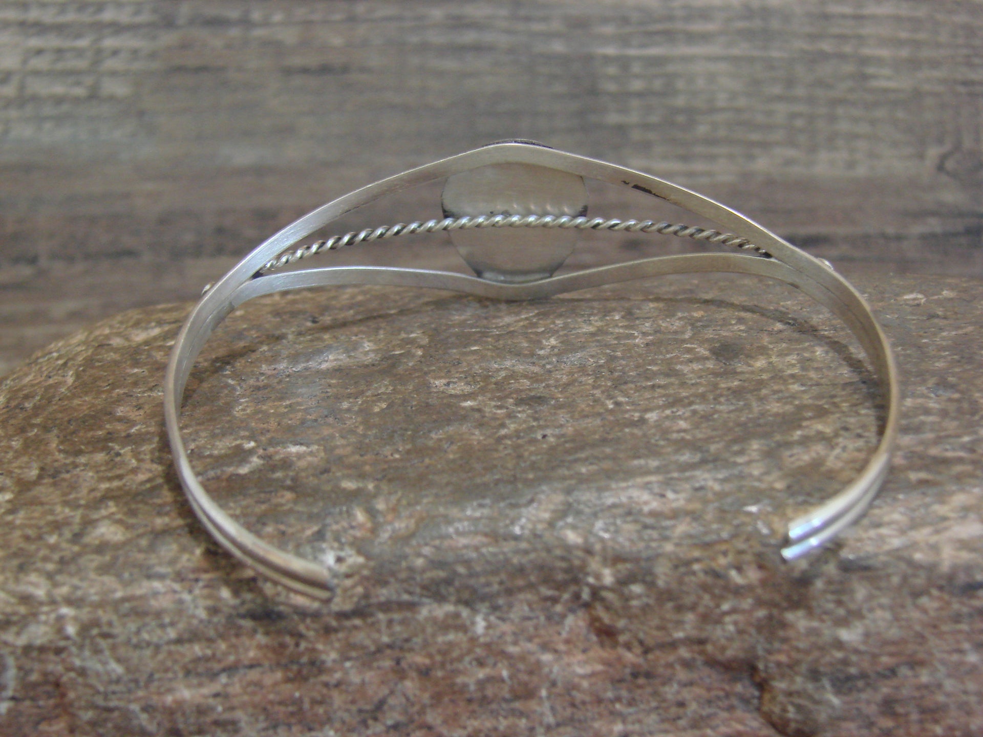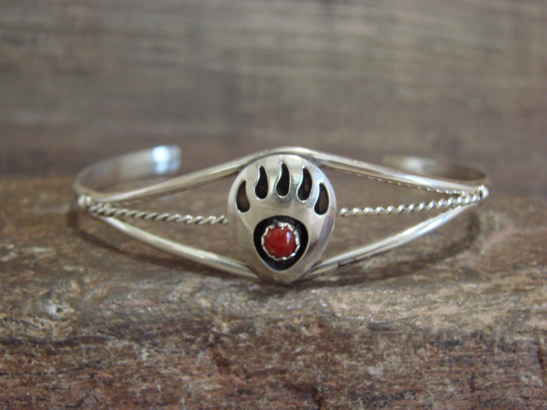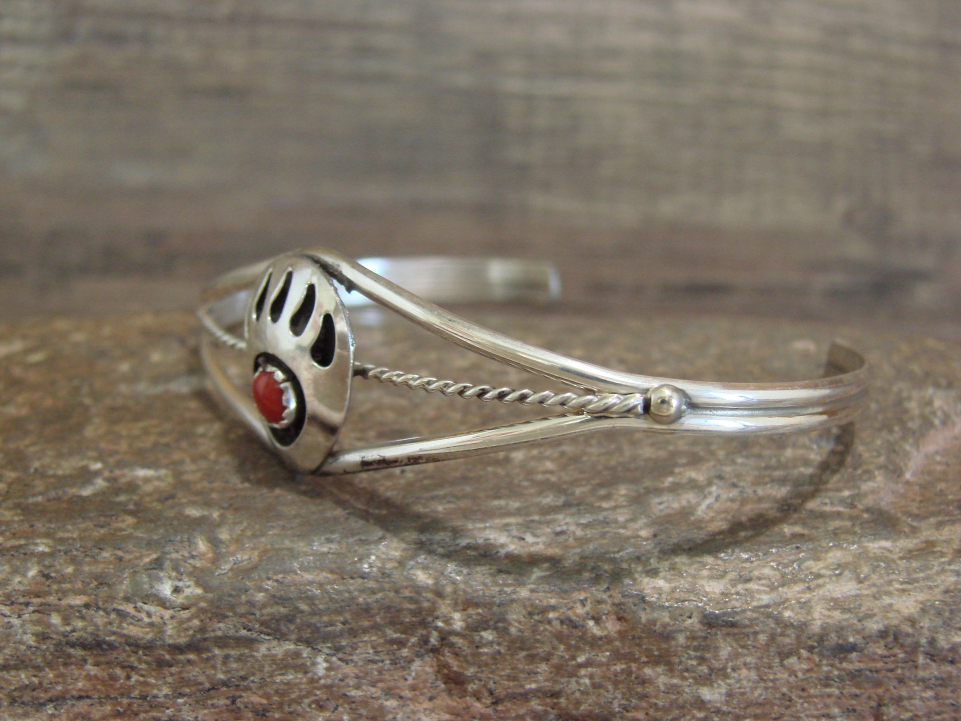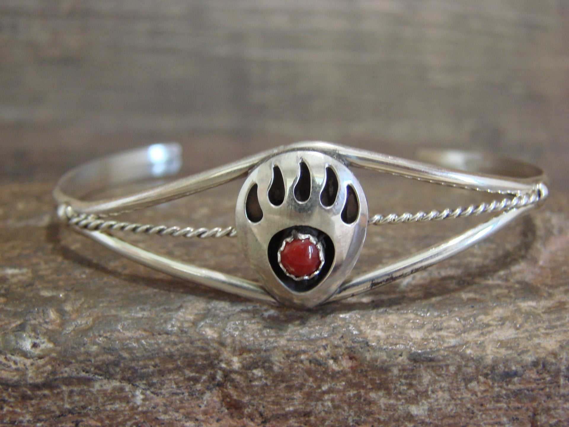 Native American Navajo Indian Sterling Silver Coral Bear Paw Bracelet from Western New Mexico. This bracelet features a Coral stone set in a crown sterling silver bear paw shadow box. The stone is polished and surrounded by beautiful sterling silver work. This is a lighter weight, dainty style of bracelet. The bracelet is made by Janice Spencer. Free shipping and gift box included!
