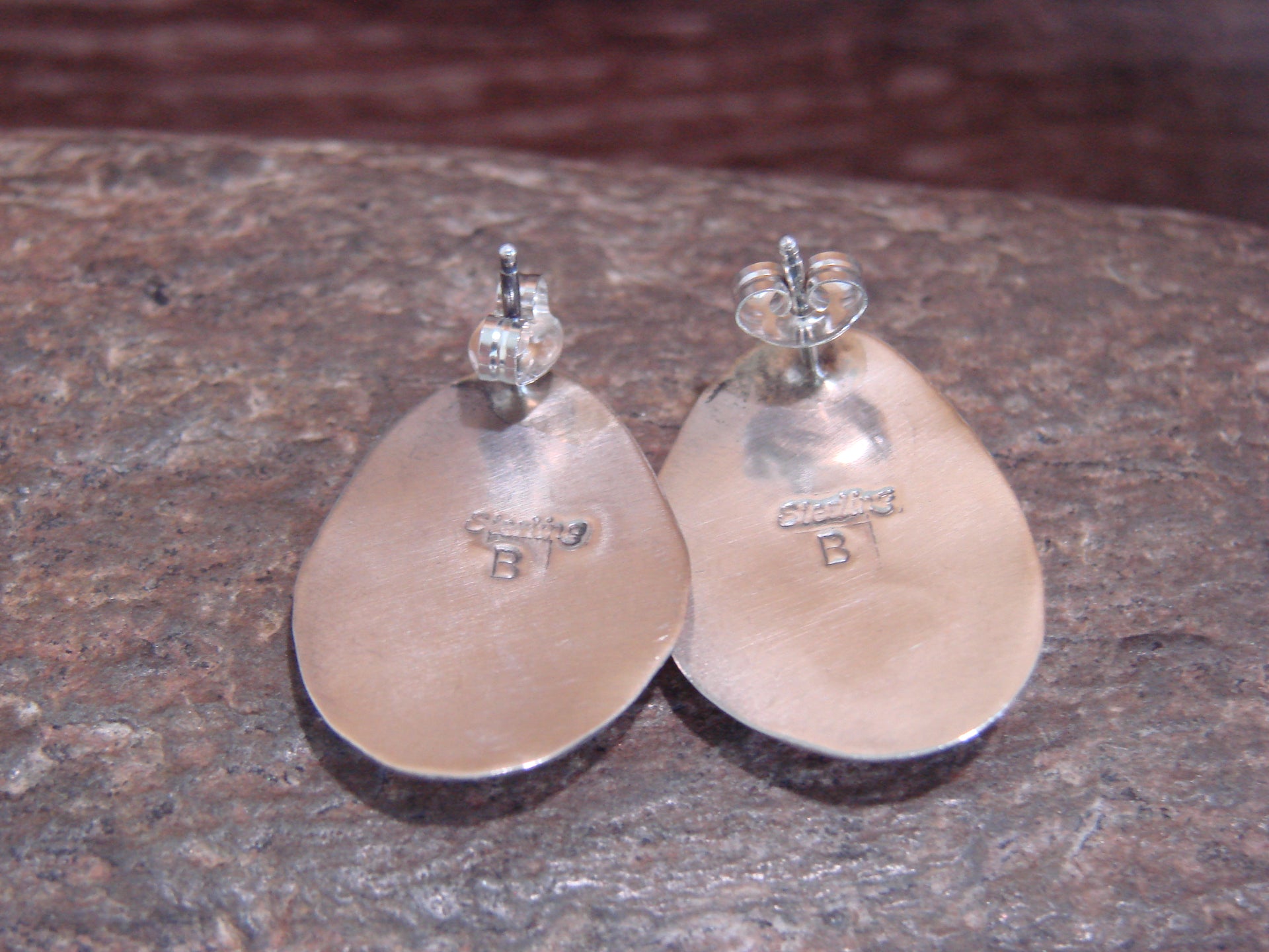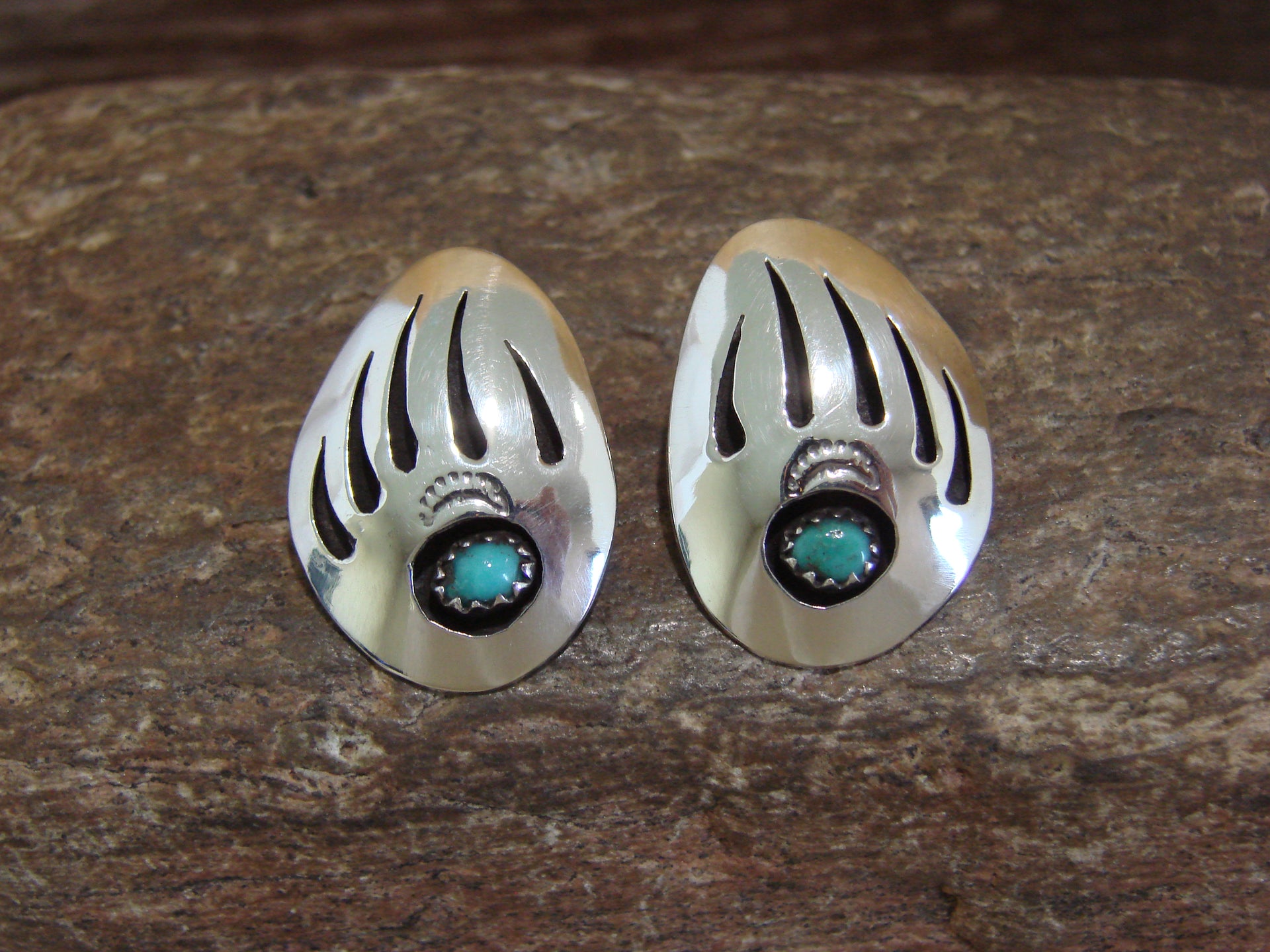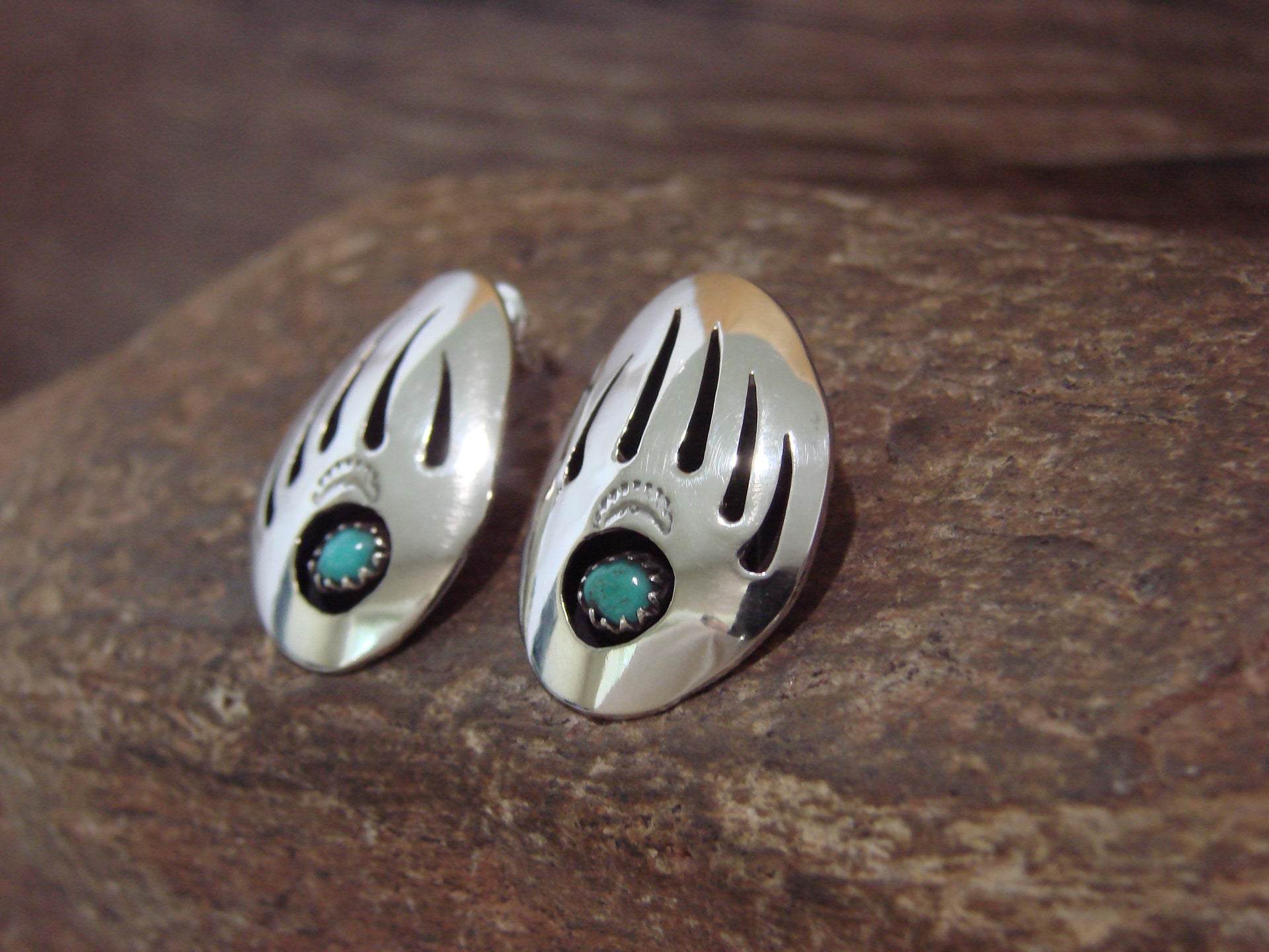 Native American Navajo Indian Turquoise Bear Paw Post Earrings from Western New Mexico. These earrings feature a Turquoise stone set into a beautiful Hand Stamped sterling silver setting. The Bear Paw is cut out around the stone giving these a shadow box look. Navajo Indian hand made by Ervin Begay. Signed & Stamped "Sterling" on the back. Free Shipping and Gift Box included!