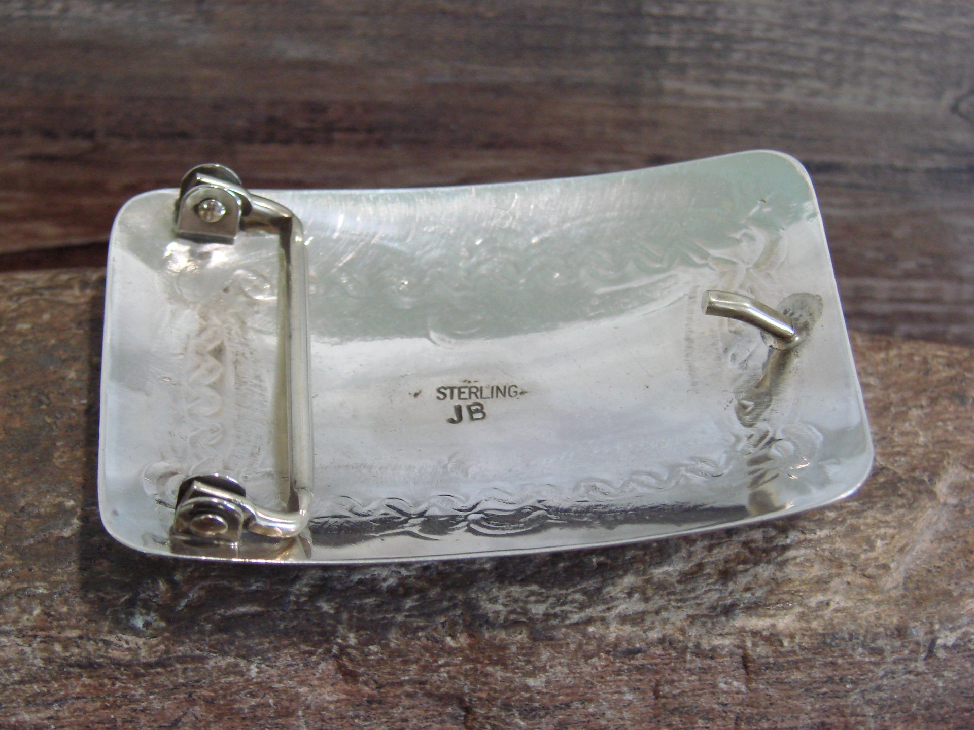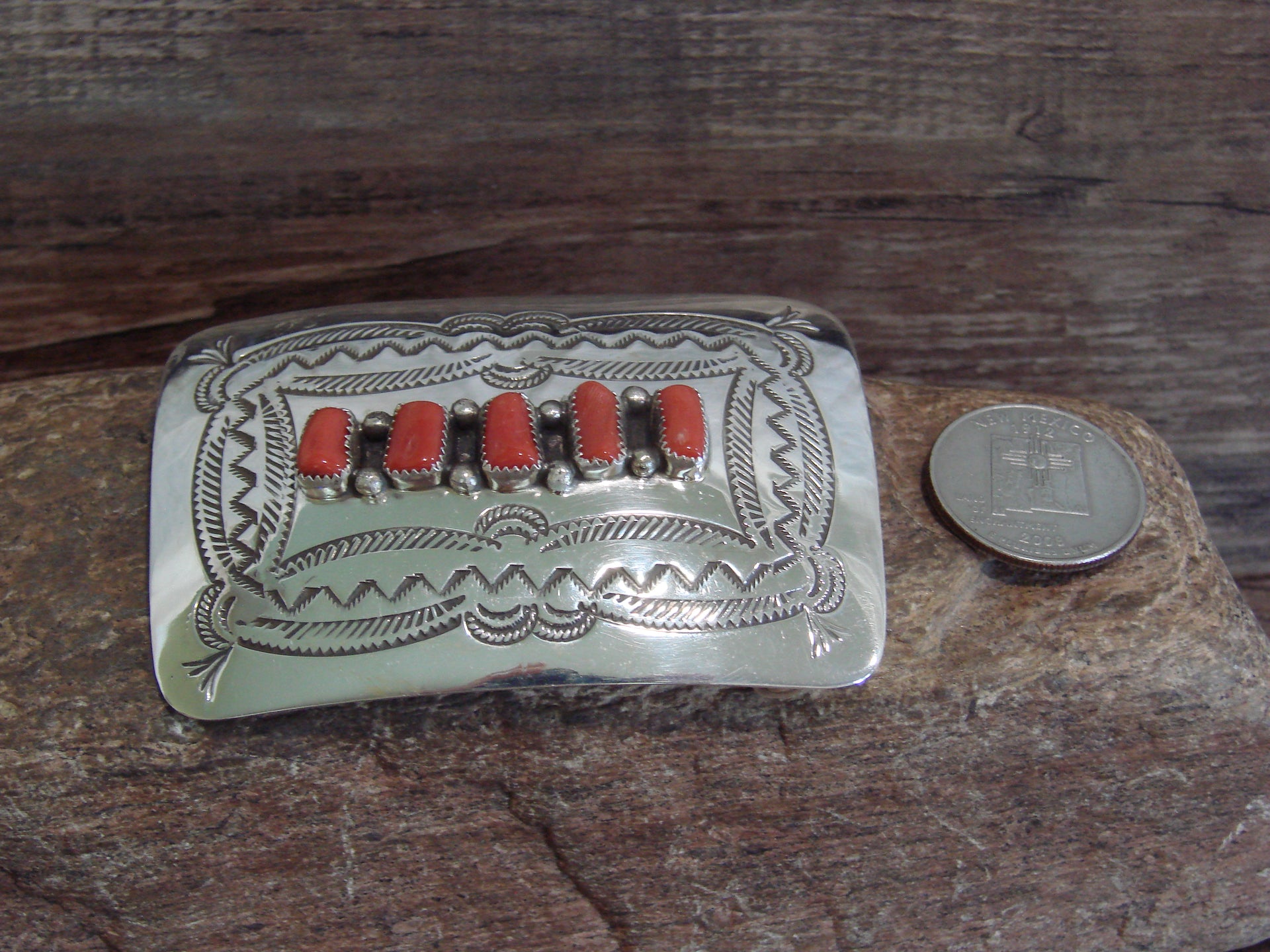 Genuine Native American Navajo Indian Hand Stamped Sterling Silver & Coral Row Belt Buckle from Western New Mexico. This Stunning buckle features 5 Genuine Coral stones intricately set into crown Sterling Silver bezel Settings. Gorgeous Hand Stamping Surround the Stones. This is a beautiful Sterling Silver Buckle! Navajo Indian handmade by J. Begay. Signed "JB" and Stamped "Sterling" on the back. Free shipping and gift box included!