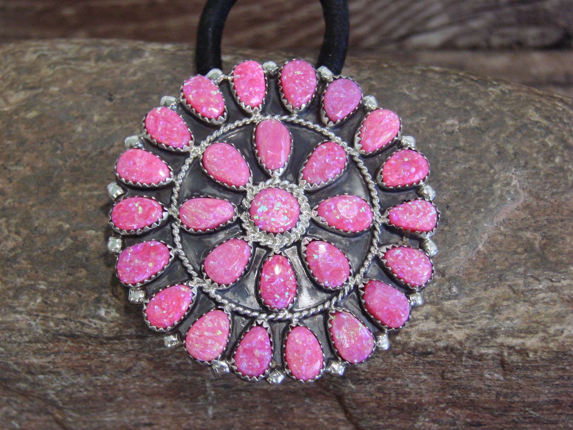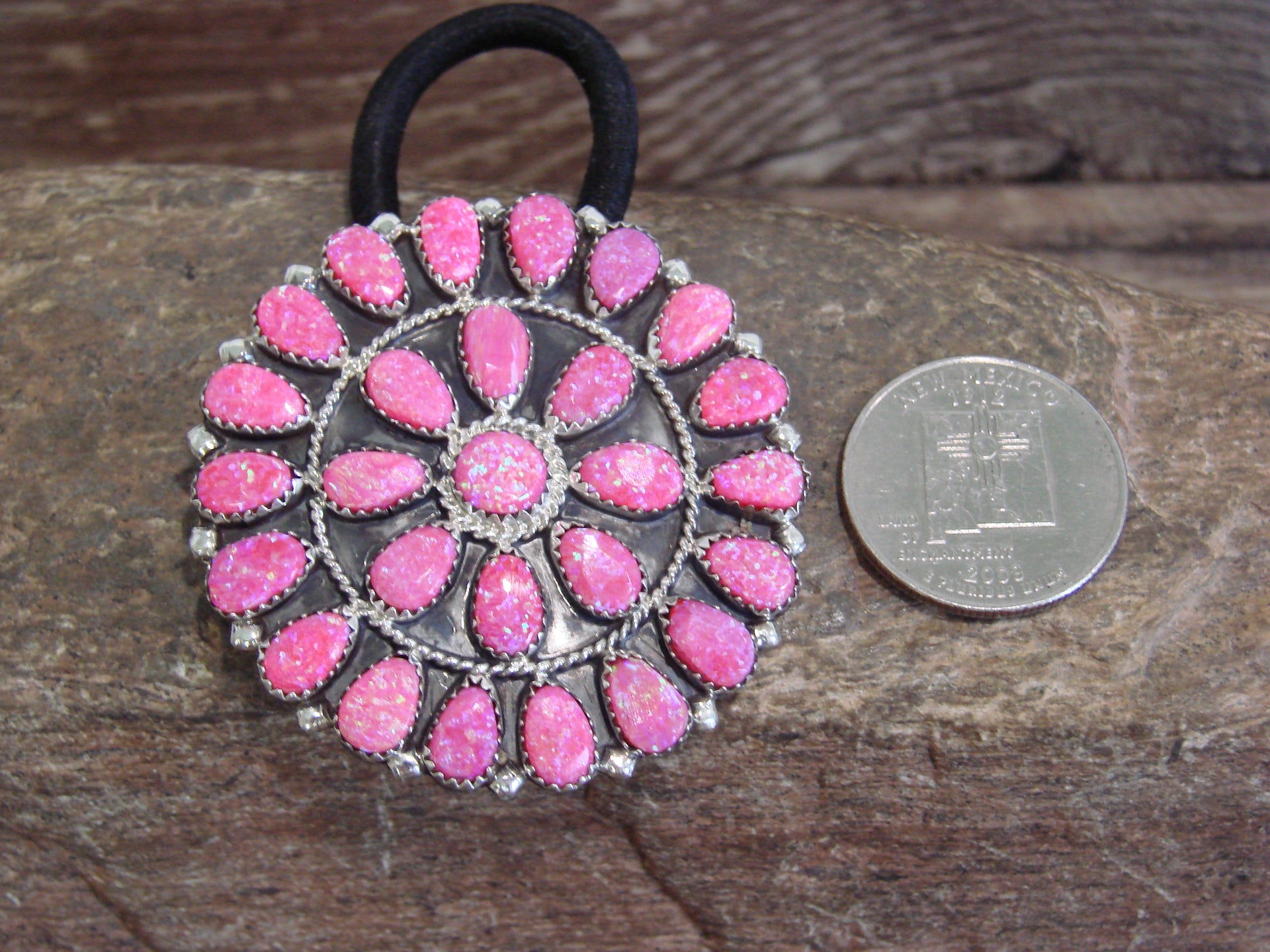 Genuine Native American Navajo Indian Sterling Silver & Pink Opal Cluster Hair Tie from Western New Mexico. This Stunning Hair Tie features a cluster of Pink Opal Stones beautifully set into crown sterling silver bezel settings. Gorgeous Sterling Silver details surround the stones. Fine Navajo Silversmith workmanship quality makes this Hair Tie a beautiful hand made masterpiece! Handmade and Signed by Navajo artist "DLW". Stamped Sterling on the back. Free Shipping with a Gift Box included!