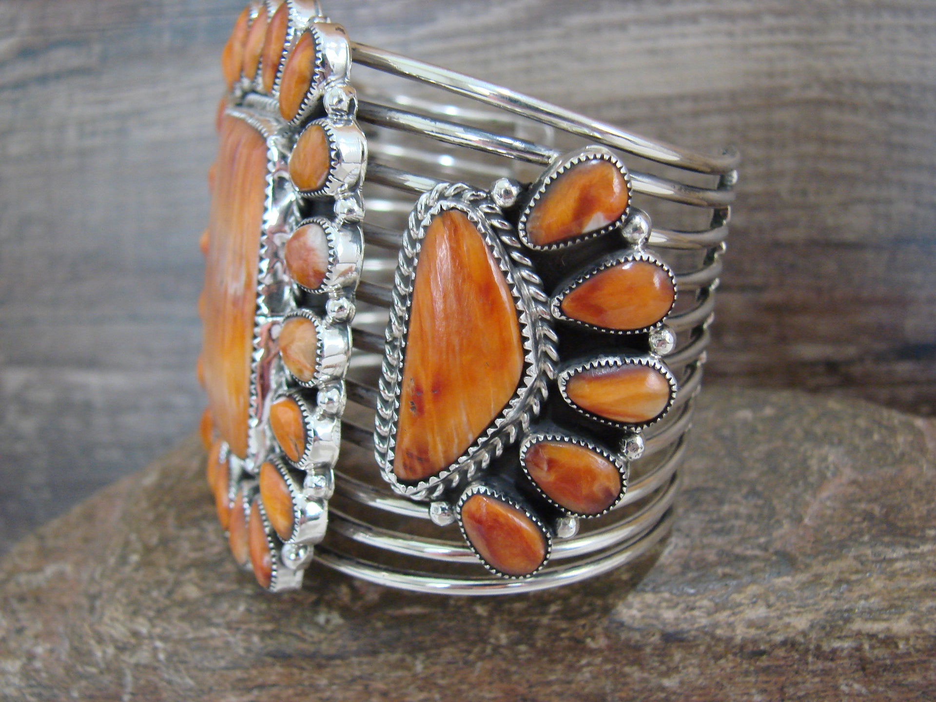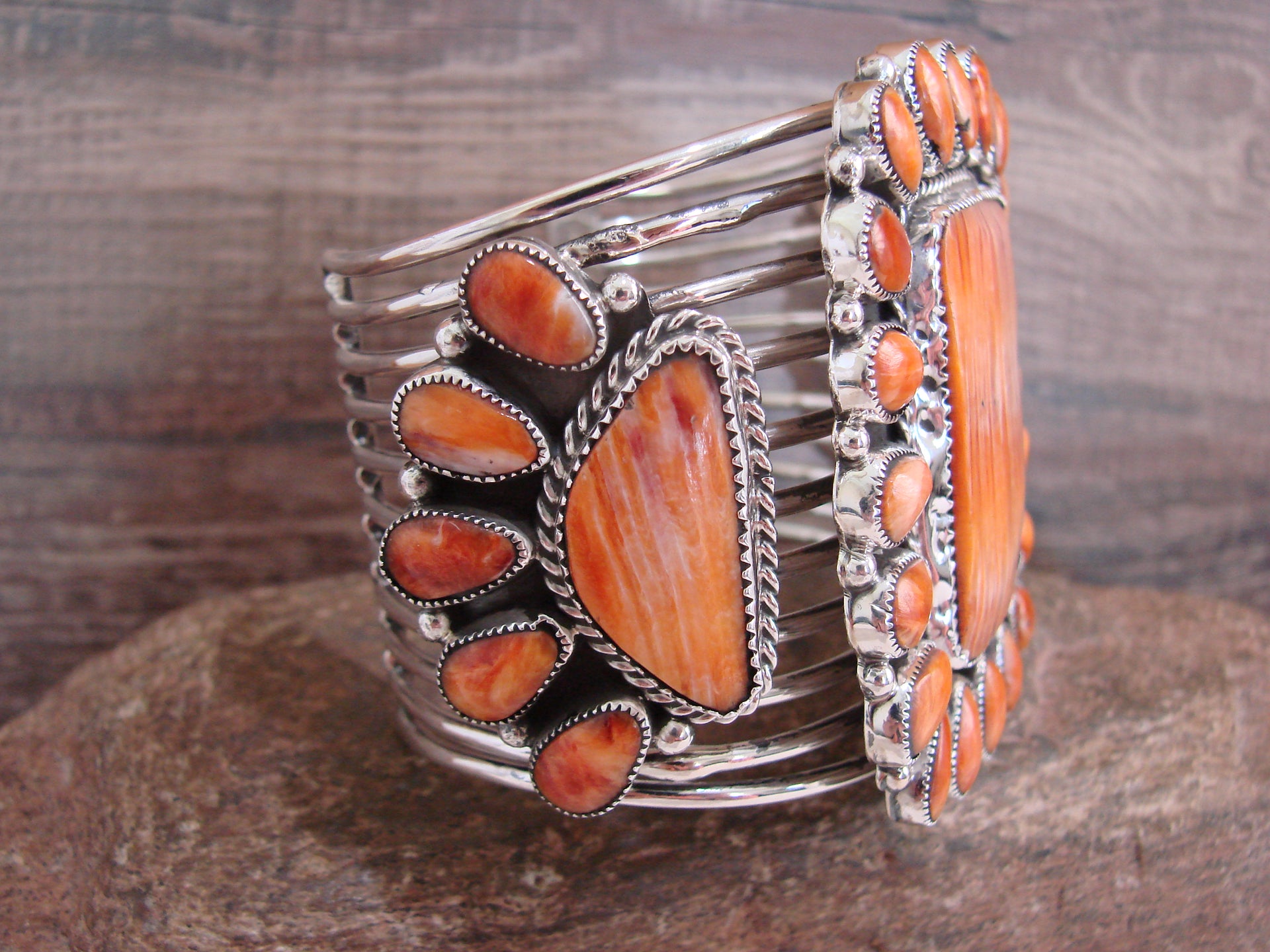 Native American Sterling Silver & Spiny Oyster Cluster Bracelet Cuff Signed E.W.