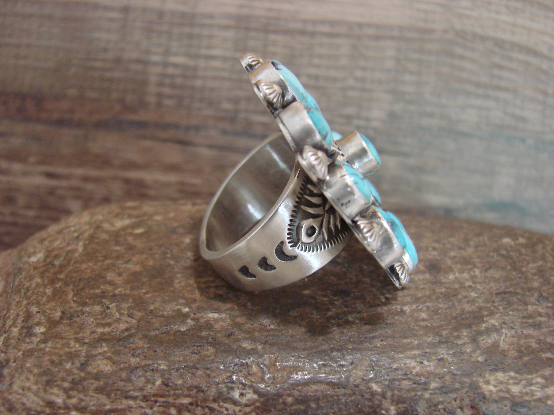 Genuine Native American Navajo Indian Sterling Silver & Turquoise Cluster Ring from Western New Mexico. This Gorgeous ring features Genuine Turquoise stones set into smooth Sterling Silver bezel settings. Surrounding the stones are beautiful Hand Stamping and details in Sterling Silver. The stones are polished and have a Stunning look! Handmade by Navajo Silversmith Tom Lewis. Signed "tom Lewis" and Stamped "Sterling" on the back. Free gift box and shipping included!