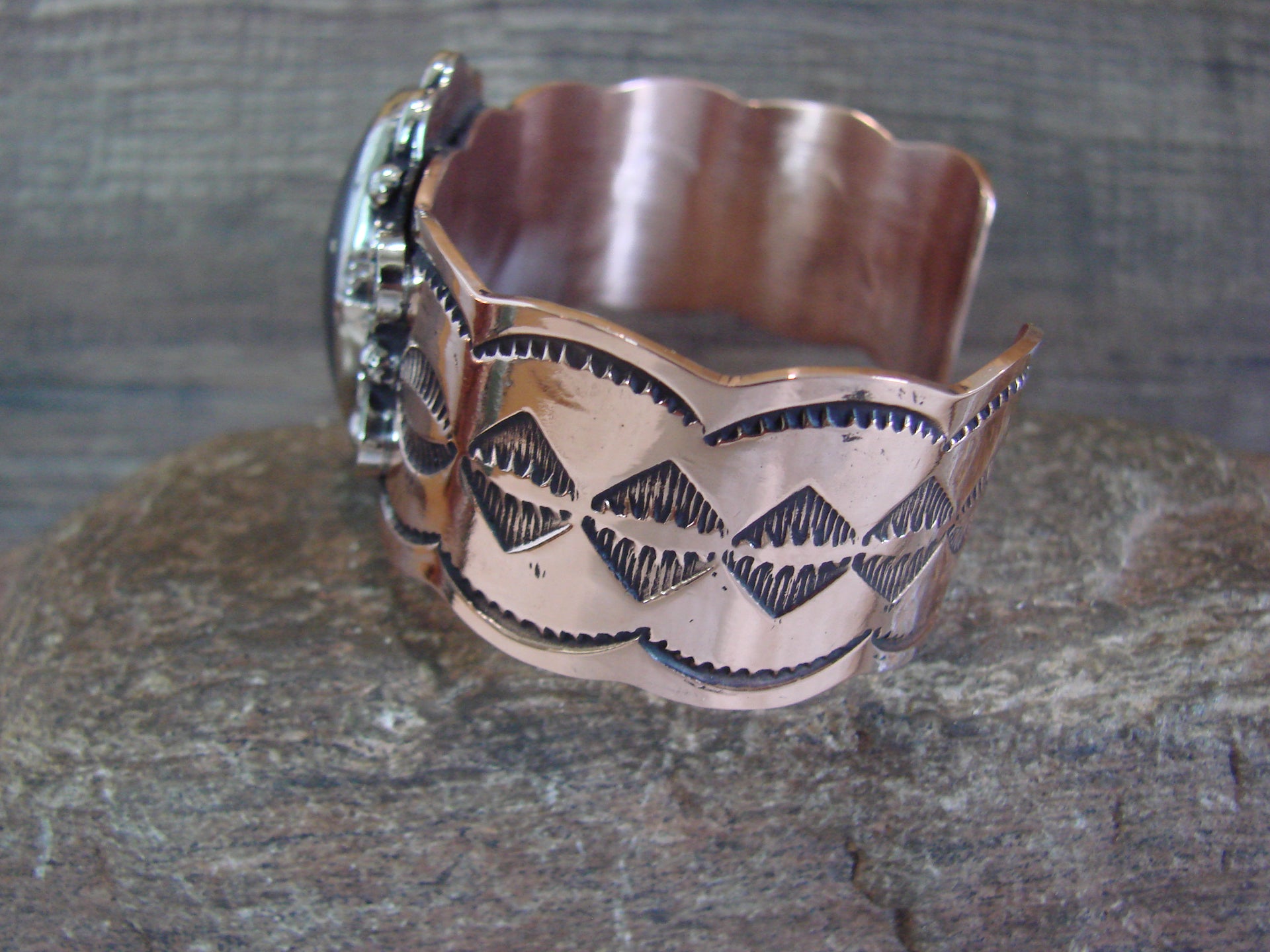 Native American Navajo Indian Handmade Copper & Hematite Bracelet from Western New Mexico. This bracelet features a Hematite stone set into a smooth Nickel Silver bezel setting. The stone is nicely polished and surrounded by traditional Navajo style design work in Copper. Navajo Indian handmade by well-known Silversmith Jackie Cleveland. Signed "JC" on the back. Free Shipping with a gift box included!