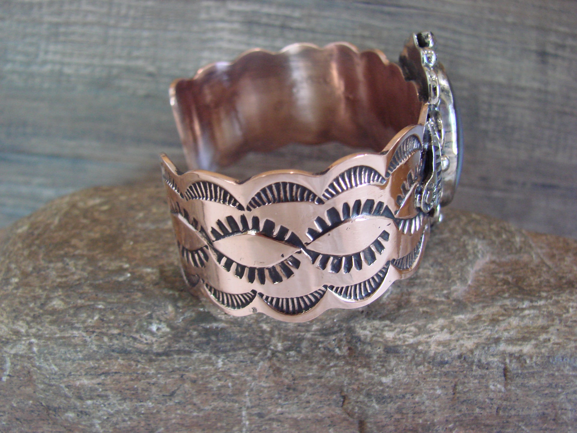 Native American Navajo Indian Handmade Copper & Hematite Bracelet from Western New Mexico. This bracelet features a Hematite stone set into a smooth Nickel Silver bezel setting. The stone is nicely polished and surrounded by traditional Navajo style design work in Copper. Navajo Indian handmade by well-known Silversmith Jackie Cleveland. Signed "JC" on the back. Free Shipping with a gift box included!