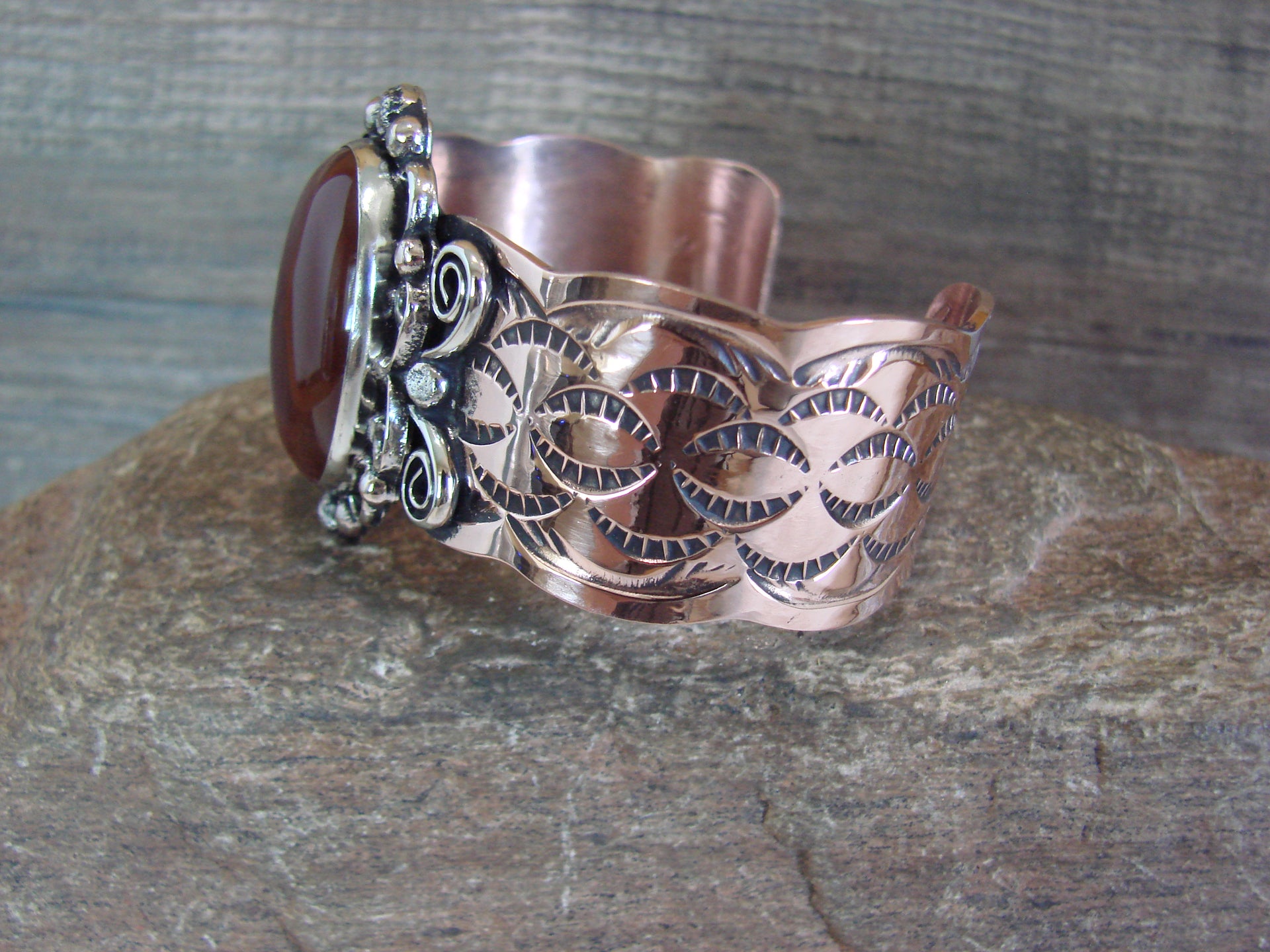 Native American Navajo Indian Handmade Copper & Red Howlite Bracelet from Western New Mexico. This bracelet features a Red Howlite stone set into a smooth Nickel Silver bezel setting. The stone is nicely polished and surrounded by traditional Navajo style design work in Copper. Navajo Indian handmade by well-known Silversmith Jackie Cleveland. Signed "JC" on the back. Free Shipping with a gift box included!