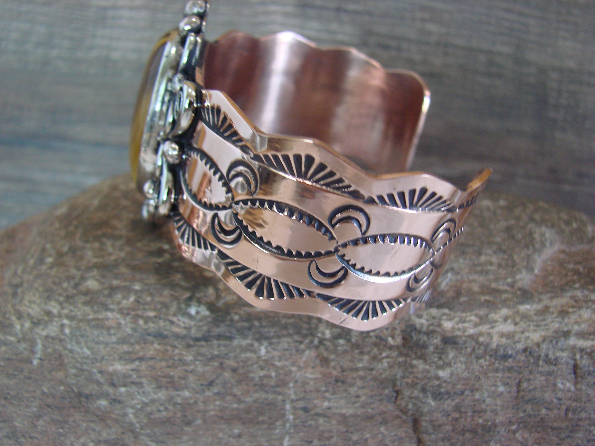 Native American Navajo Indian Handmade Copper & Tiger Eye Bracelet from Western New Mexico. This bracelet features a Tiger Eye stone set into a smooth Nickel Silver bezel setting. The stone is nicely polished and surrounded by traditional Navajo style design work in Copper. Navajo Indian handmade by well-known Silversmith Jackie Cleveland. Signed "JC" on the back. Free Shipping with a gift box included!