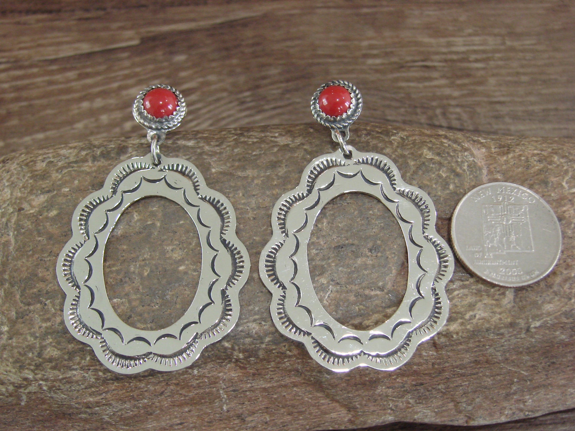 Navajo Indian Nickel Silver & Coral Dangle Post Earrings - Cleveland