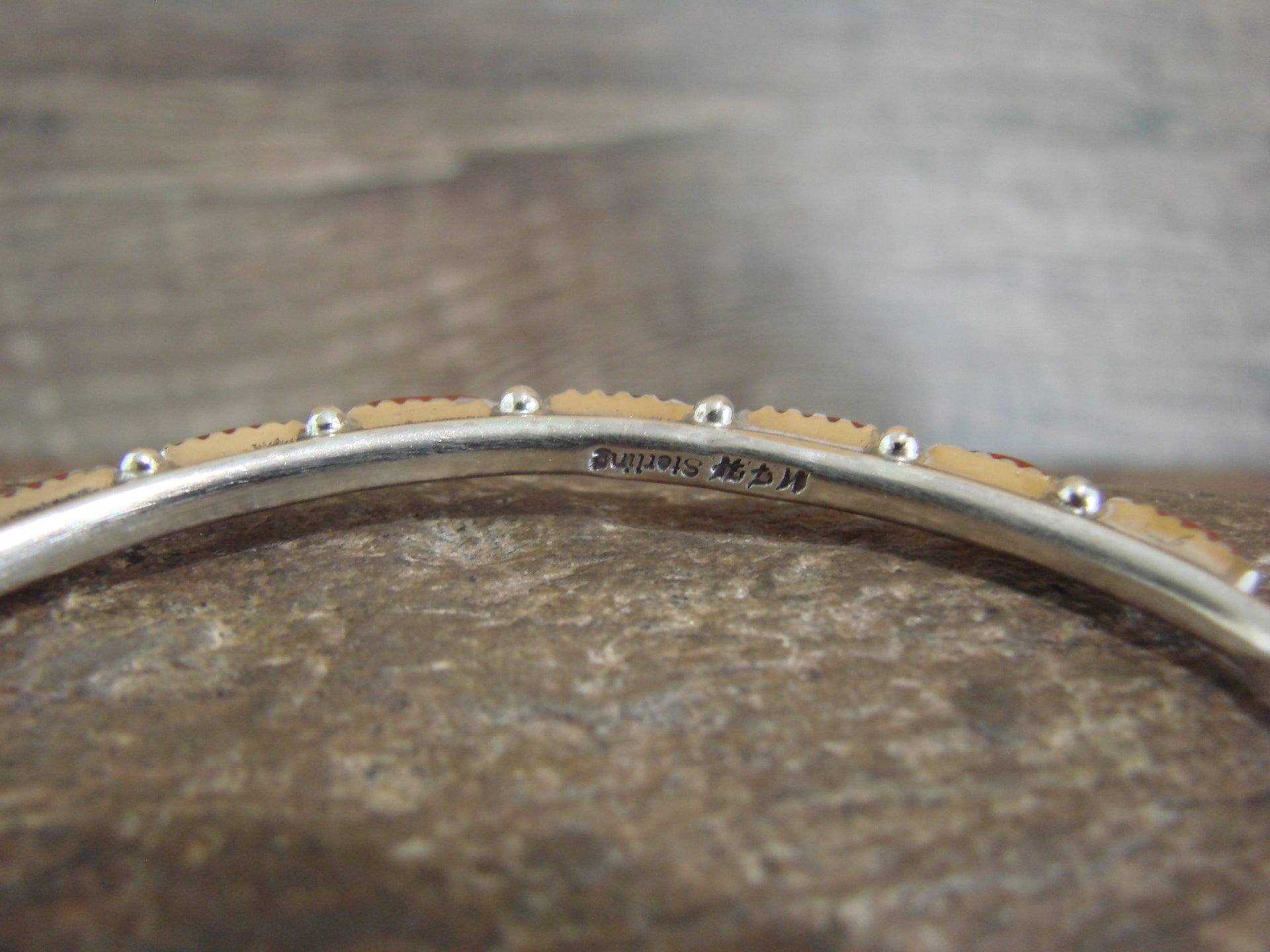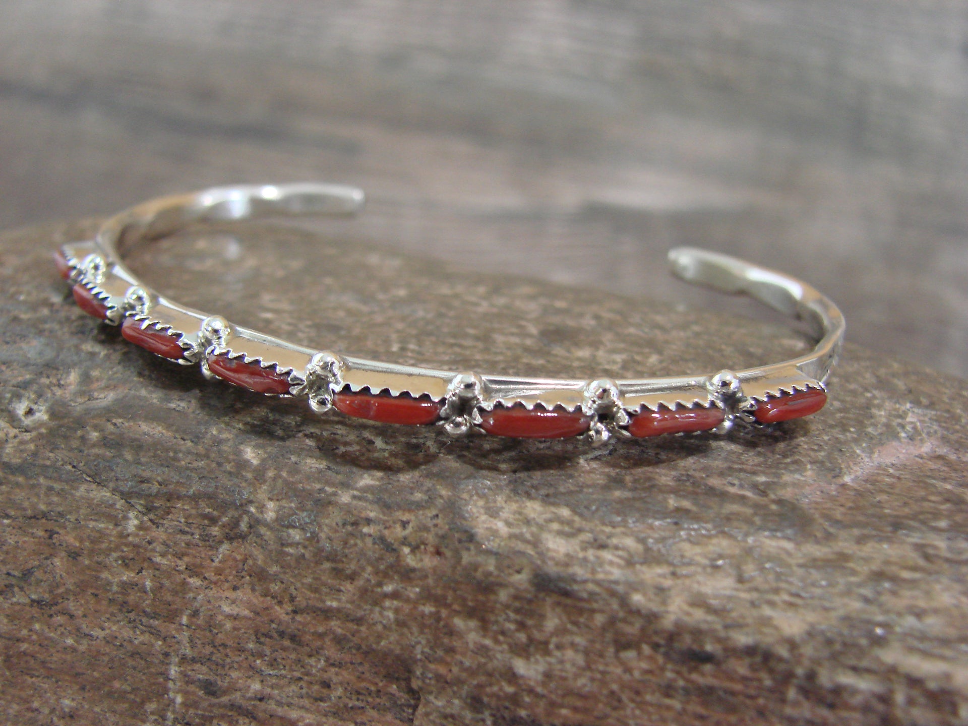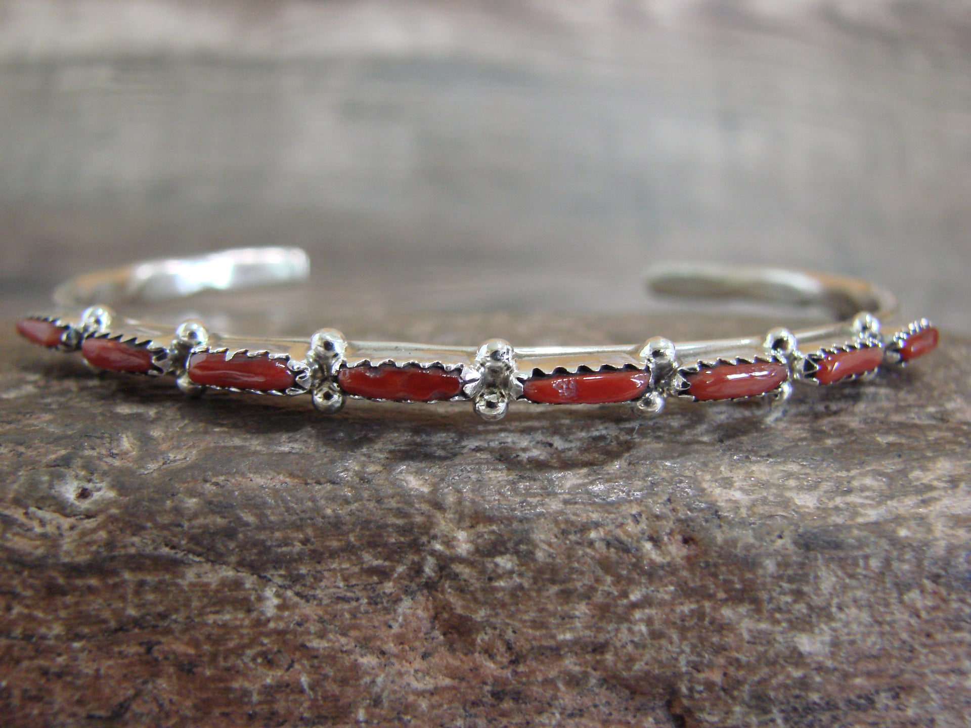 Genuine Native American Zuni Indian Coral Row Sterling Silver Bracelet from Western New Mexico. This Stunning bracelet features 8 Beautiful Coral stones intricately set into Crown Sterling Silver bezel settings. Beautiful details in Sterling Silver surround the stones. Fine Navajo Silversmith workmanship quality makes this bracelet a beautiful hand made masterpiece! Zuni Indian handmade by Murray Hannaweeka. Signed and Stamped Sterling on the inner band. Free gift box and shipping included!