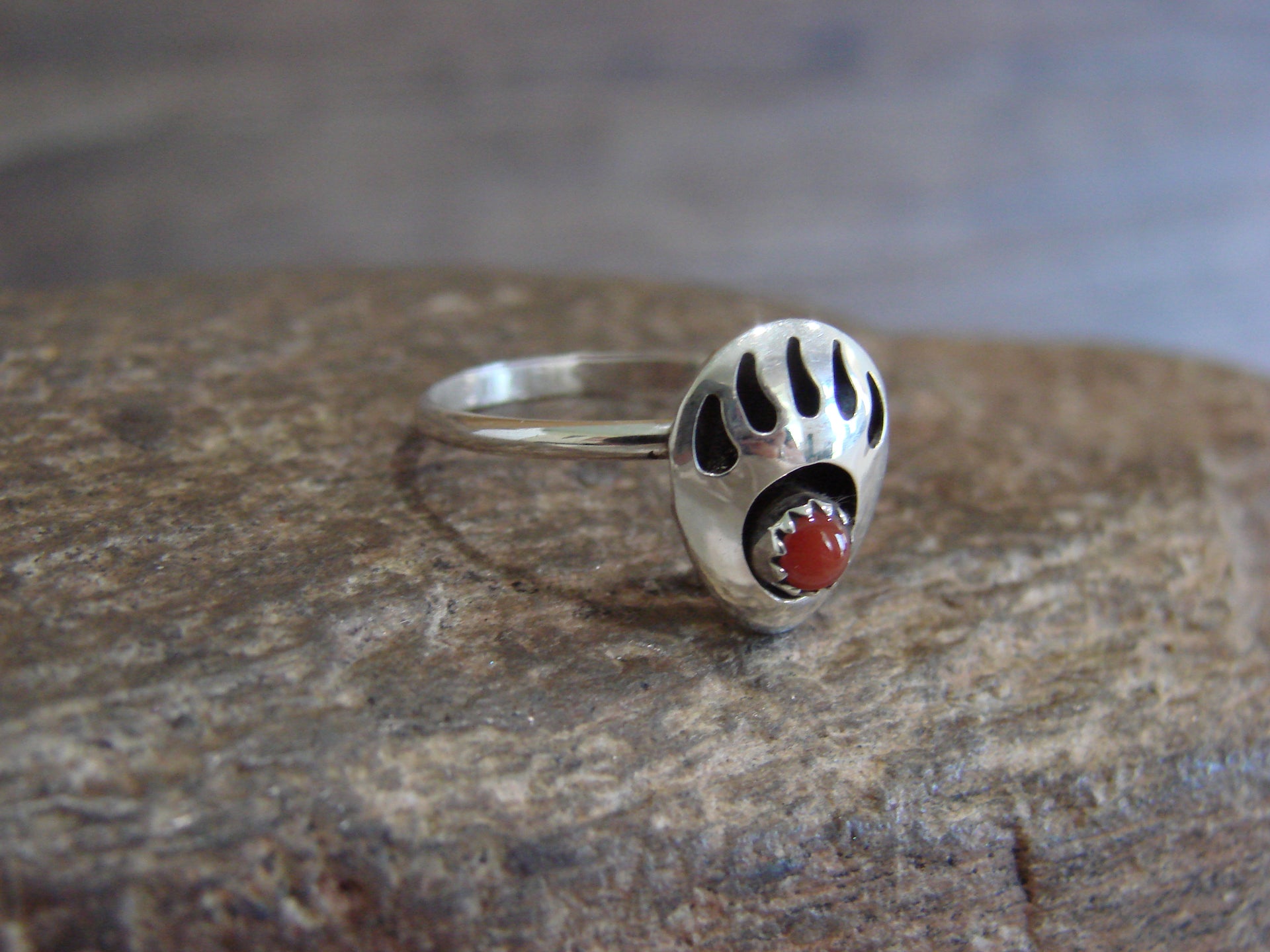 Native American Navajo Indian Turquoise Bear Paw Ring from Western New Mexico. This ring features a Coral stone set into a beautiful shadow box sterling silver bear paw setting. This is a beautiful ring! Navajo Indian hand made by Navajo silversmith Leta Parker. Stamped "Sterling" on the inner band. Free gift box and shipping included!