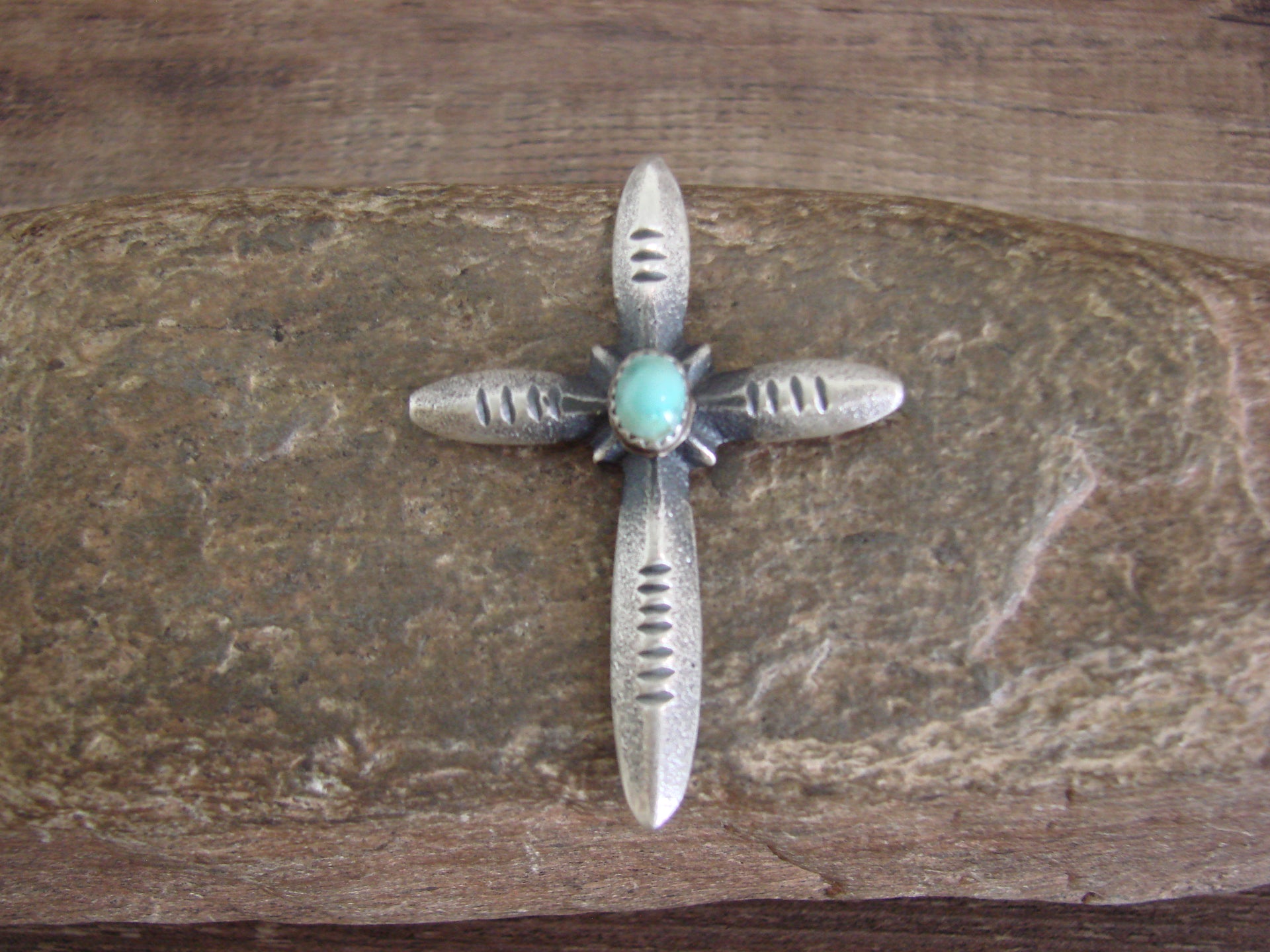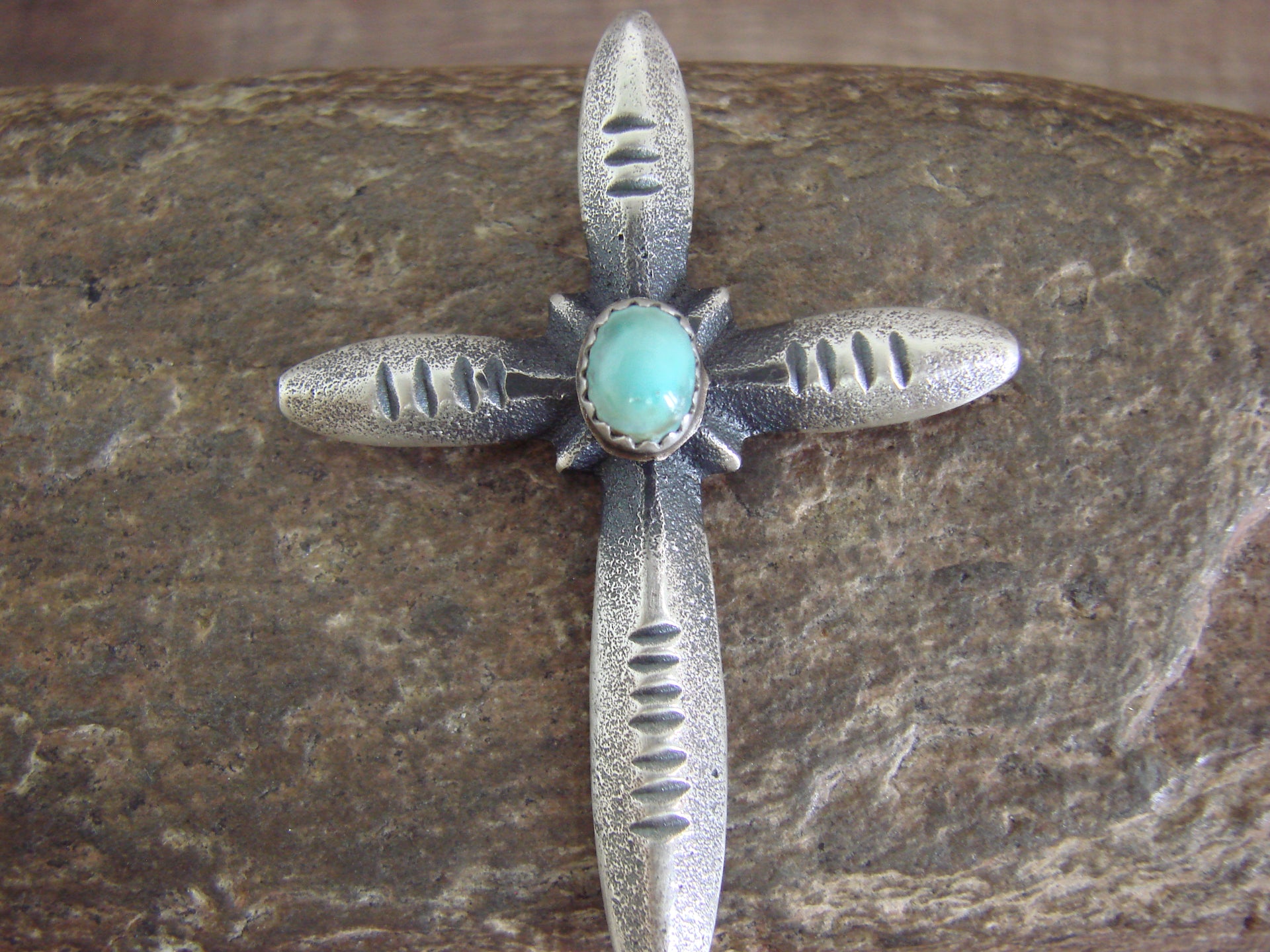 Genuine Native American Navajo Indian Silver & Turquoise Cross Pendant from Western New Mexico. This Cross Pendant features beautifully Cast Sterling Silver and Hand Stamping throughout. The Turquoise stone is set into a Crown Sterling Silver bezel setting at center. This pendant is Stunning! Hand made by Navajo Silversmith Martha Cayatineto. Signed "MC" and stamped "Sterling" on the back. Free Shipping with a gift box included!