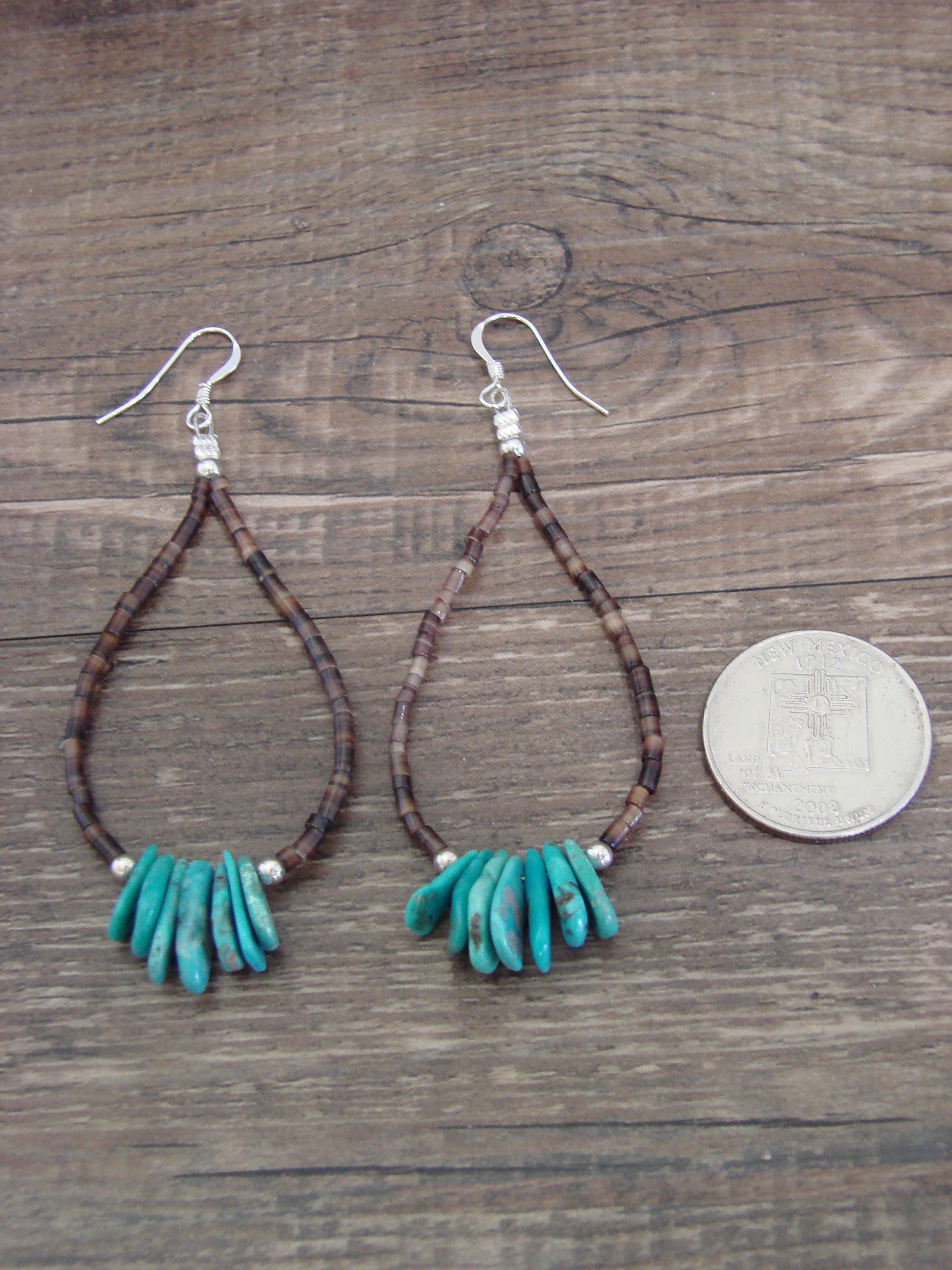 Genuine Native American Navajo Indian Sterling Silver & Turquoise Hand Beaded Dangle Earrings from Western New Mexico. These loop style dangle earrings feature beautiful, Genuine Turquoise Stones. The Stones are hand strung and have a great look! Free shipping and gift box included! Hand strung by Navajo Indian artist Doreen Jake.