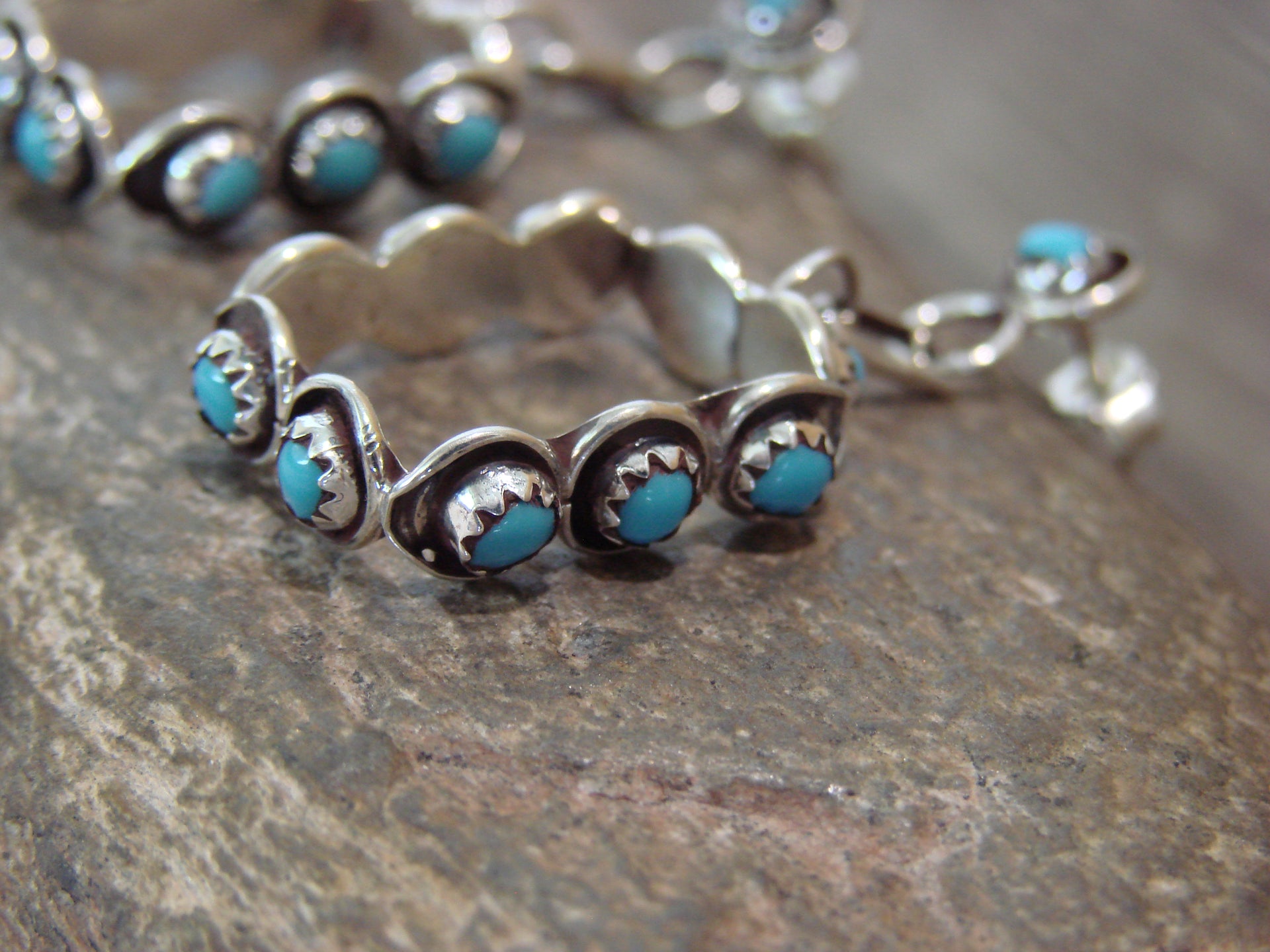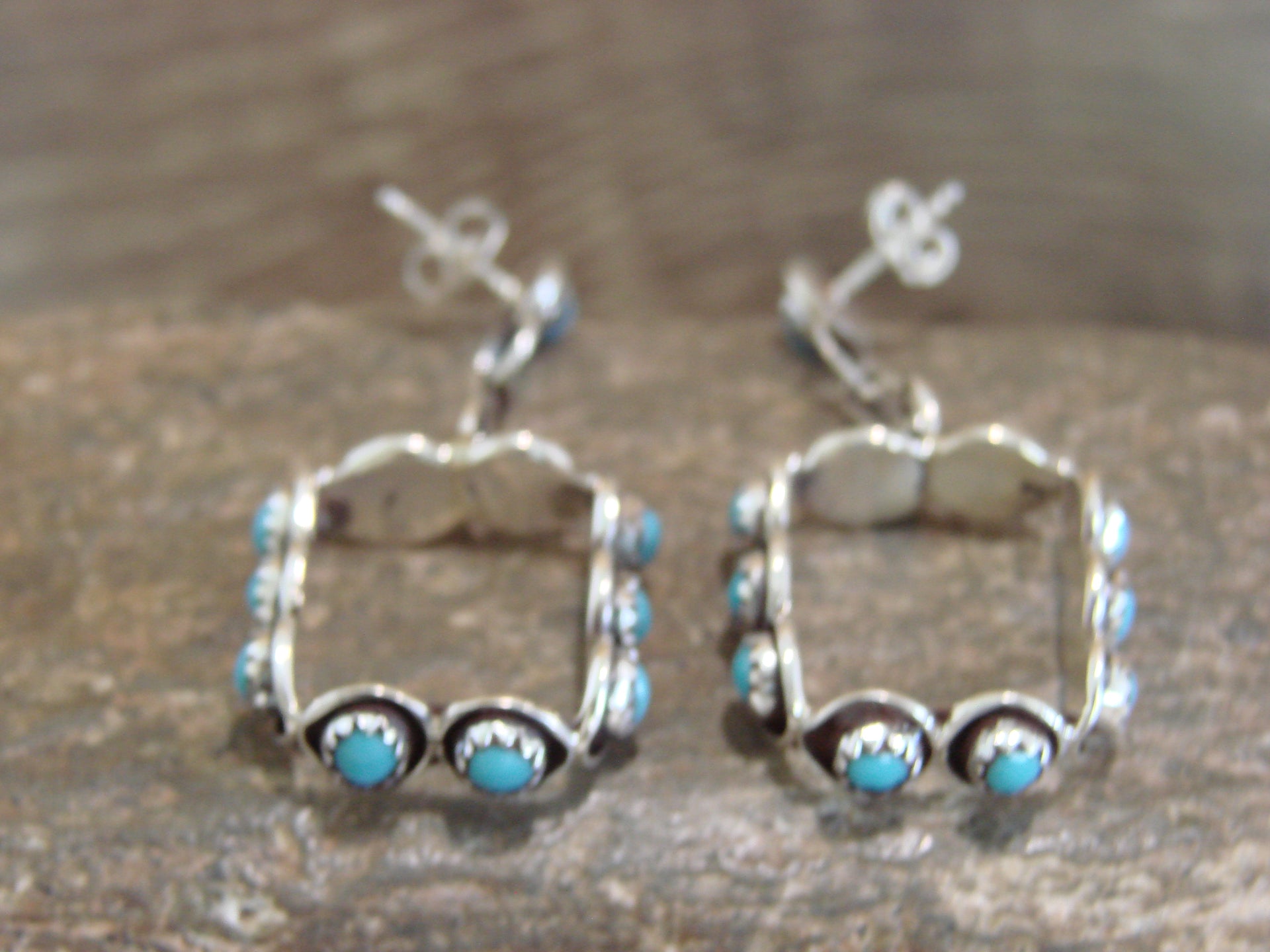 Native American Zuni Indian Sterling Silver & Turquoise Earrings from Western New Mexico. These Stunning Post Dangle style earrings feature 11 Turquoise each. Each stone is beautifully set into a crown sterling silver bezel shadowbox setting. This is a very nice pair of earrings! Zuni Indian handmade by Florenda Lonasee. Unsigned. Free Shipping with a gift box included!