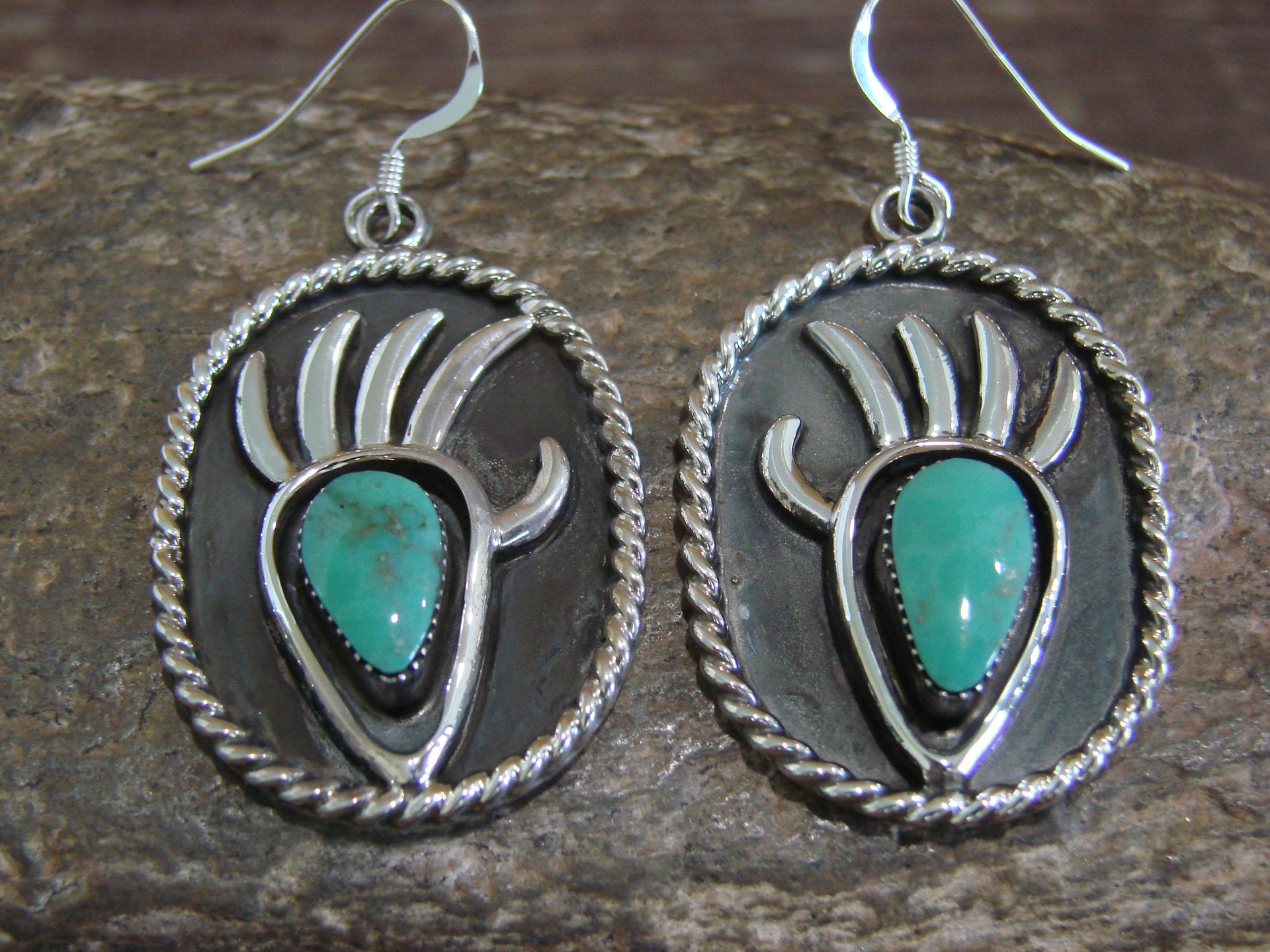 Native American Navajo Indian Sterling Silver Turquoise Bear Paw Dangle Earrings - Belin