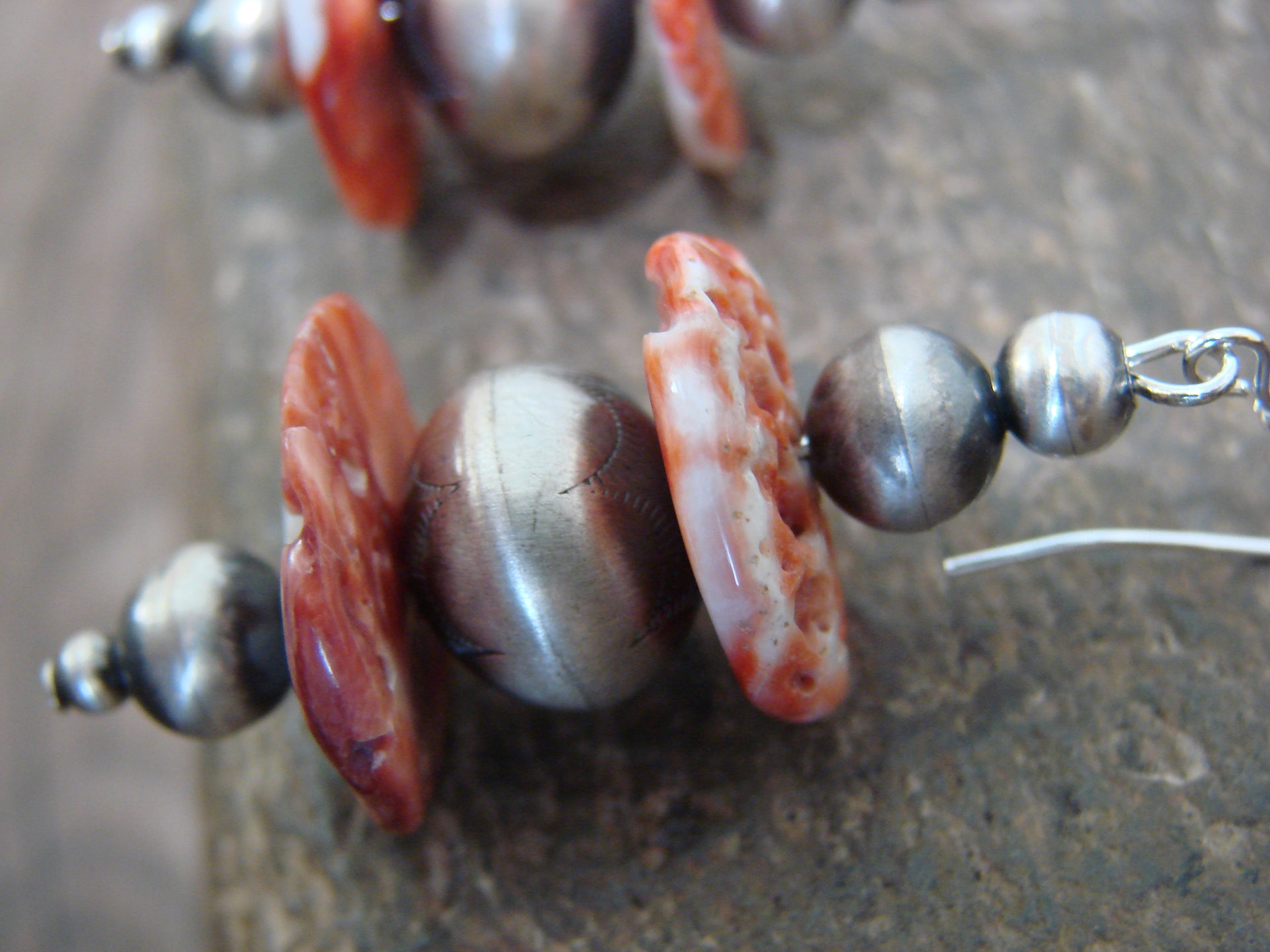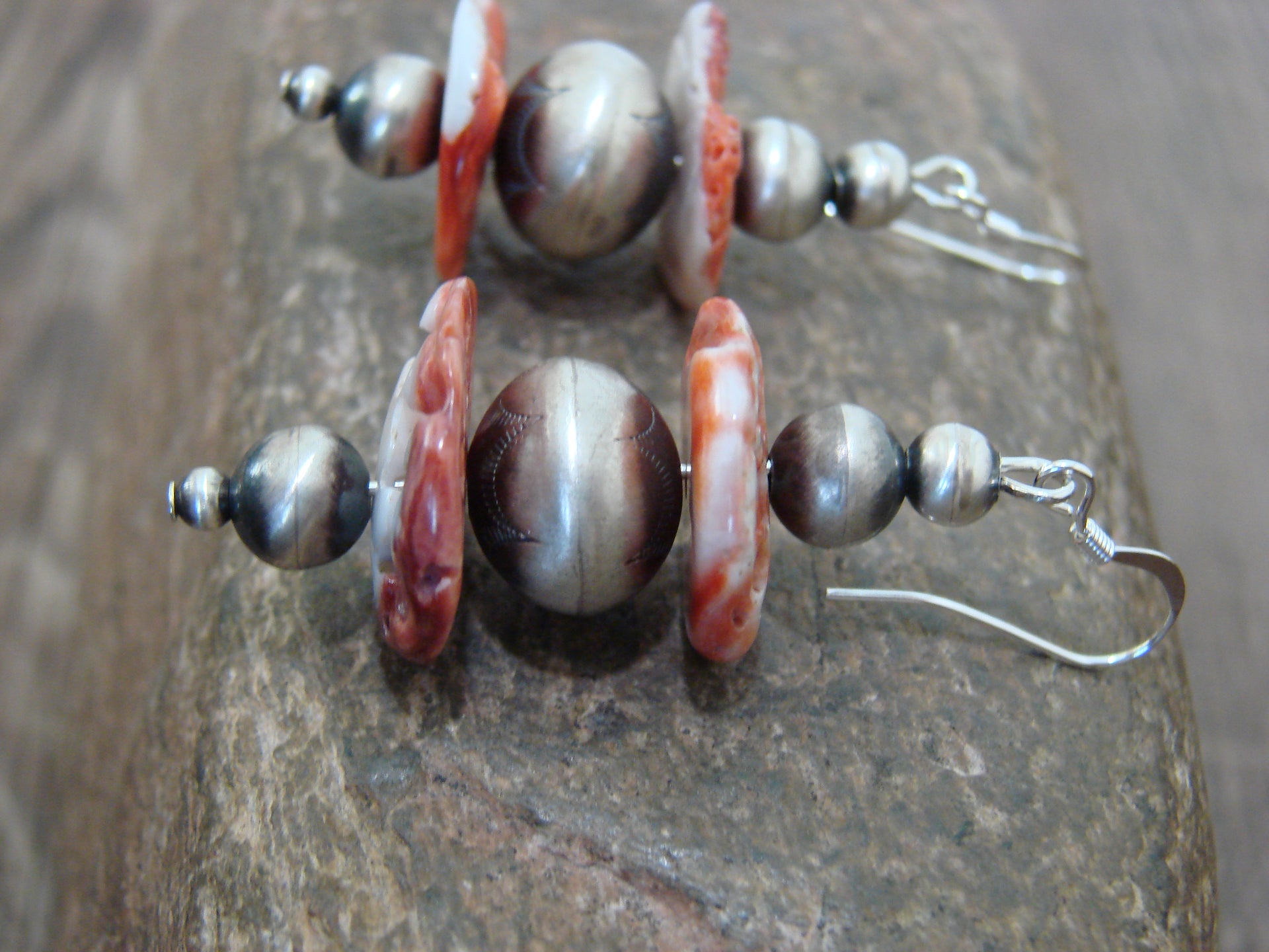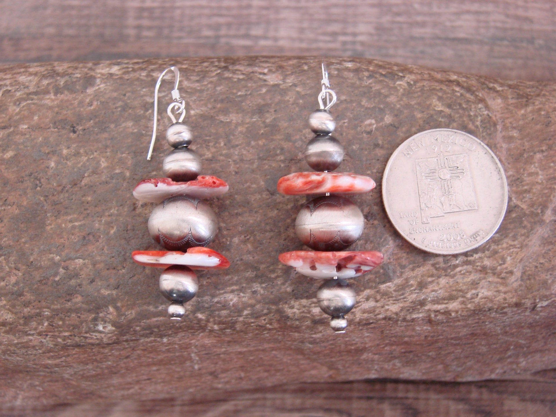 Genuine Native American Navajo Indian Sterling Silver Spiny Oyster Navajo Pearl Dangle Earrings from Western New Mexico. These Stunning earrings feature beautiful Spiny Oyster Stones accented with Sterling Silver Navajo Pearls. These earrings are hand strung and Genuine! Beautifully Hand strung by Navajo artist Coreta Coriz. Free Shipping and Gift Box included!