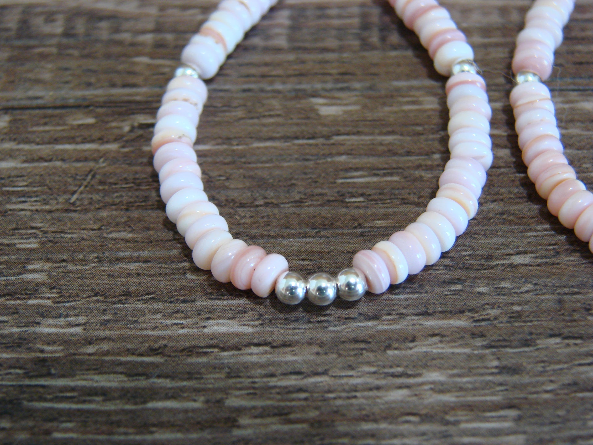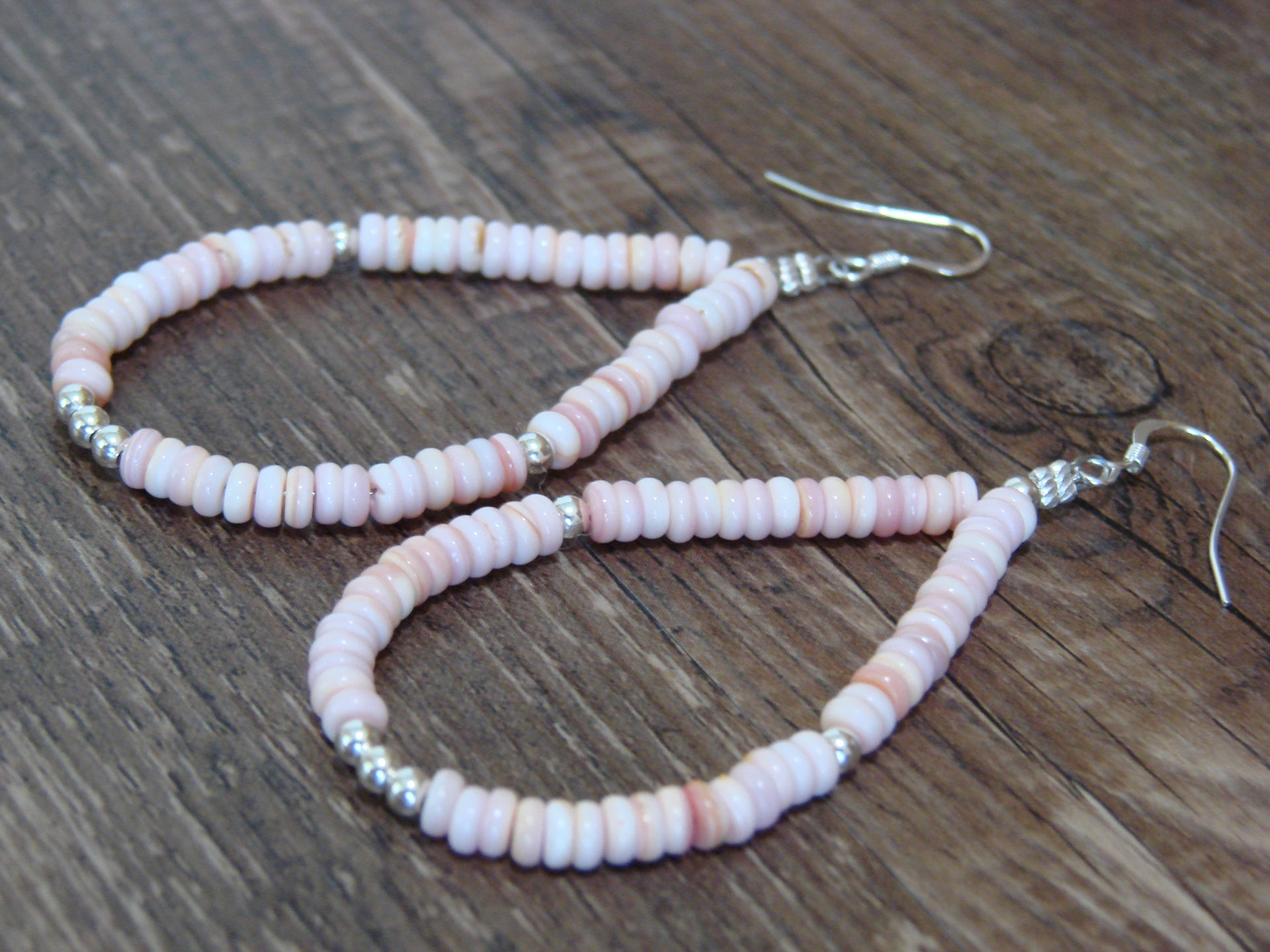 Genuine Native American Navajo Indian Hand Strung Sterling Silver Pink Conch Dangle Earrings from Western New Mexico. These earrings feature beautiful hand strung Pink Conch stones throughout. These Earrings are Genuine & Gorgeous! Check out the Matching Bracelet and Necklace also! Navajo Indian Hand Strung by Louise Joe. Unsigned. Free Shipping and Gift box included!